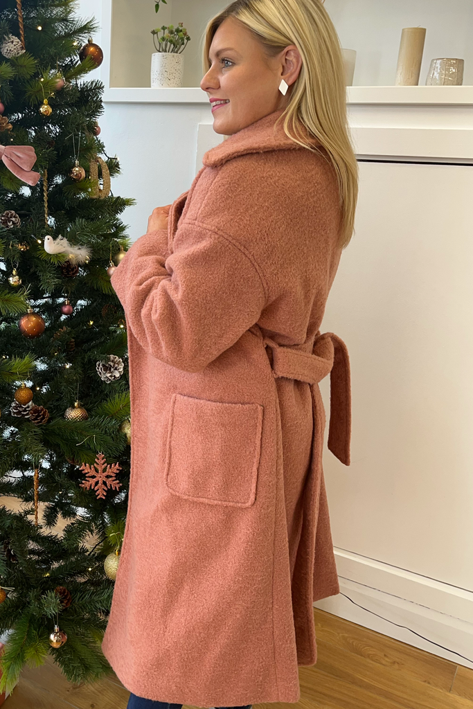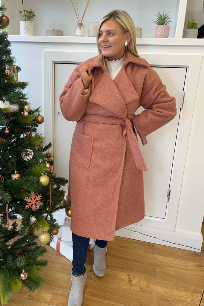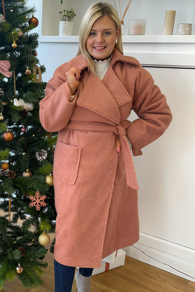Heavy-weight longer length Rose pink teddy coat with lapels, tie belt, dropped shoulder and pockets. cIt is a full wrap style for amazing comfort and warmth!