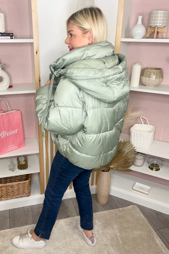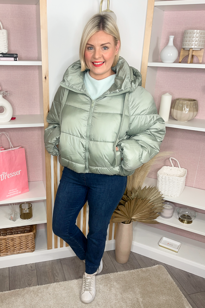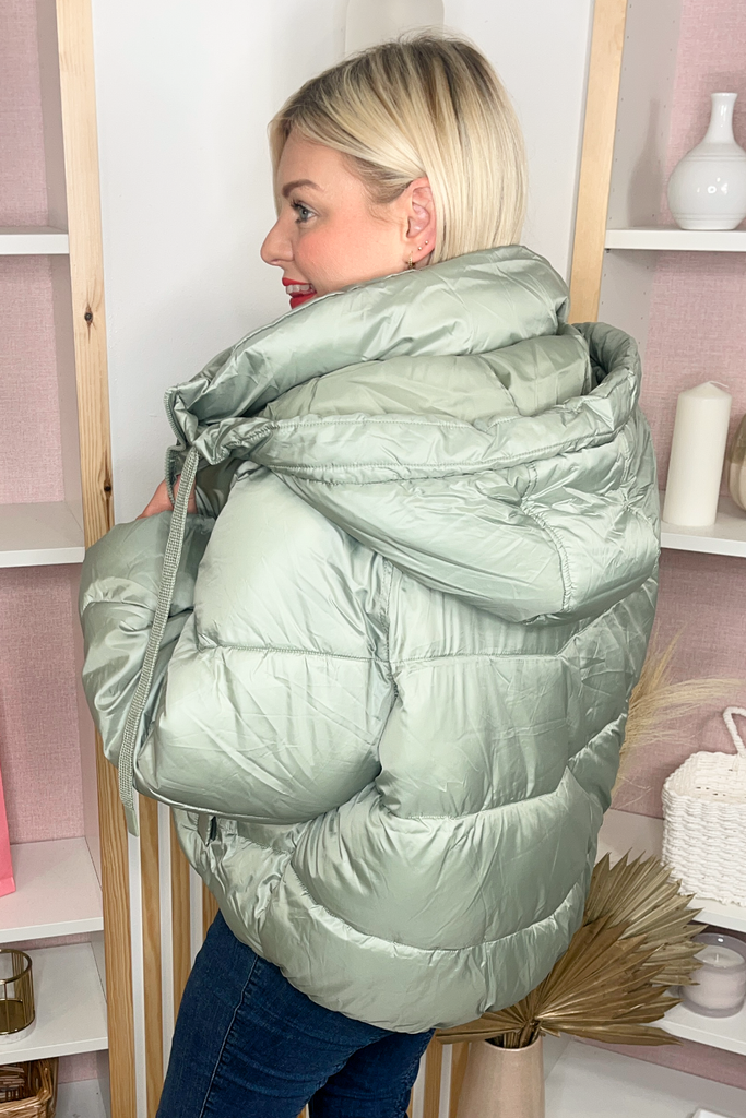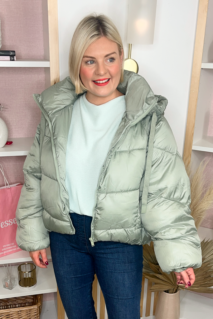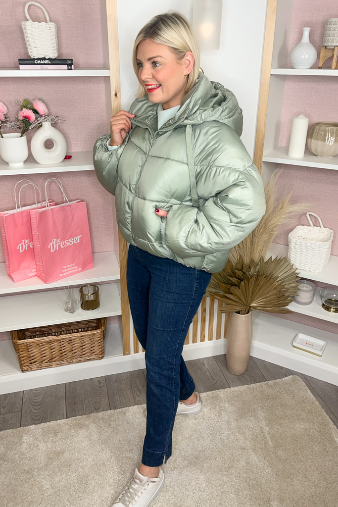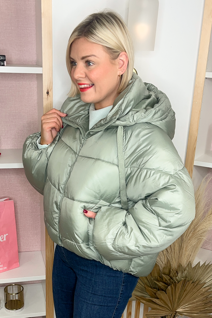 Shorter length puffer coat with zipped front, hood and side pockets. This style is fully lined
