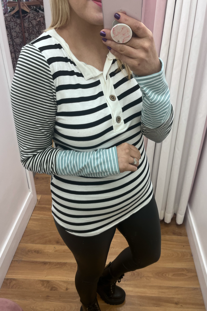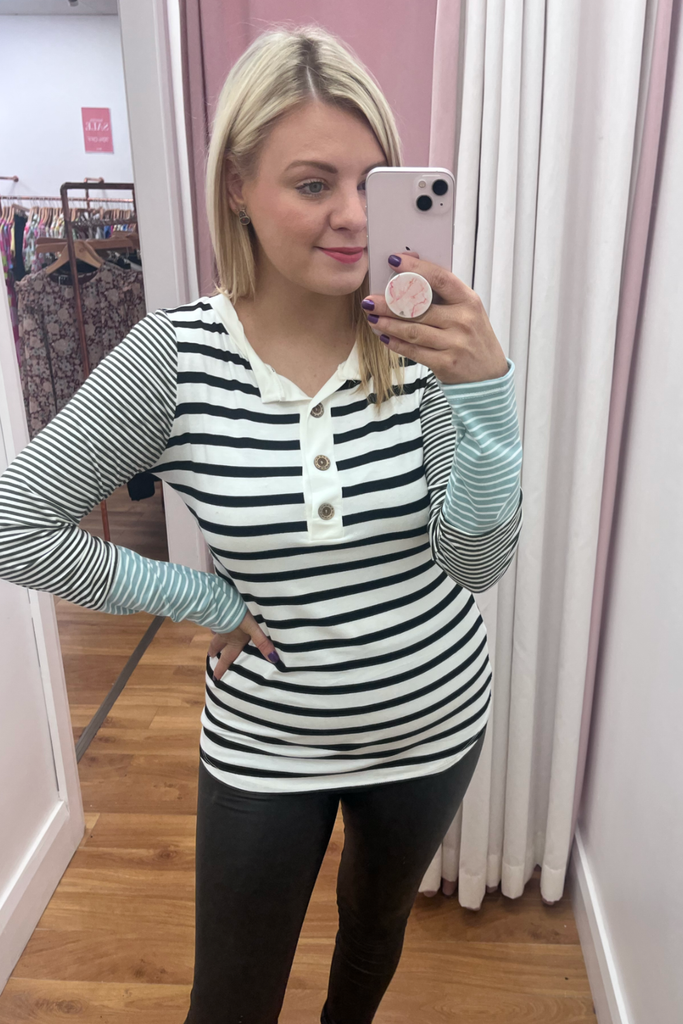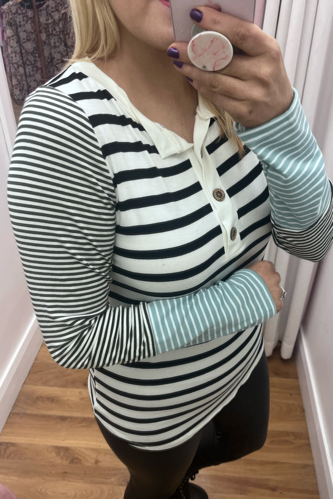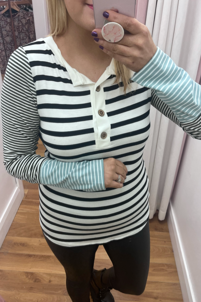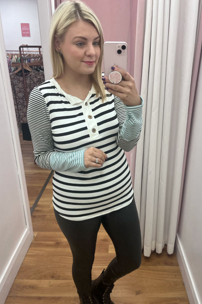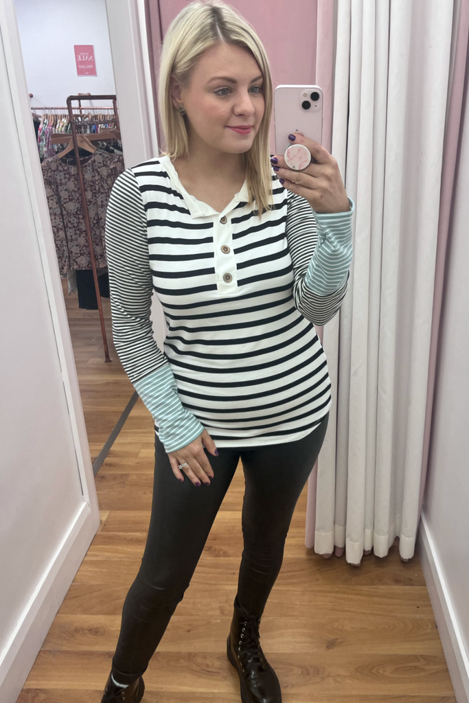 Black stripe long sleeve jersey top with sage. Features a V-neckline with faux button detailing. A great easy everyday style for jeans in the softest material.