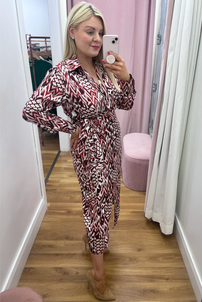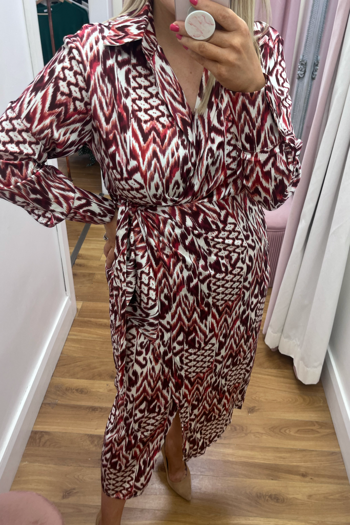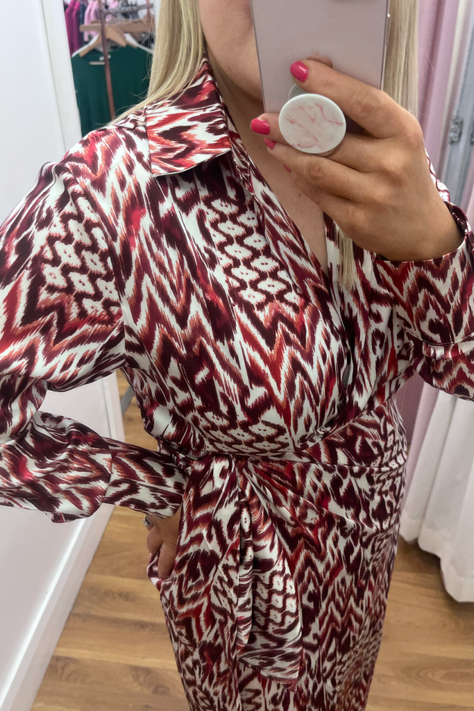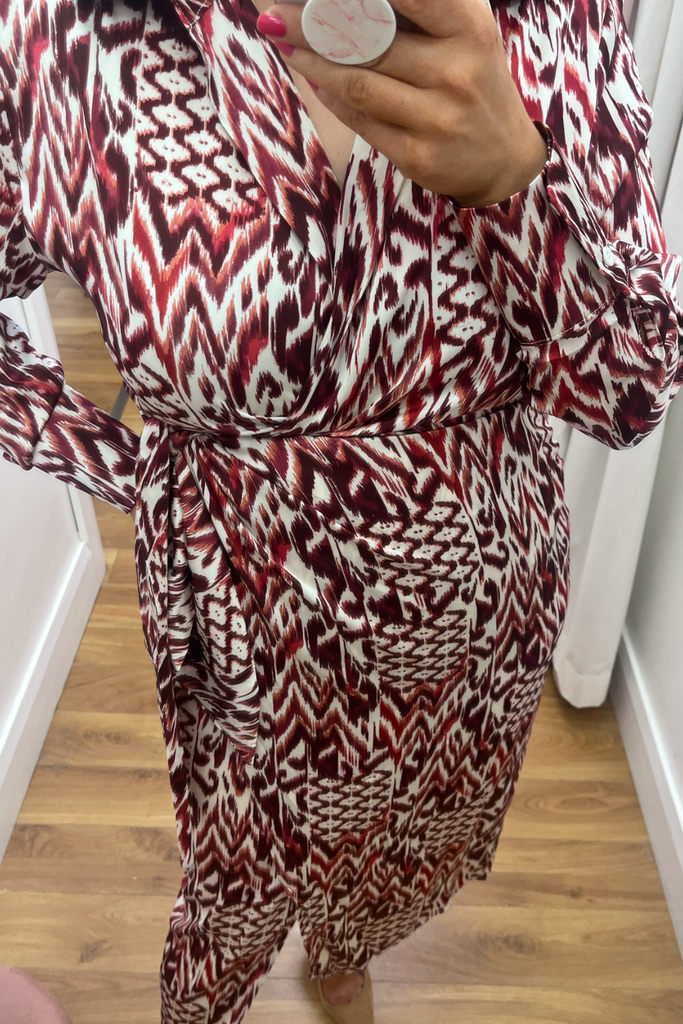 Printed in a rich mix of plums and purple on a stone coloured base. In a full wrap style with silky feel, collared neckline and full sleeves with buttoned cuff. It ties in the inside as well as outside for a gorgeous and secure shape. This dress is unlined.