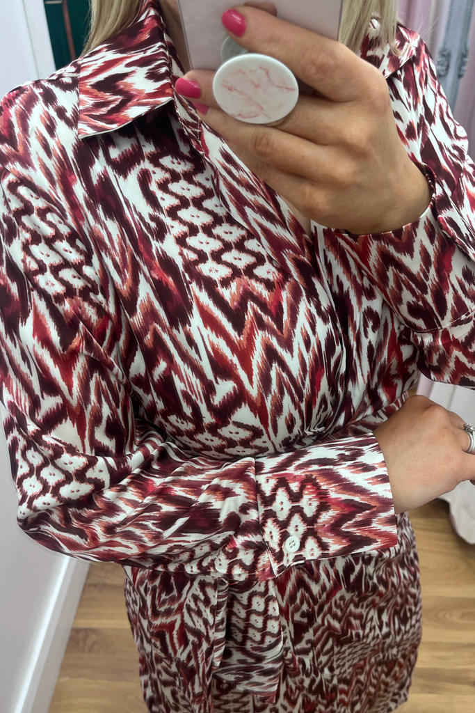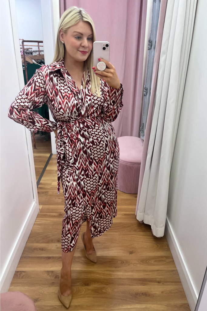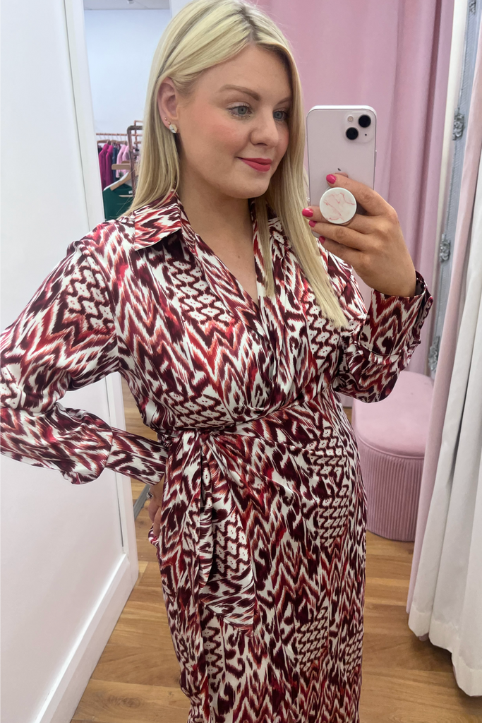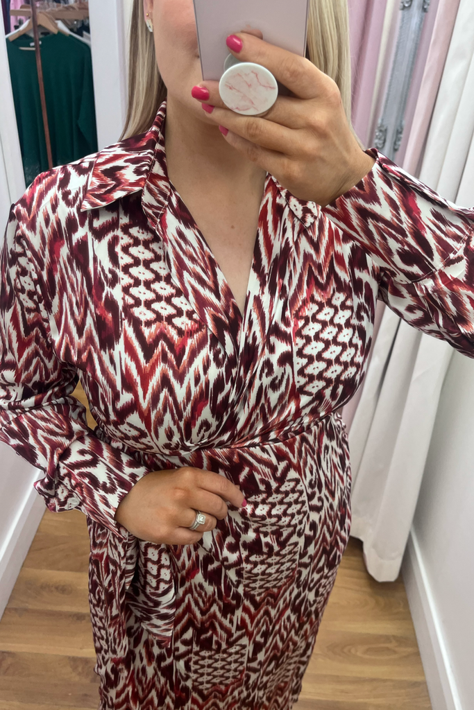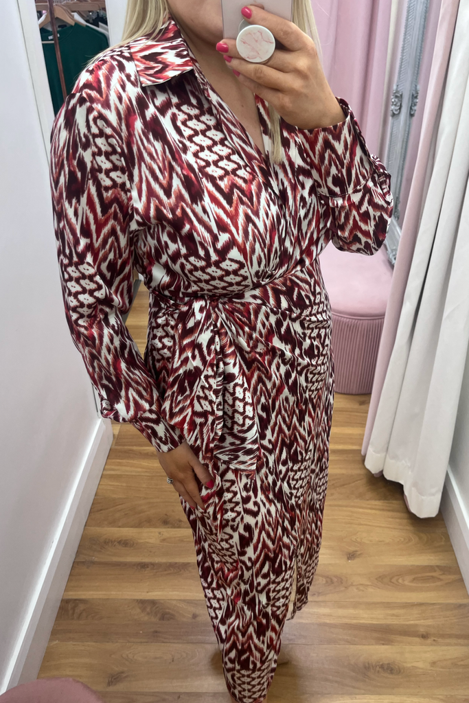 Printed in a rich mix of plums and purple on a stone coloured base. In a full wrap style with silky feel, collared neckline and full sleeves with buttoned cuff. It ties in the inside as well as outside for a gorgeous and secure shape. This dress is unlined.