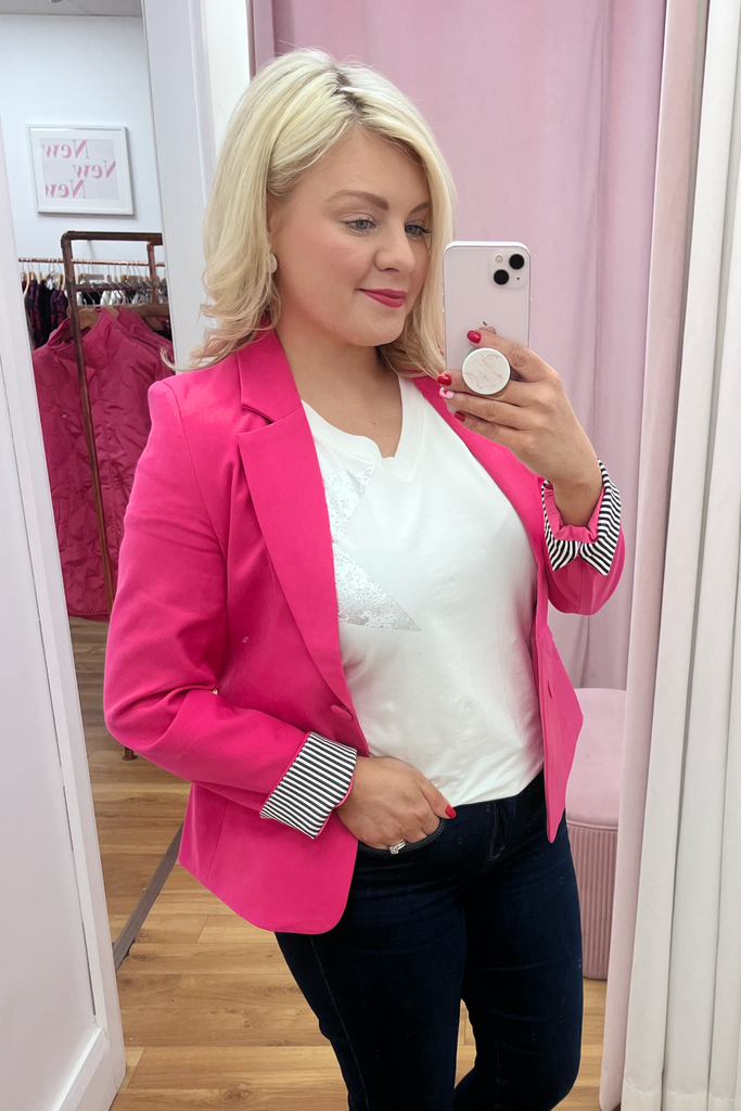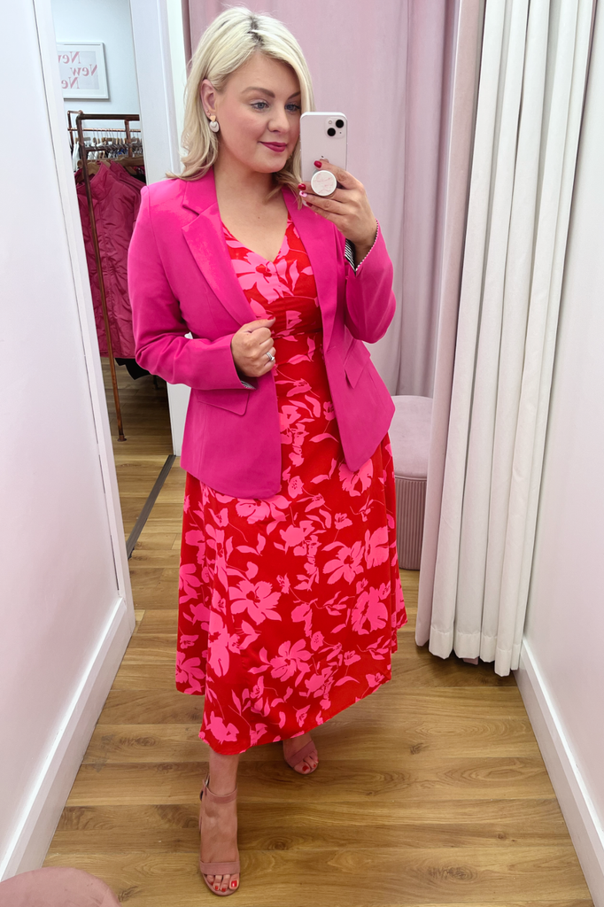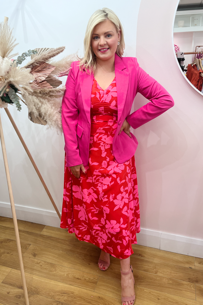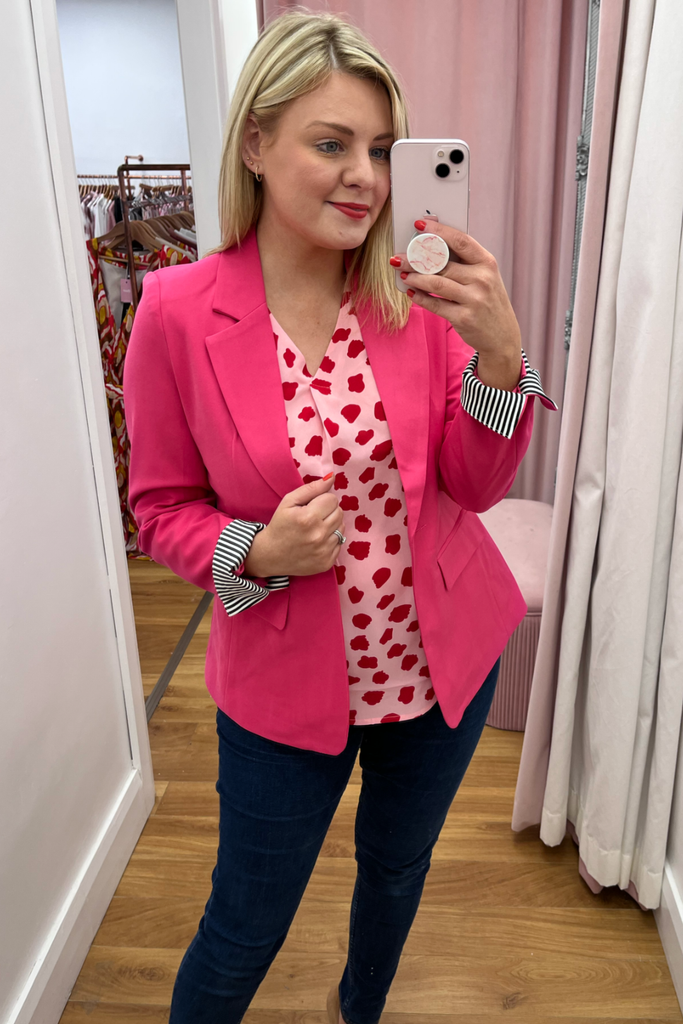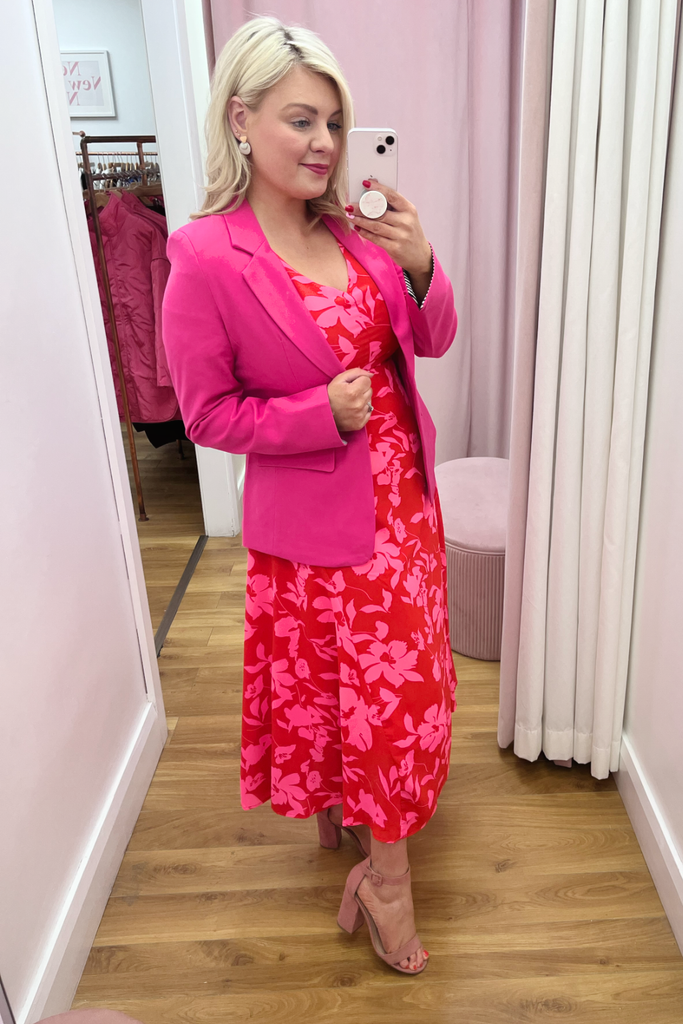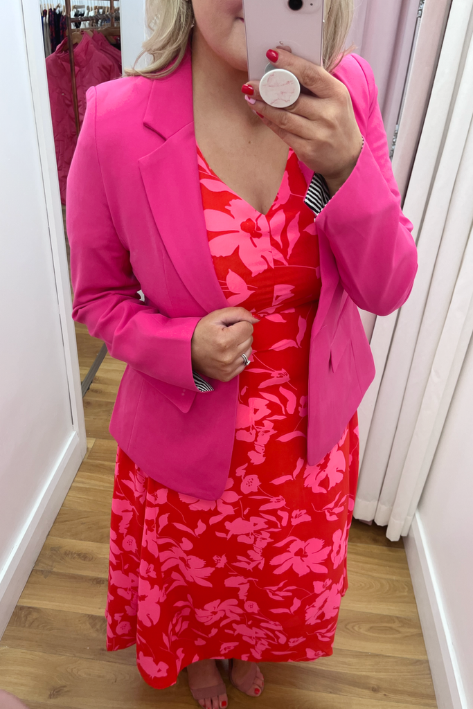 For sophisticated statement dressing, look no further than our scarlett blazer! This vibrant-pink single-breasted blazer is gently tailored in a fitted silhouette with lightly padded shoulders to accentuate your frame. For a sleek finish, we've added subtly peaked lapels, long sleeves and two flapped welt pockets. Also has a fun contrasting lining.