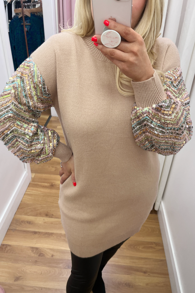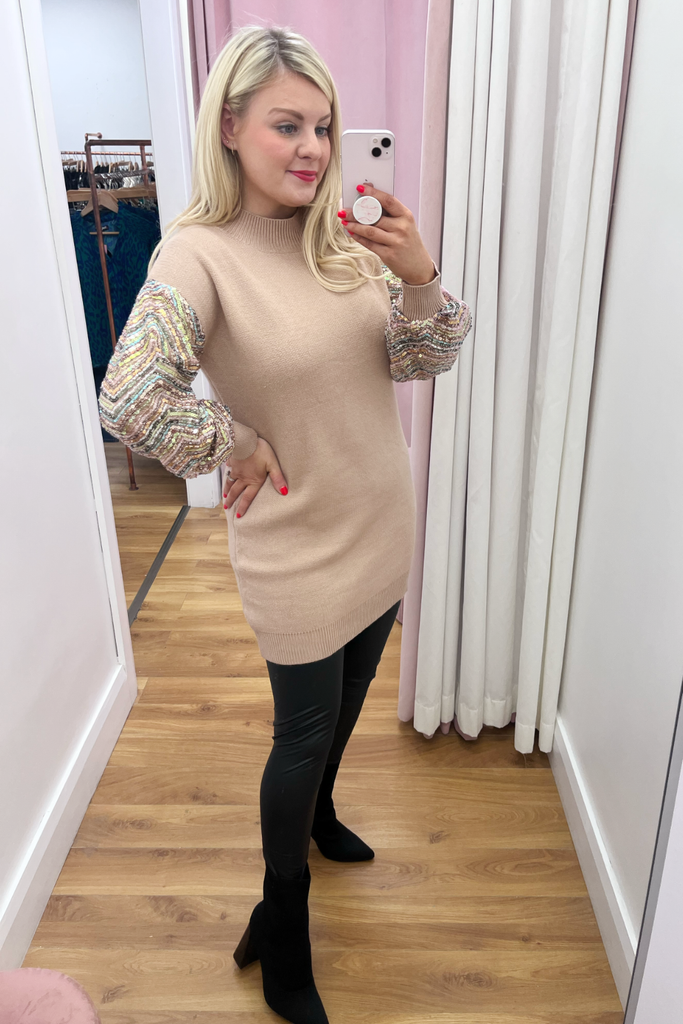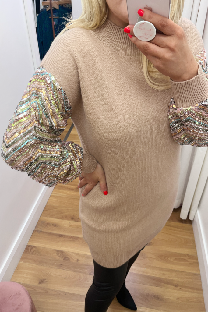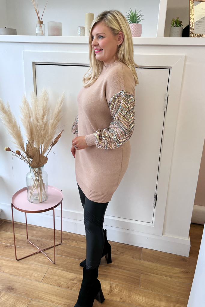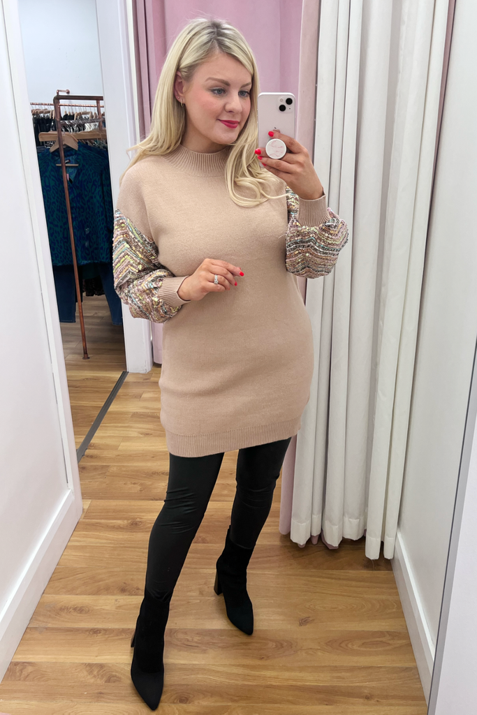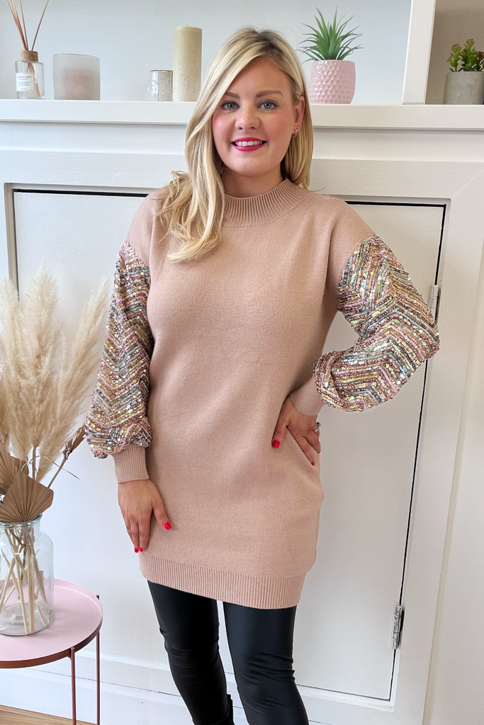 Super soft, quilted feel jumper dress with round neck. Features contrasting full balloon sleeve with a sequin finish and banded material cuff. Style it with tights, over leggings or bare legs!