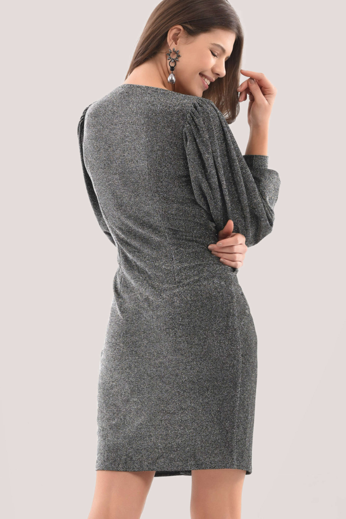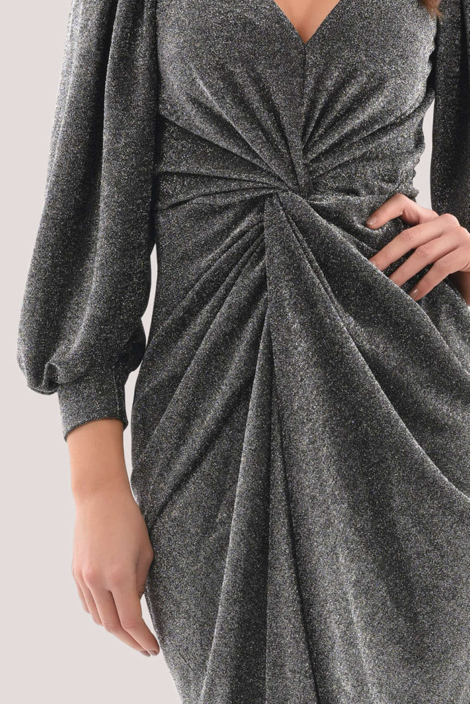 Stand out from the crowd in our silver twist front midi dress! Featuring full length balloon sleeves with fitted cuff and flattering v-neckline. A comfortable figure hugging dress with stretch and a twisted front detail to add that extra wow factor to your look!