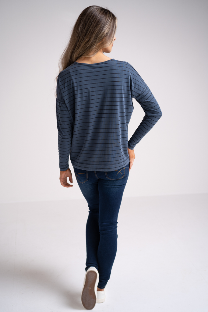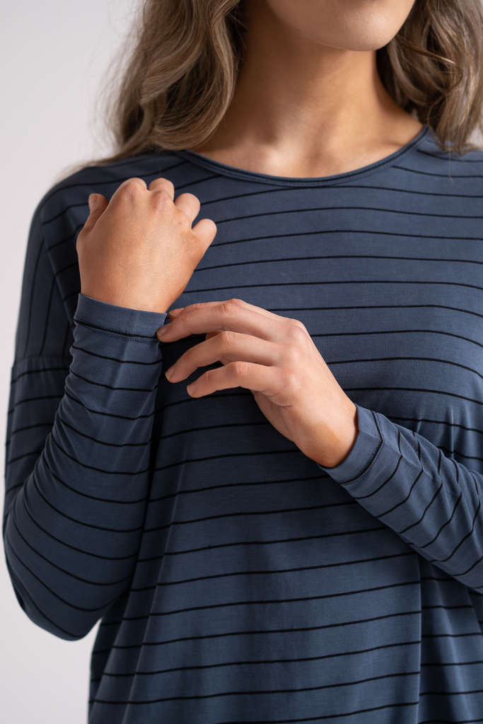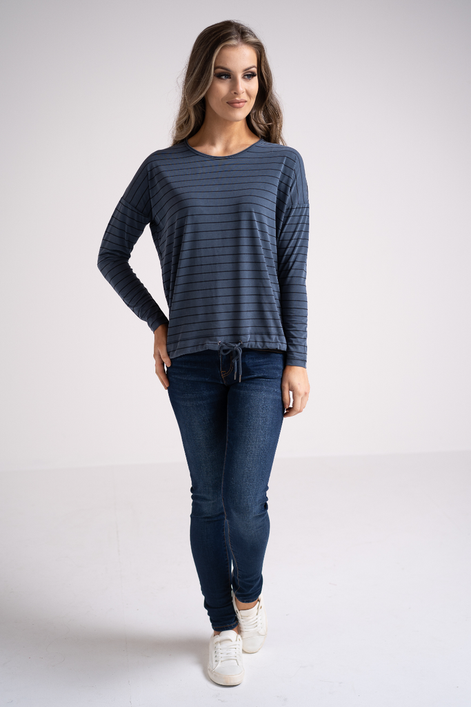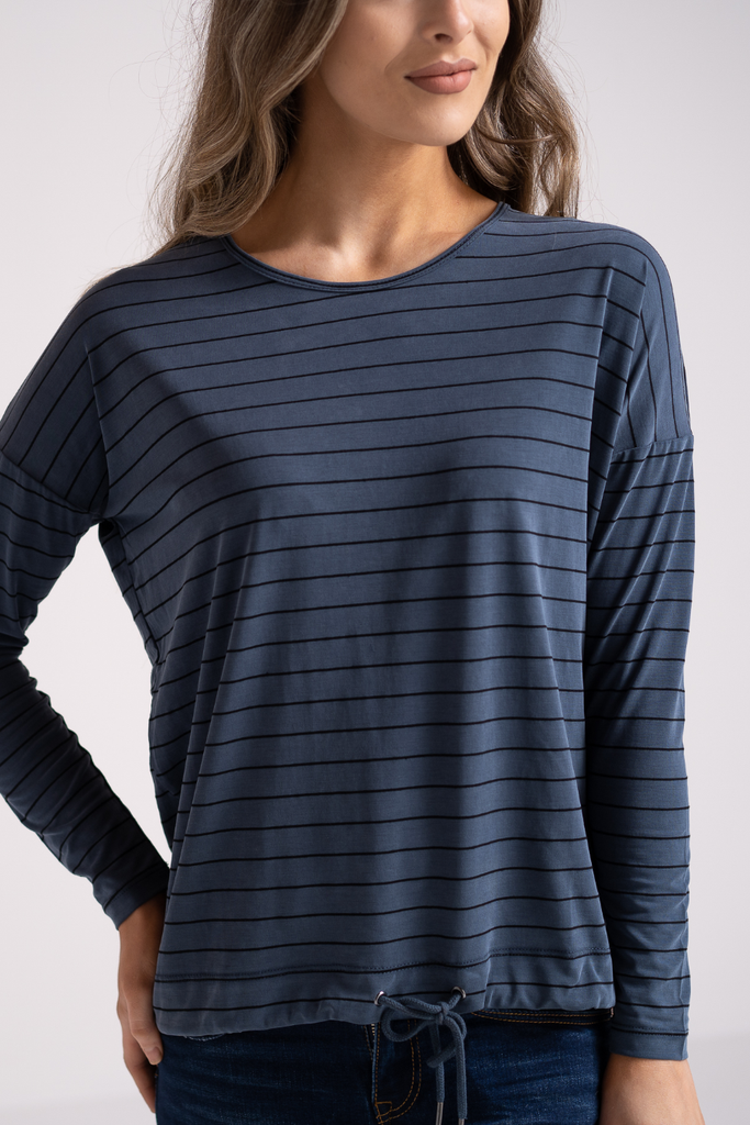 Petrol blue t-shirt featuring a black stripe print. Features a round neckline, full length sleeves and a drawstring detail on the waist.