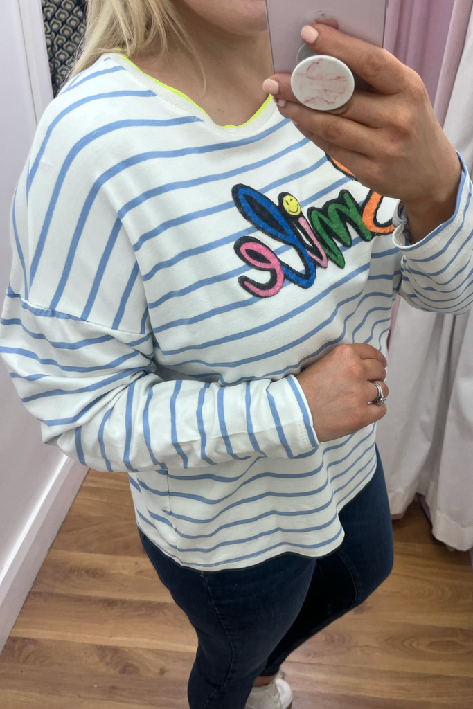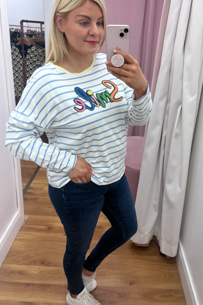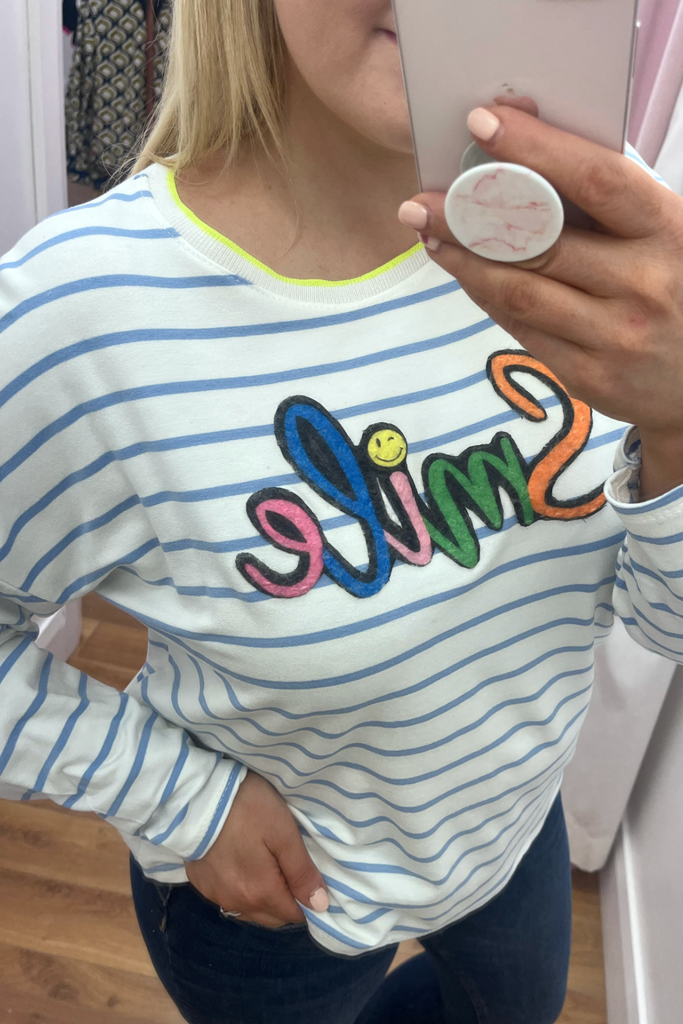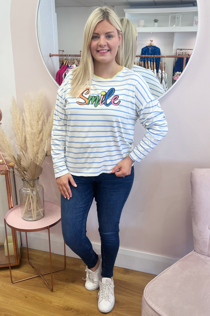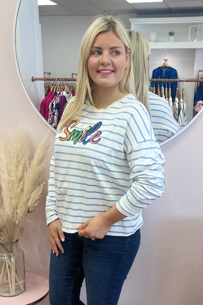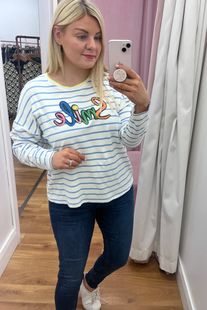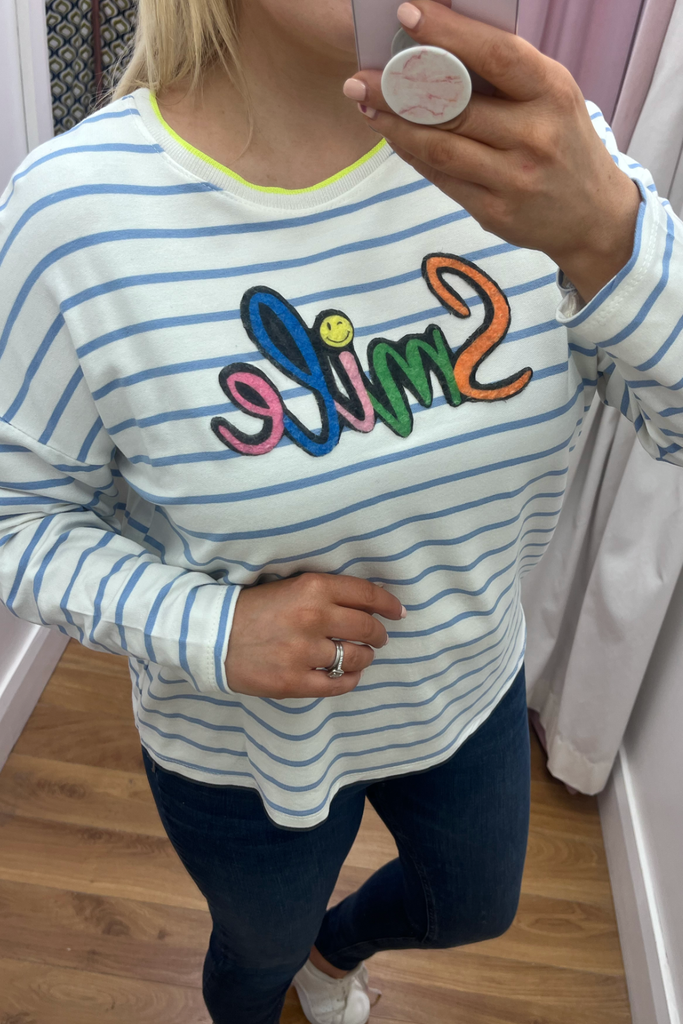 Striped round neck jersey top with textured SMILE motif and contrasting trim along the neckline. The sleeves can be worn rolled or full length, The perfect pop of colour for your casual Autumn wardrobe!