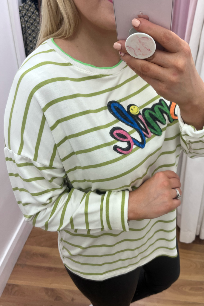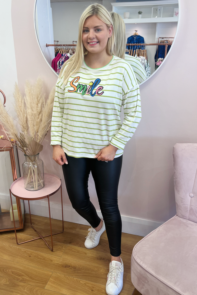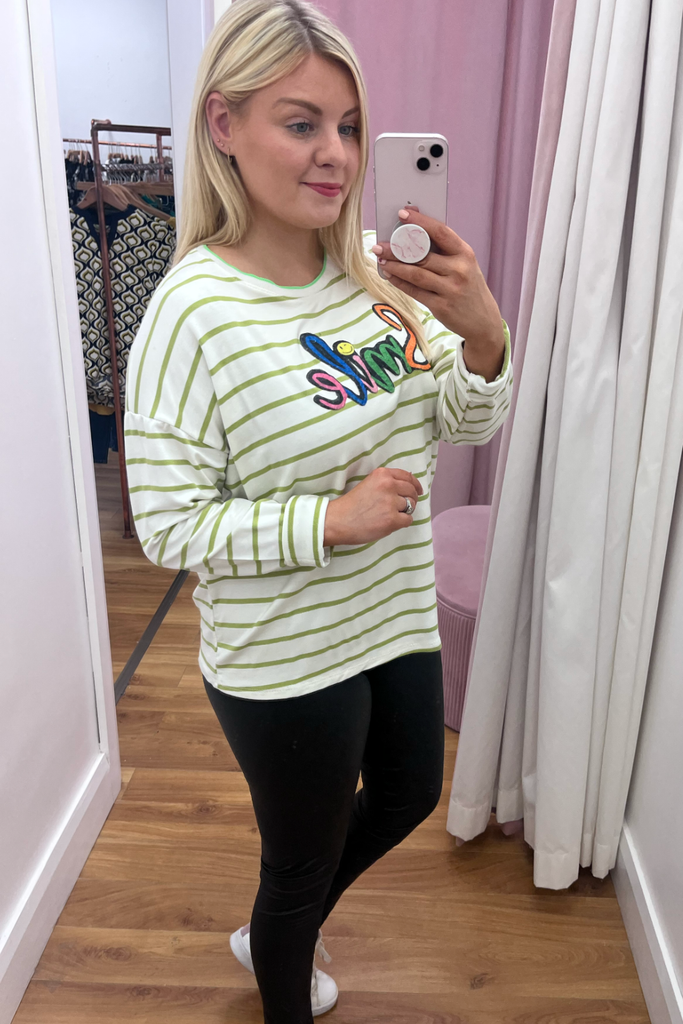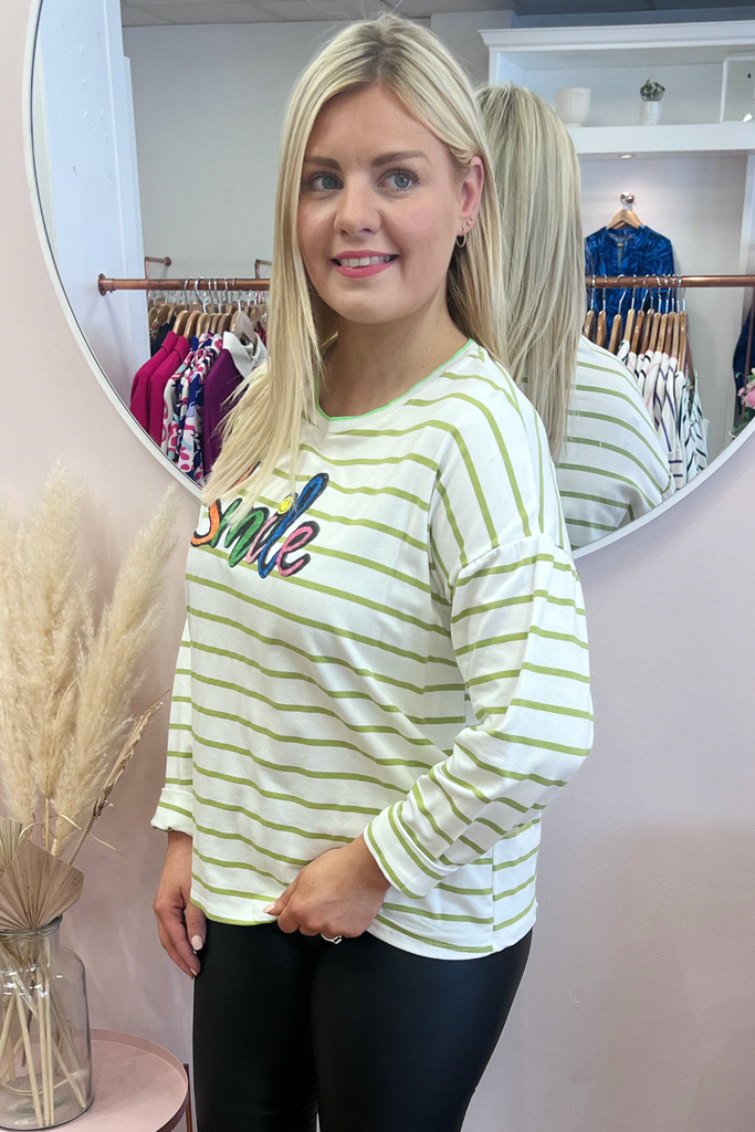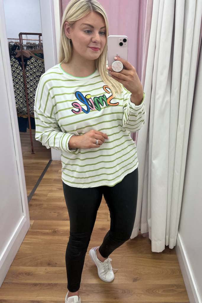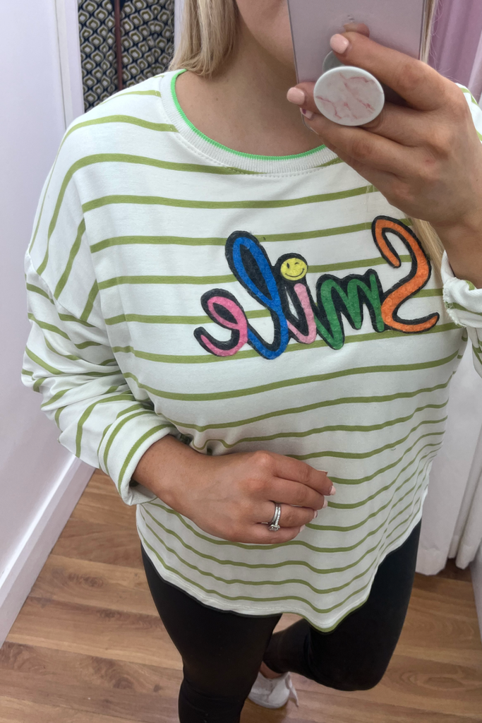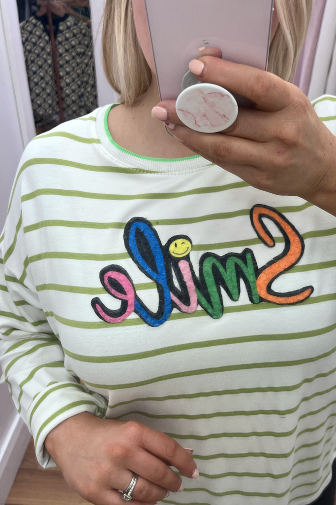 Striped round neck jersey top with textured SMILE motif and contrasting trim along the neckline. The sleeves can be worn rolled or full length, The perfect pop of colour for your casual Autumn wardrobe!
