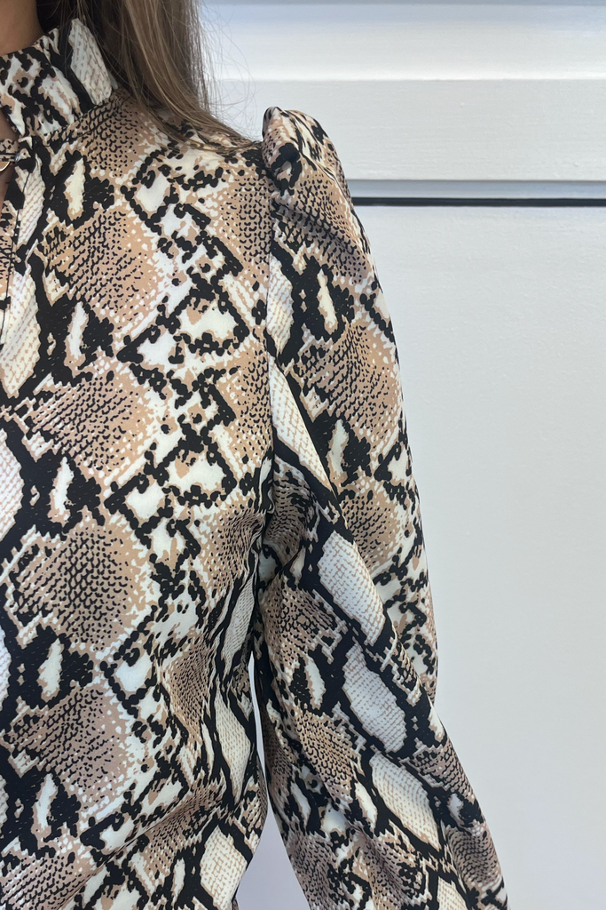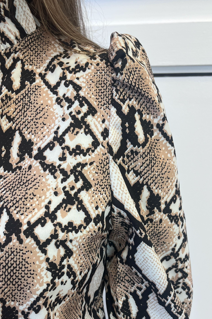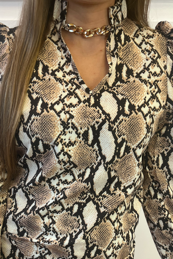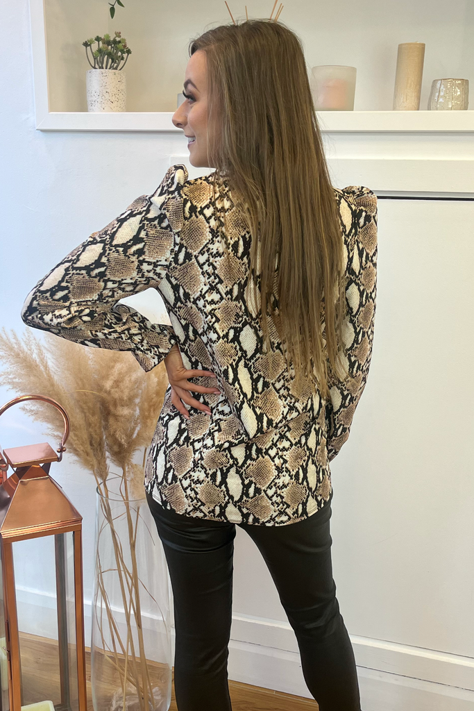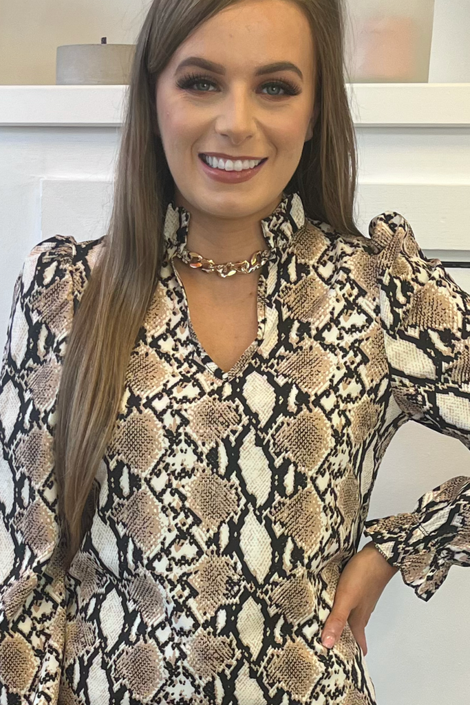 Animal print is always in style for Autumn/Winter and this snake print blouse is a fun and pretty modern version. Featuring chain trim at the V-neckline (unhook to put over your head) with ruffled neckline and cuff.