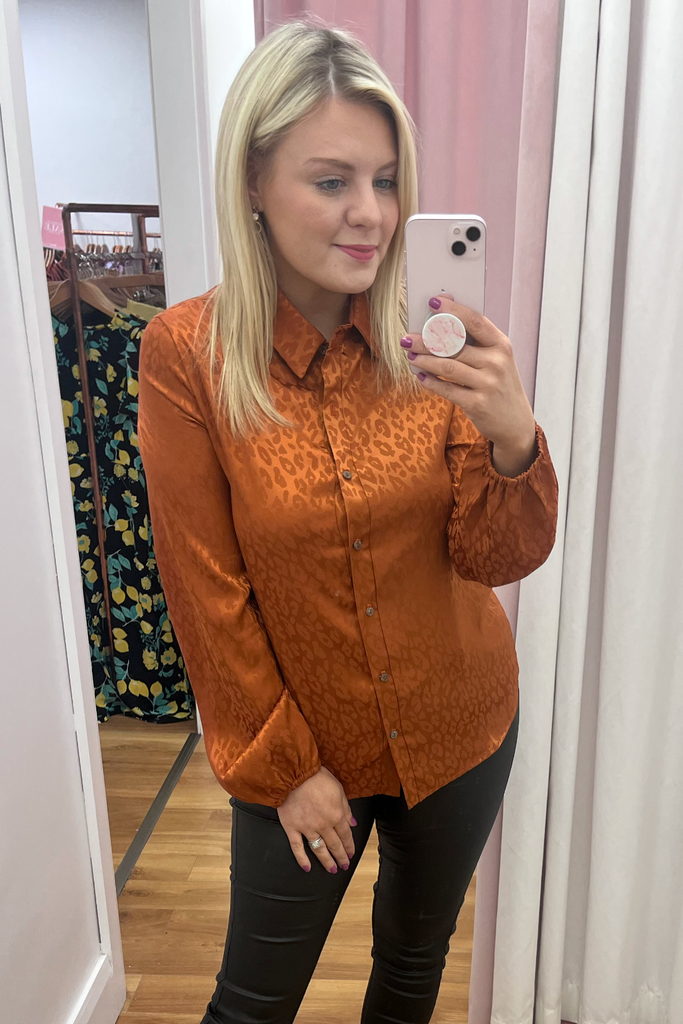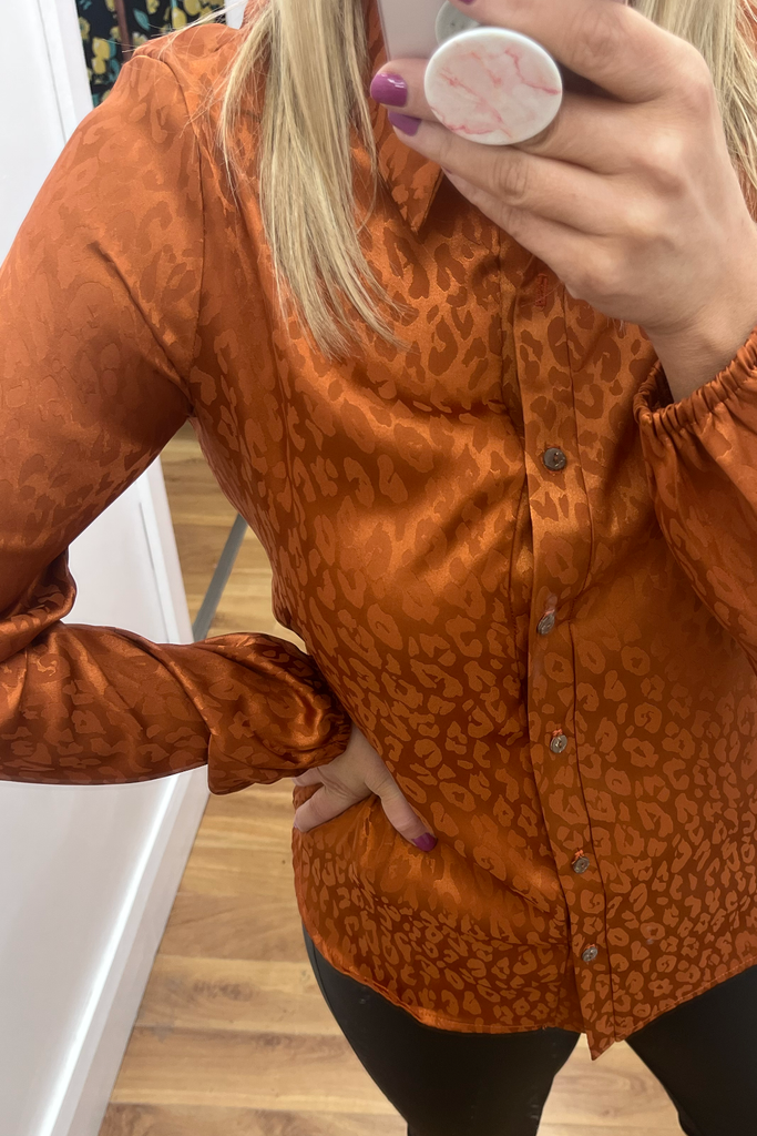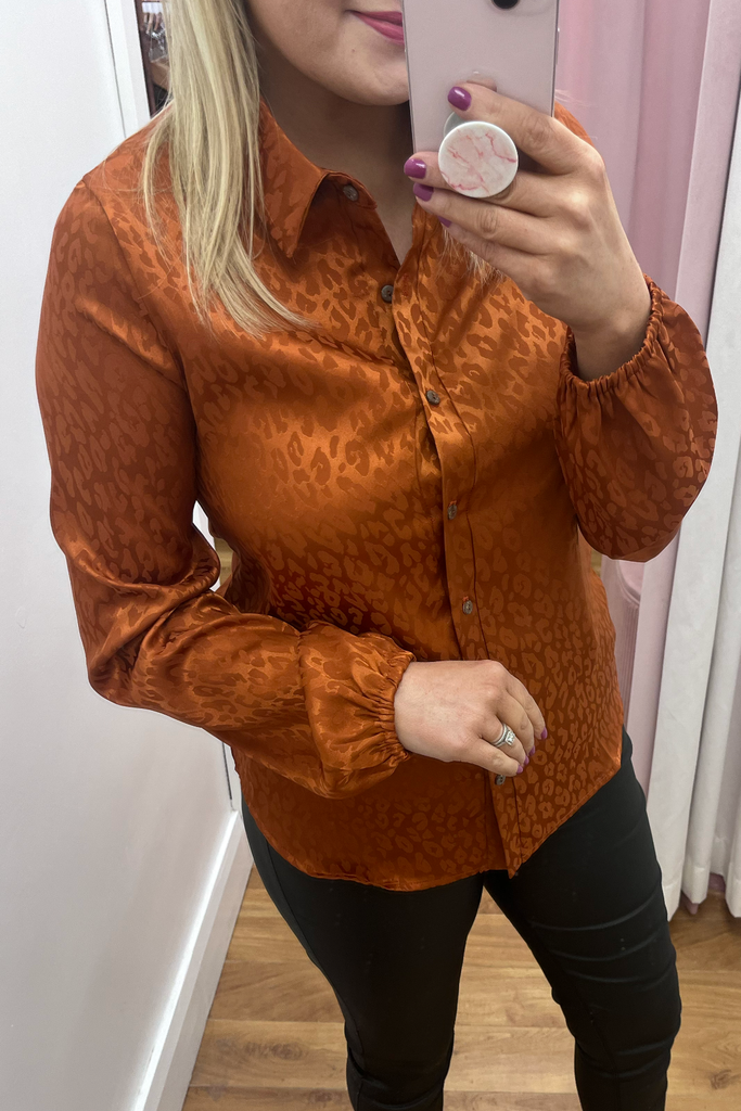 Button-down collared satin-look shirt with subtle animal print and balloon sleeve. With curved hem and elasticated cuff. A nice comfortable fit perfect for every day or evening!