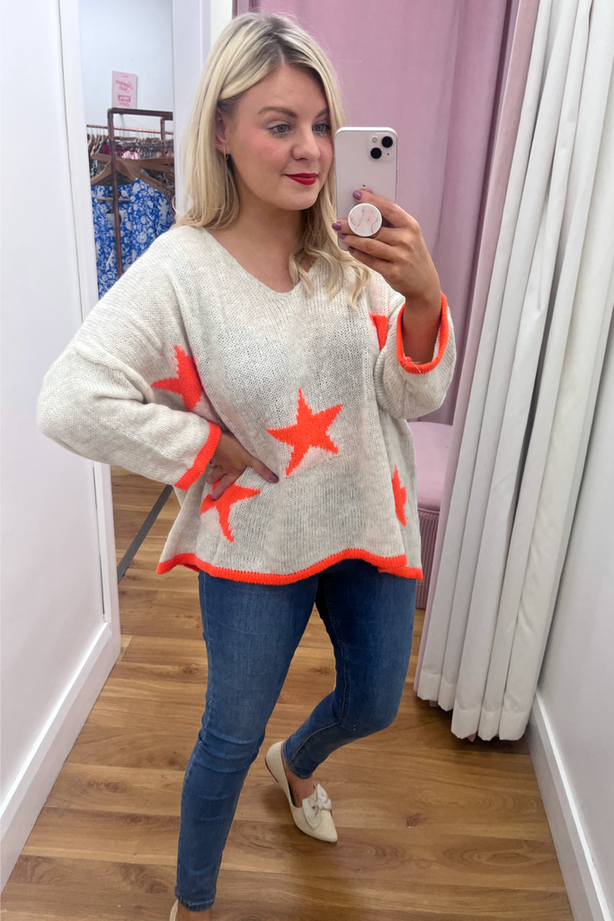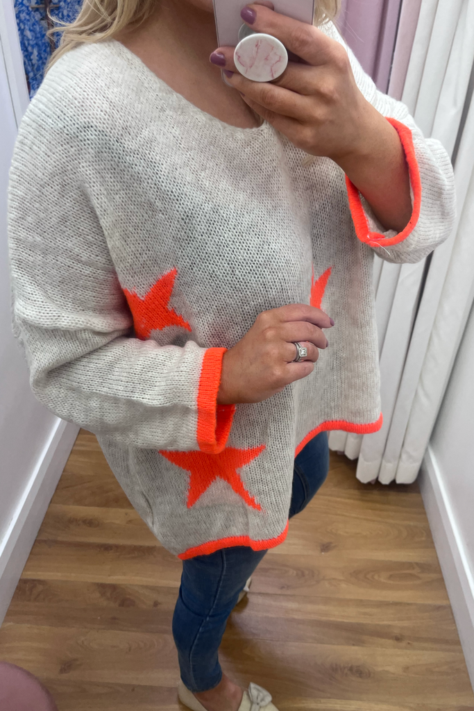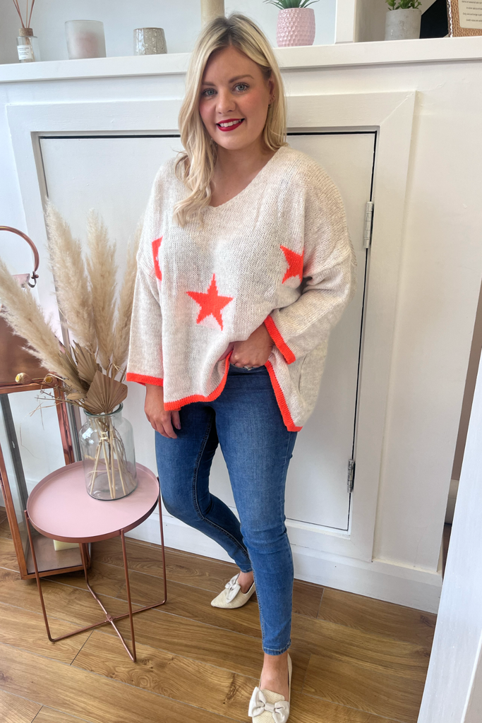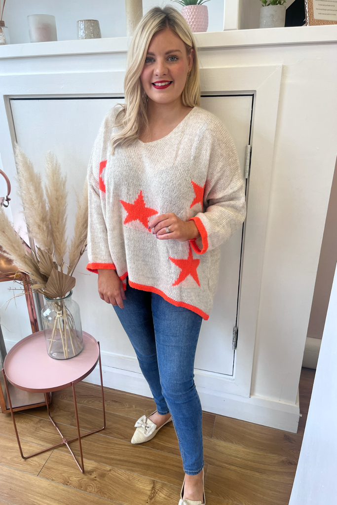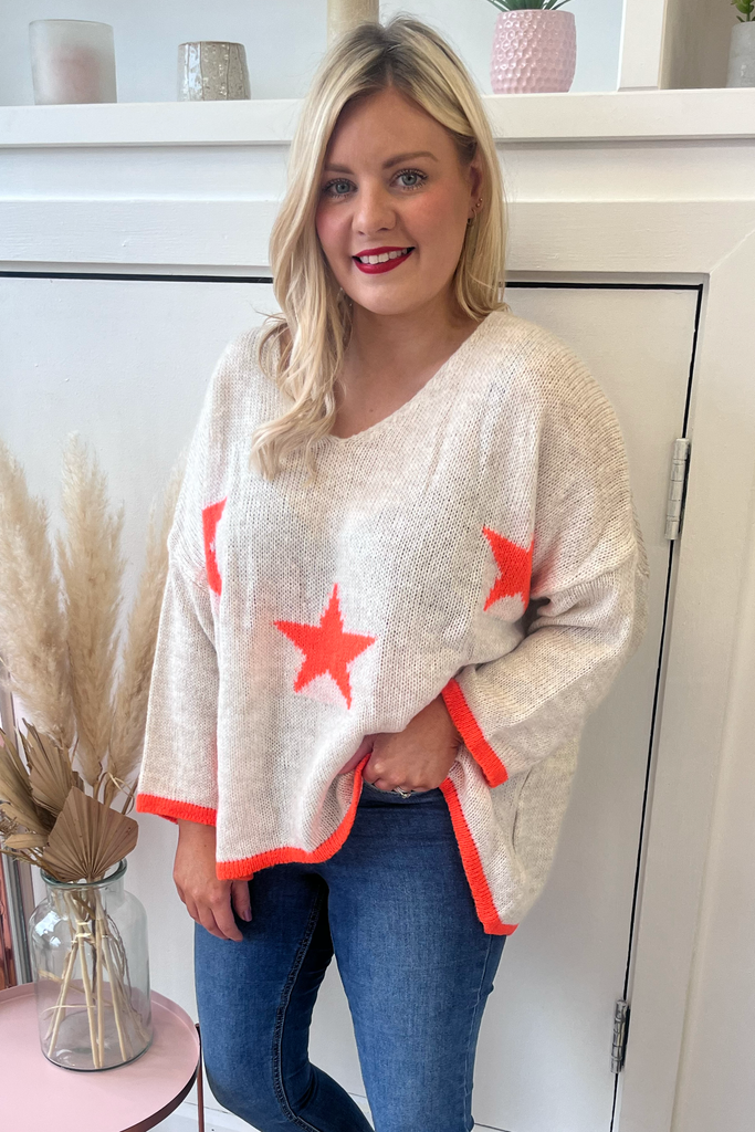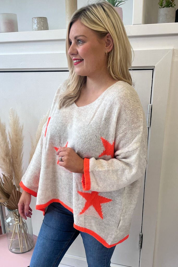 *BESTSELLER RESTOCKED * A statement knit with V-neckline, full length sleeves and long length body with dipped hem to the back. With orange stars and orange cuff and trimmed hemline. Team it with denims or leather looks, tuck it into a skirt or layer it over a dress. The perfect casual style with a pop of colour!