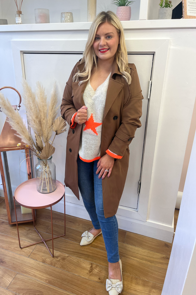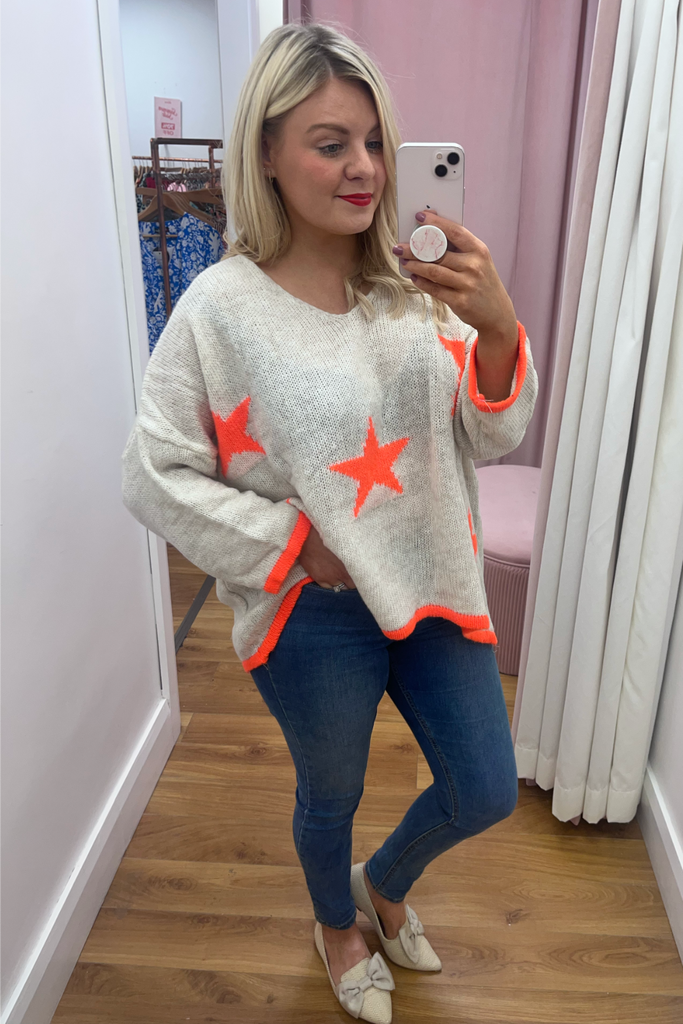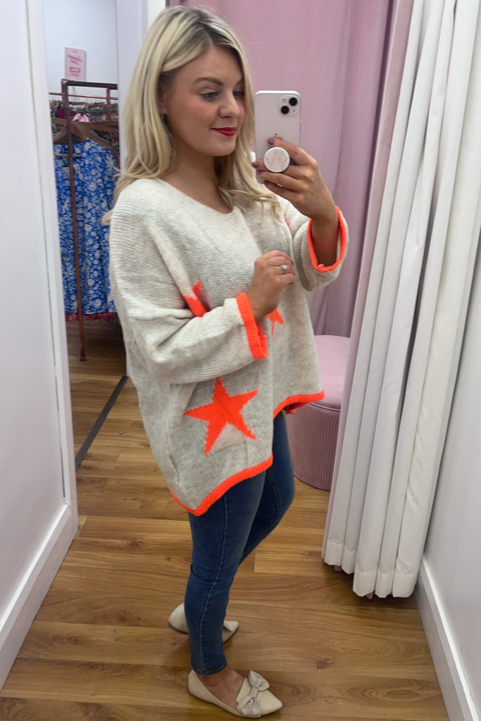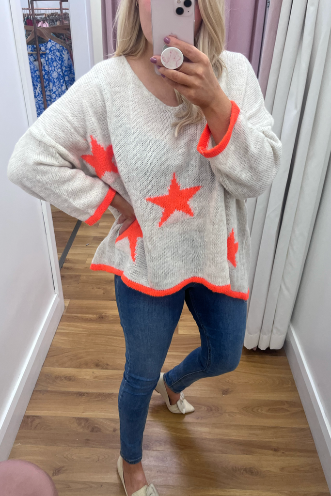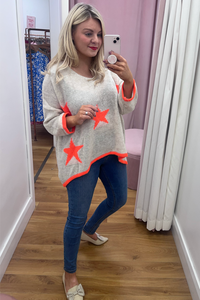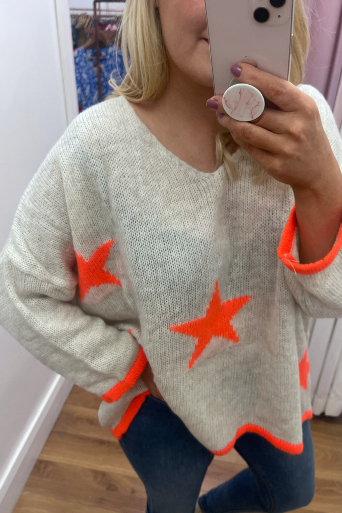 *BESTSELLER RESTOCKED * A statement knit with V-neckline, full length sleeves and long length body with dipped hem to the back. With orange stars and orange cuff and trimmed hemline. Team it with denims or leather looks, tuck it into a skirt or layer it over a dress. The perfect casual style with a pop of colour!