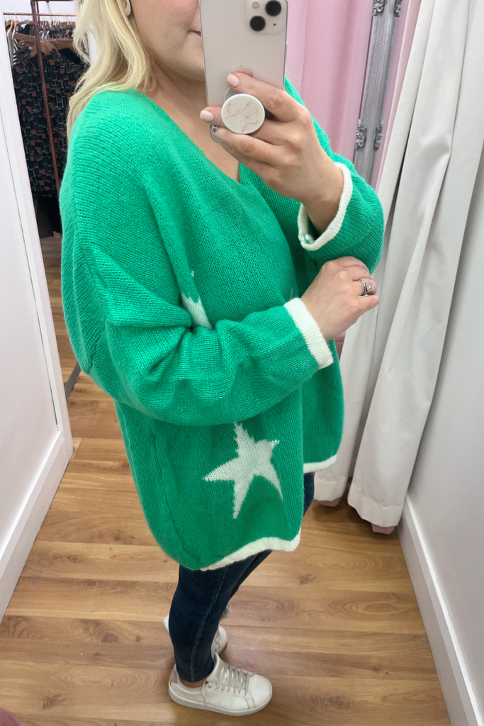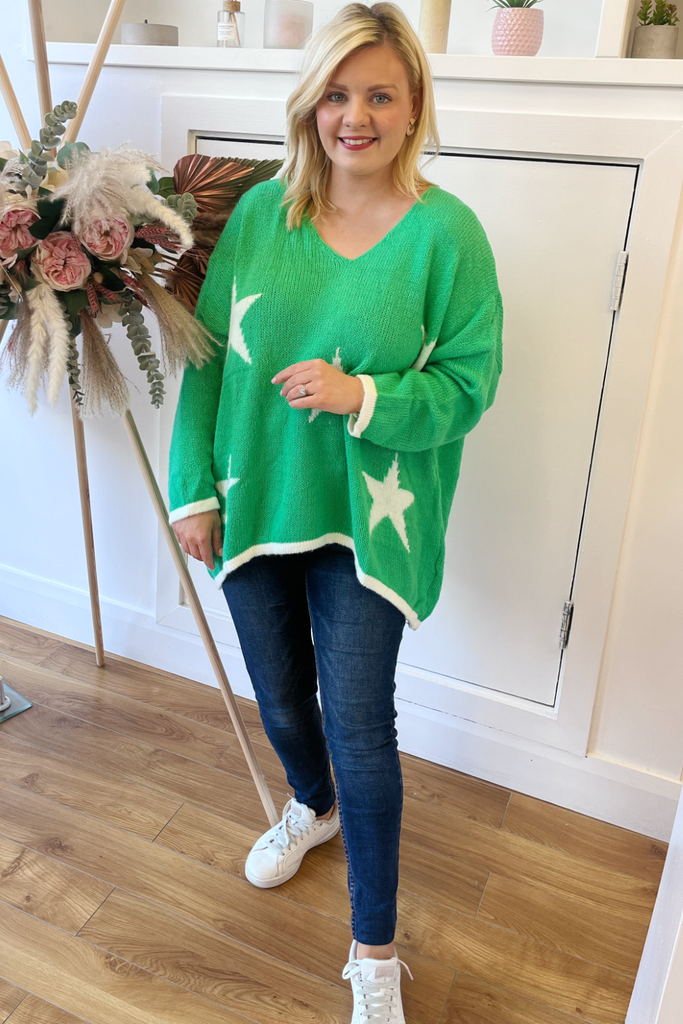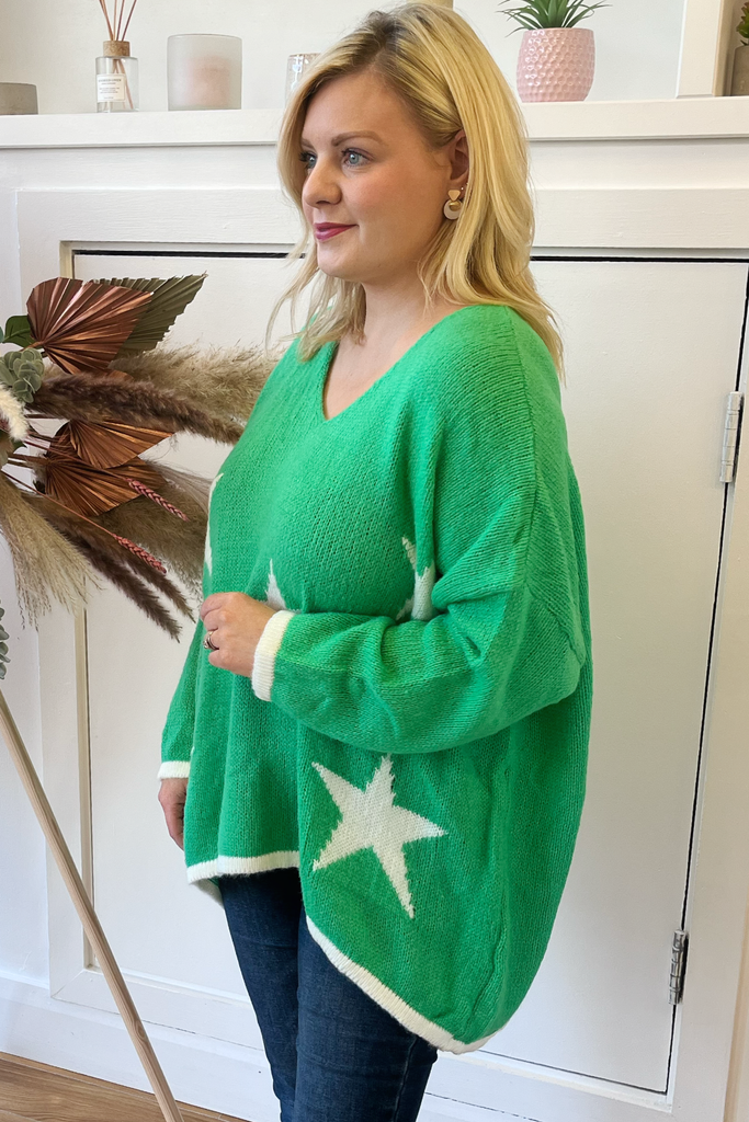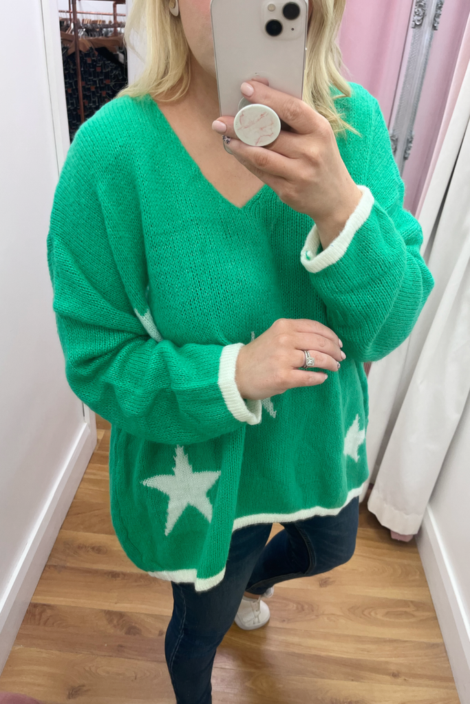 A statement knit with V-neckline, full length sleeves and long length body with dipped hem to the back. With contrasting stars and cuff and trimmed hemline. Team it with denims or layer it over a dress. The perfect casual style with a statement colour!