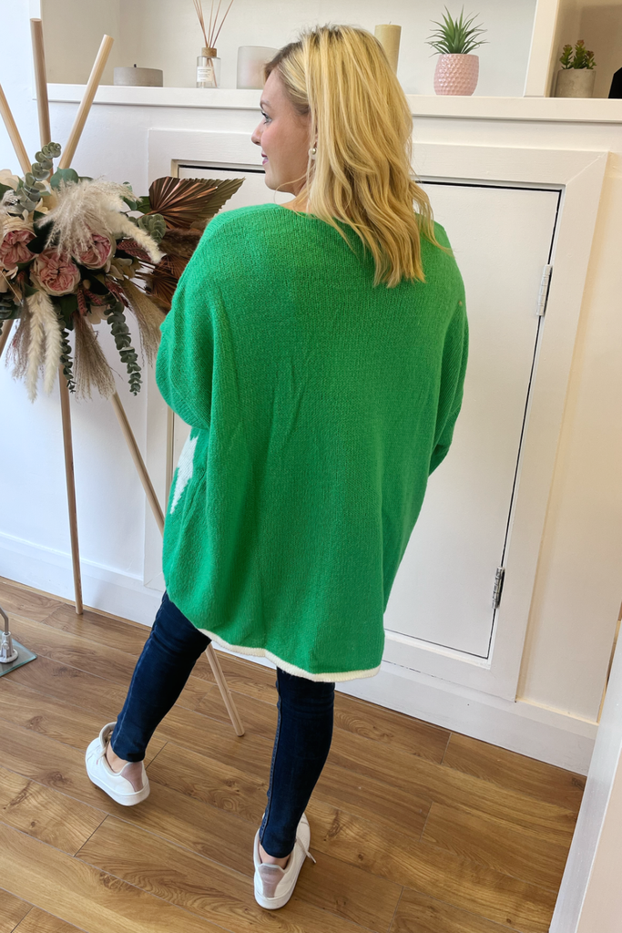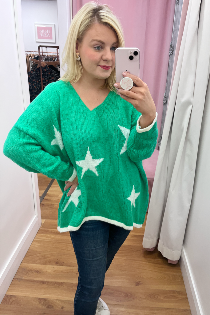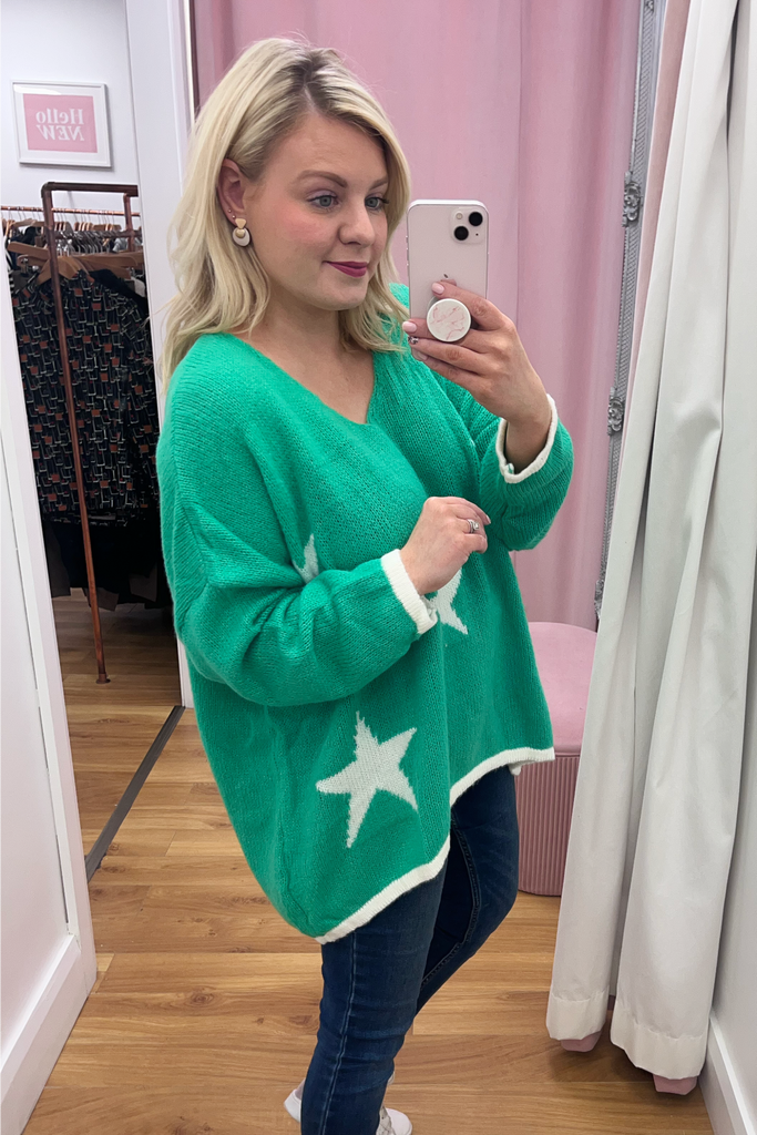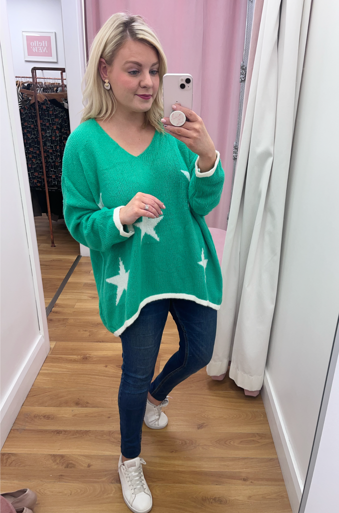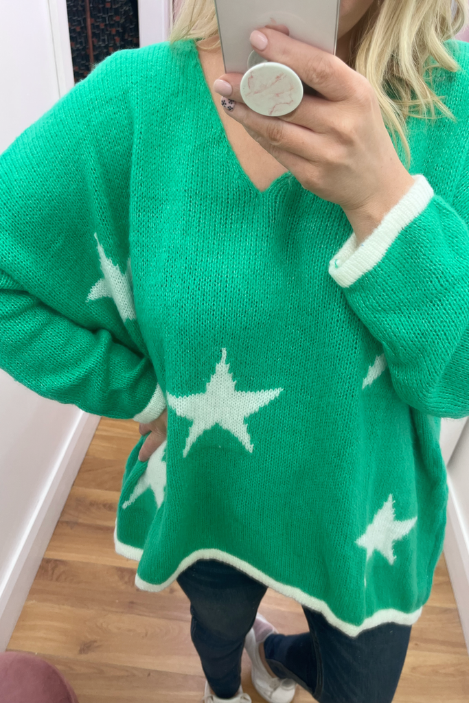 A statement knit with V-neckline, full length sleeves and long length body with dipped hem to the back. With contrasting stars and cuff and trimmed hemline. Team it with denims or layer it over a dress. The perfect casual style with a statement colour!