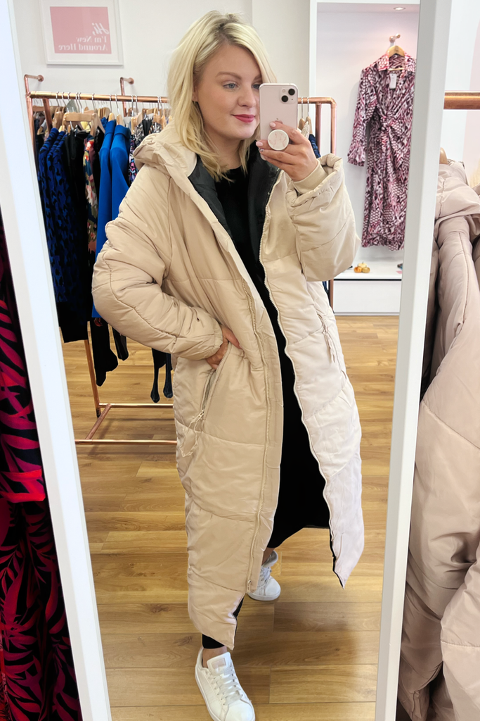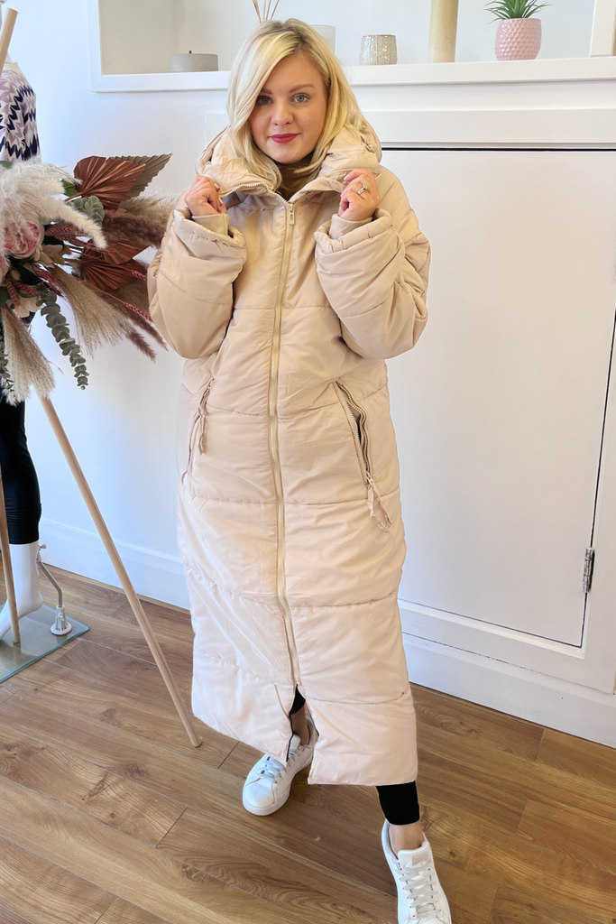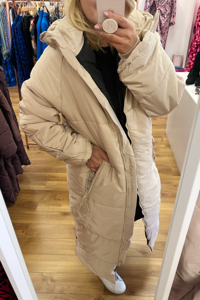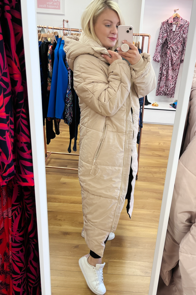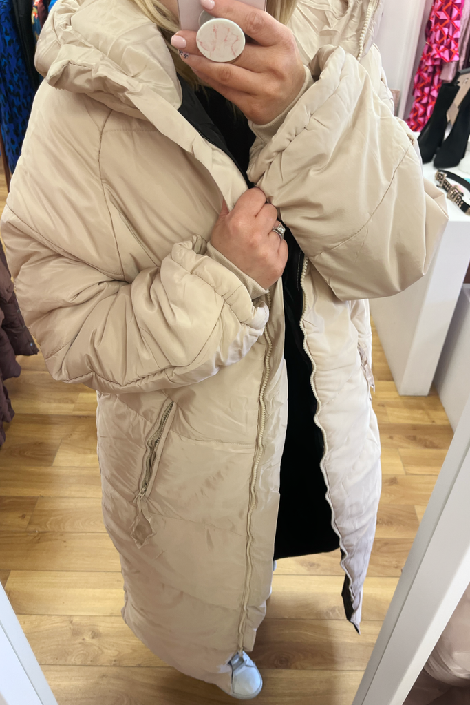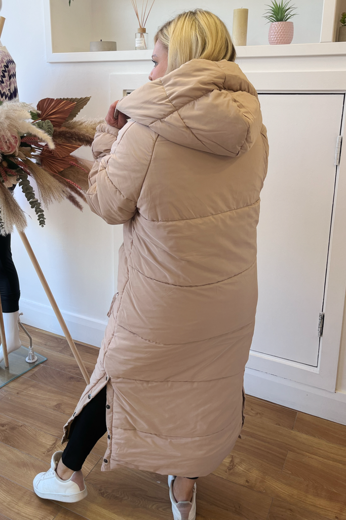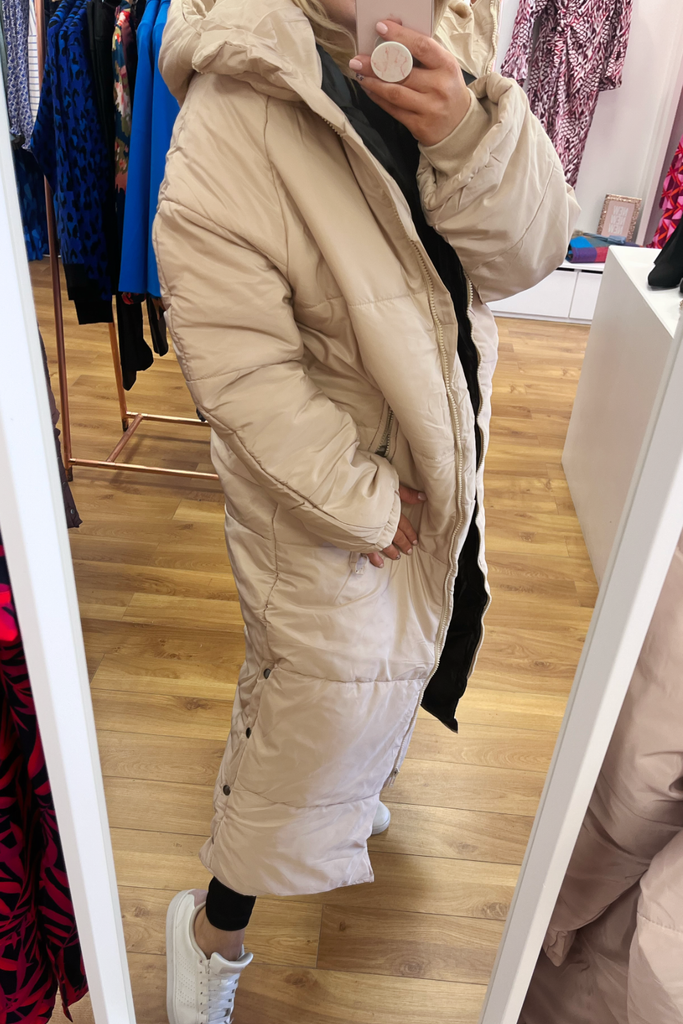 Oversized-longer length padded puffer coat with hood. Features a zip up front, full length sleeves with fitted cuffs, dual pockets with zip closure on the outside and an inside pocket. It has side button detail for great flexibility. Amazing length to give coverage and warmth. Fully lined