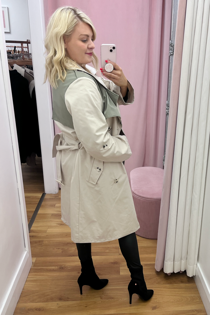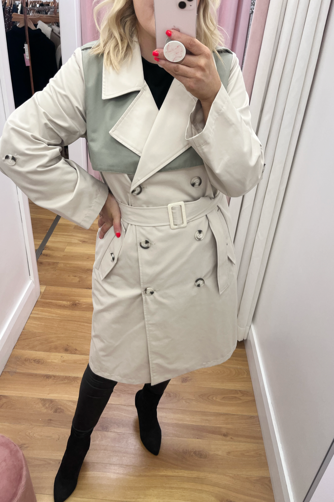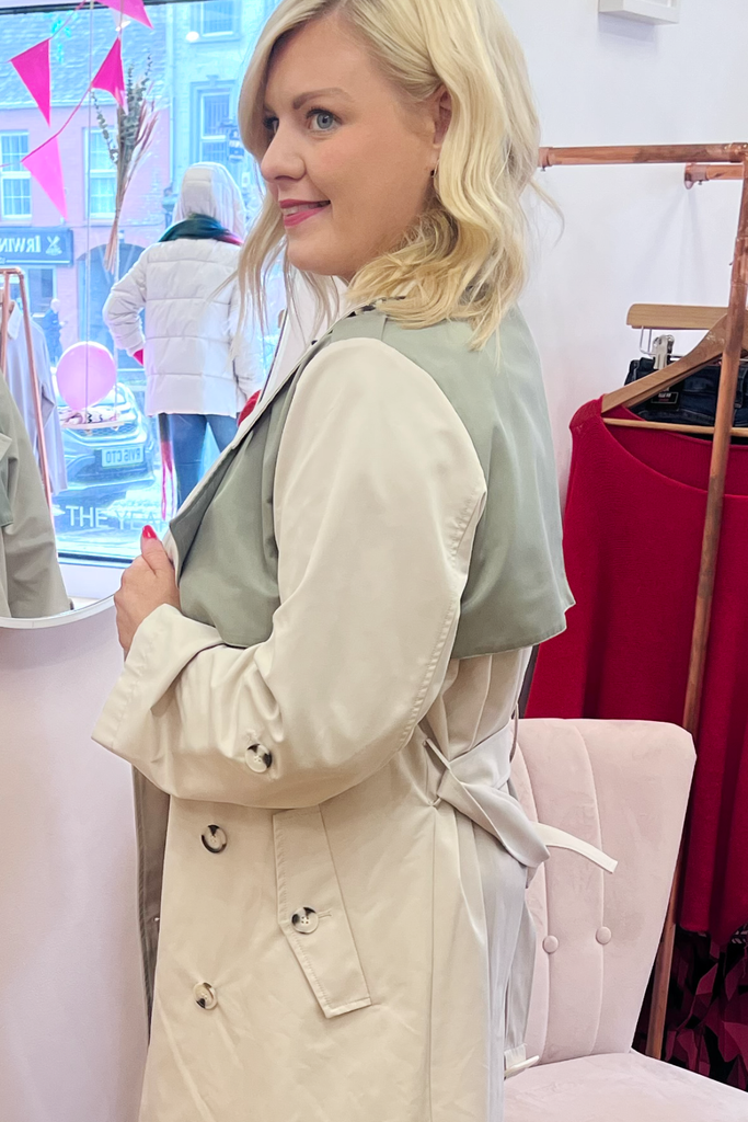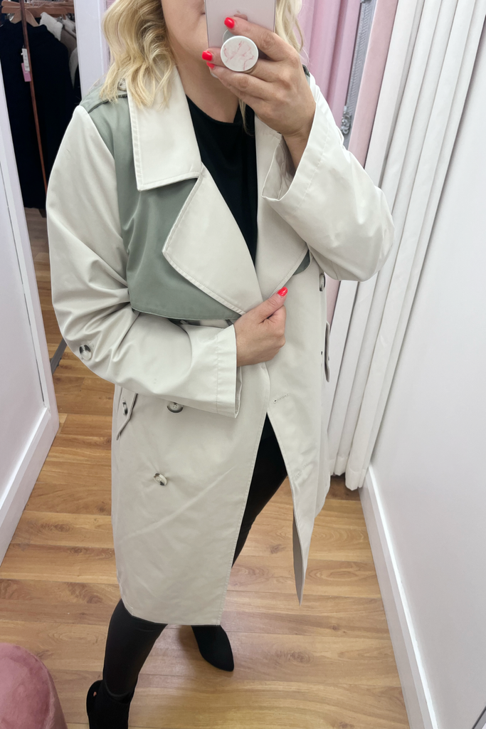 Stone mid-length belted trench coat with contrasting olive panel to the front and back. It has a double buttoned front and fold-over pockets with buttons. Fully lined