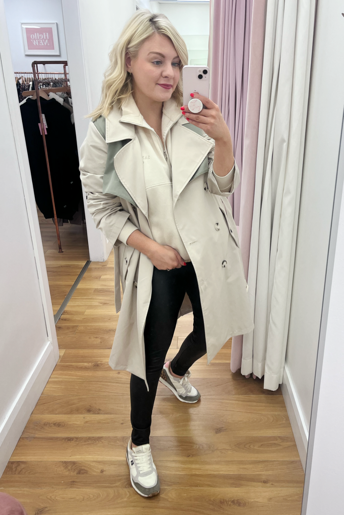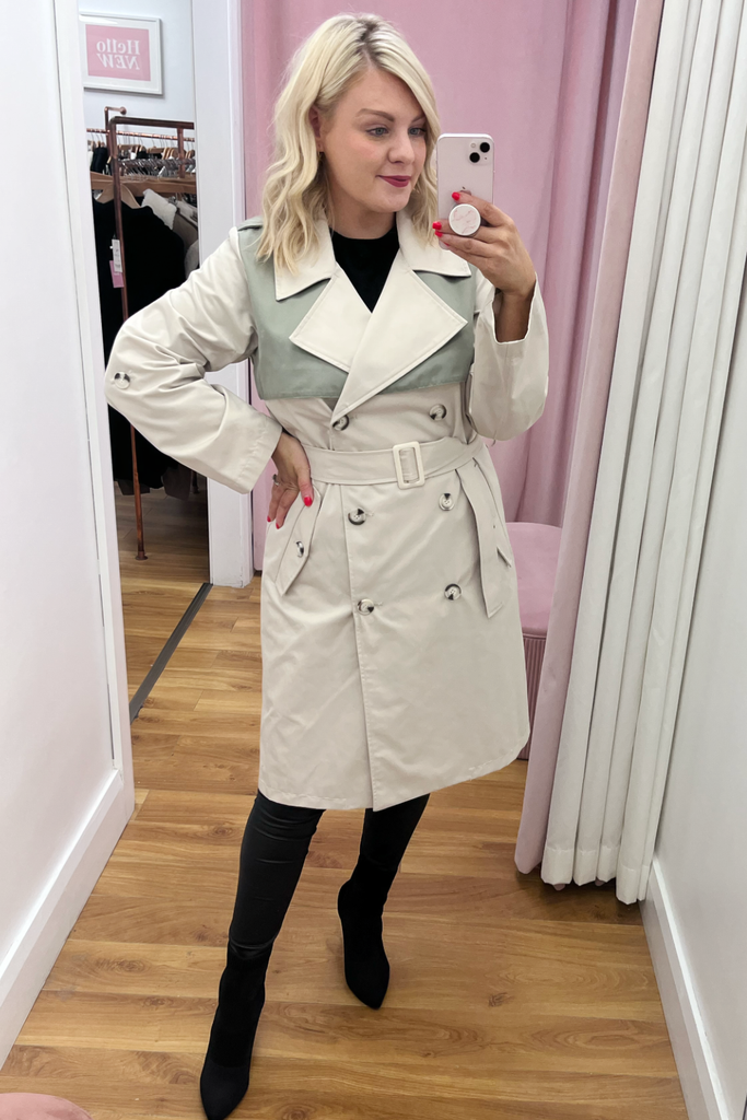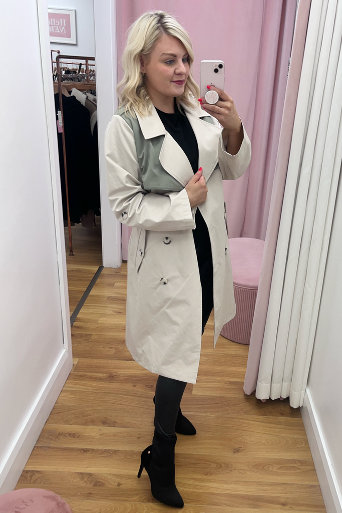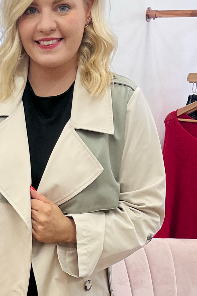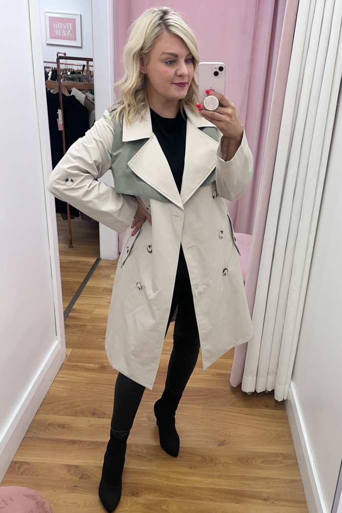 Stone mid-length belted trench coat with contrasting olive panel to the front and back. It has a double buttoned front and fold-over pockets with buttons. Fully lined