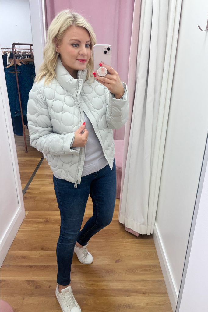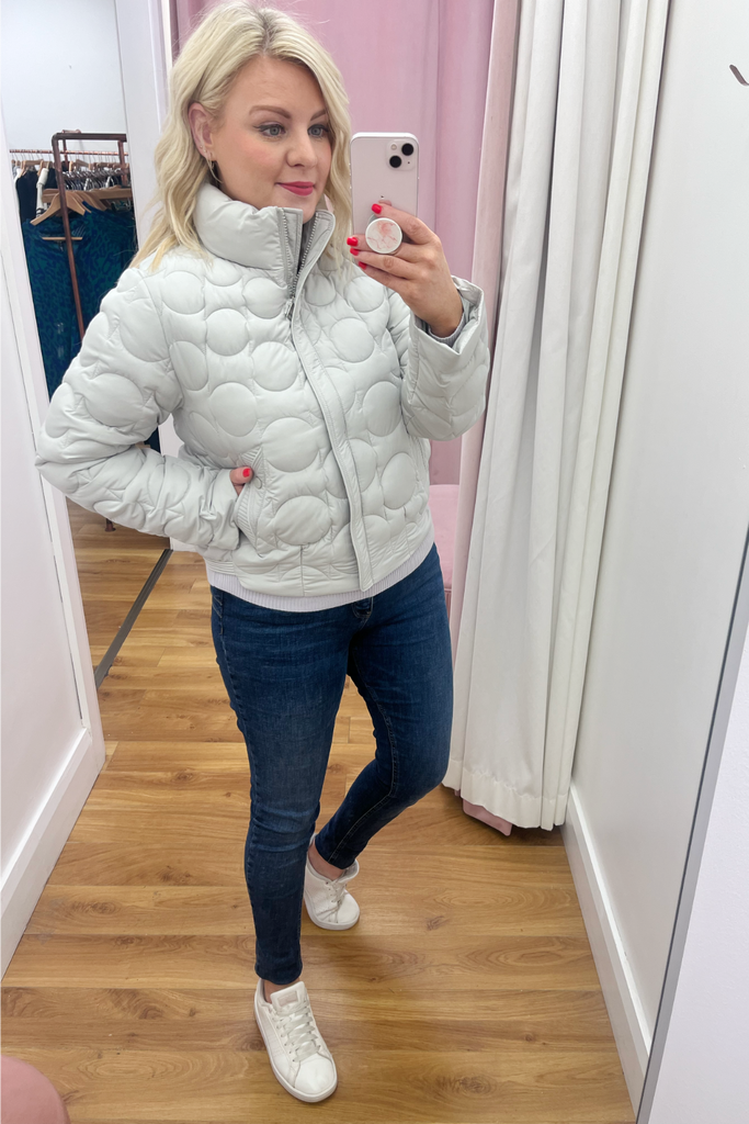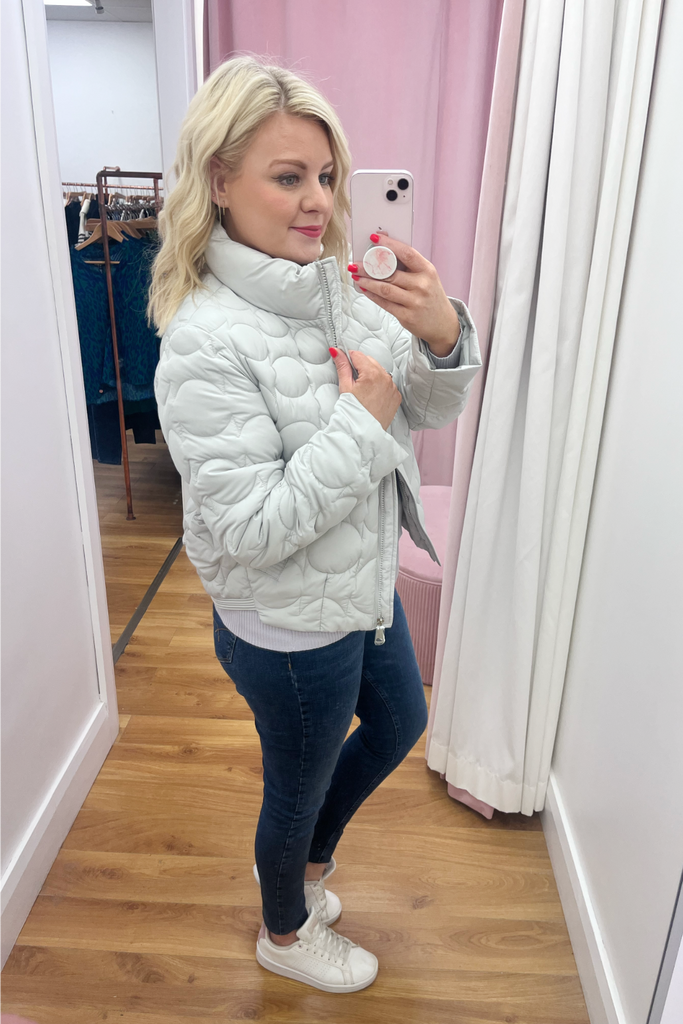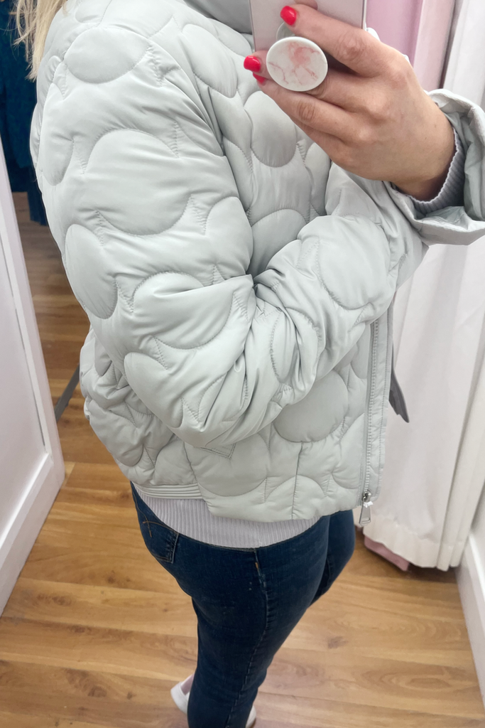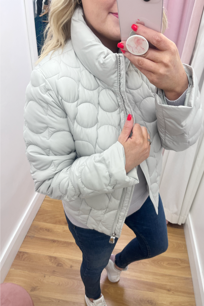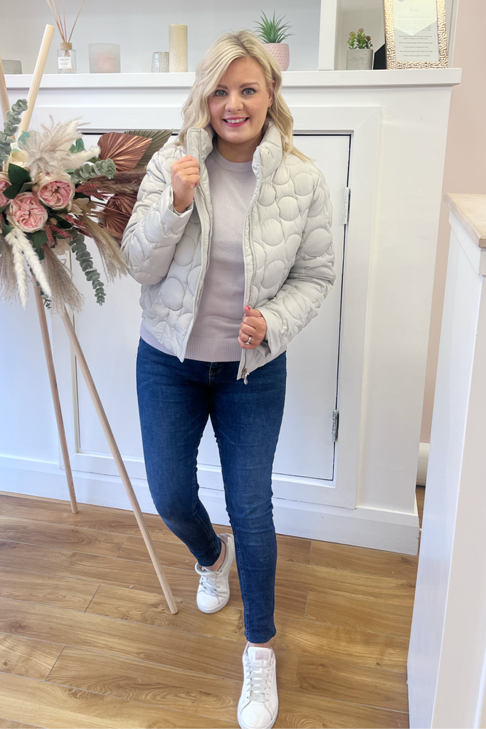 Textured puffer jacket with raised neckline, side pockets and zip up front. It has a banded hemline to the back. Fully lined