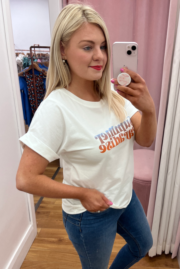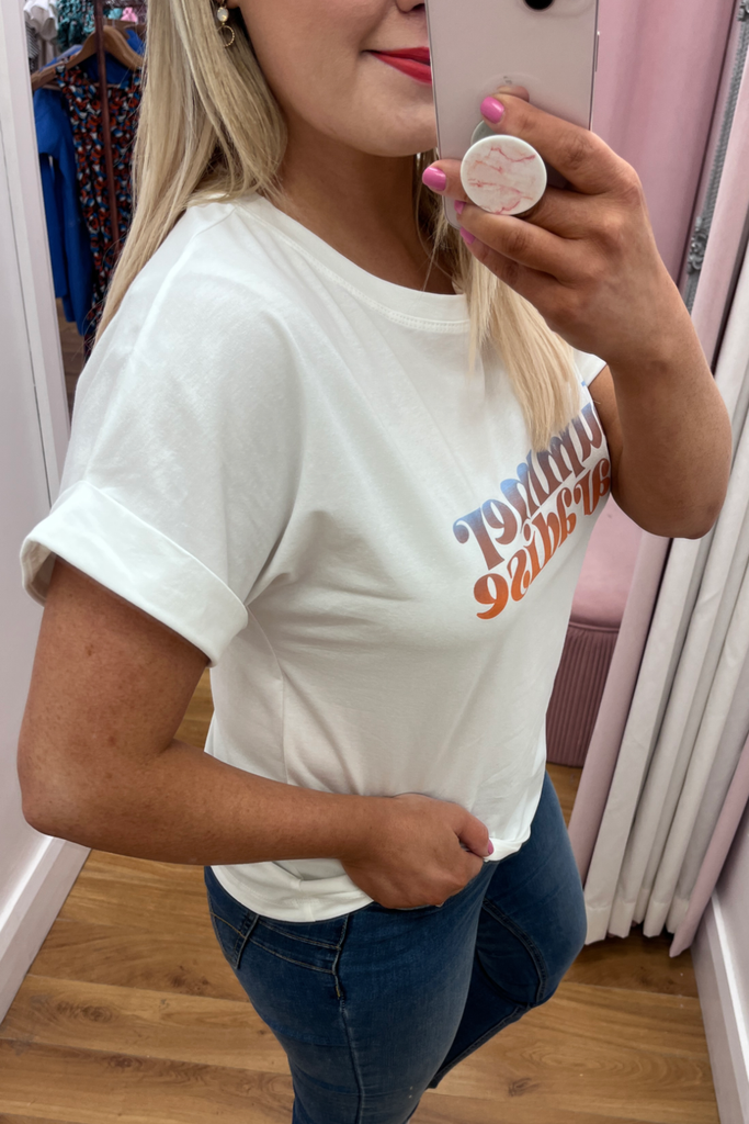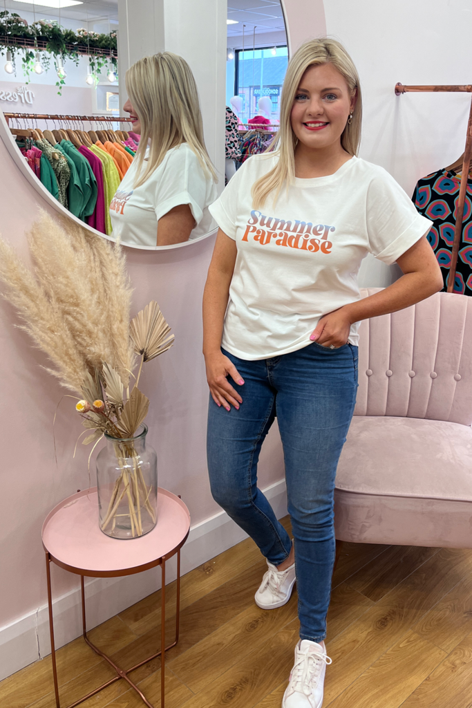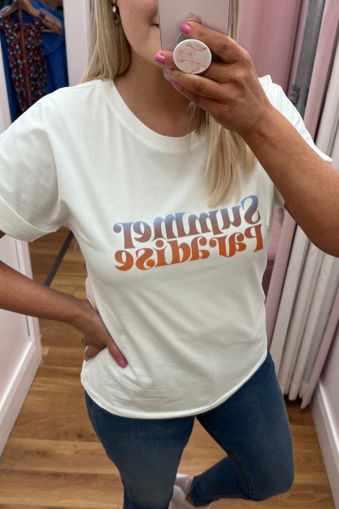 Round neck white tee with dropped sleeve with turned up cuffs, and summer Paradise motif