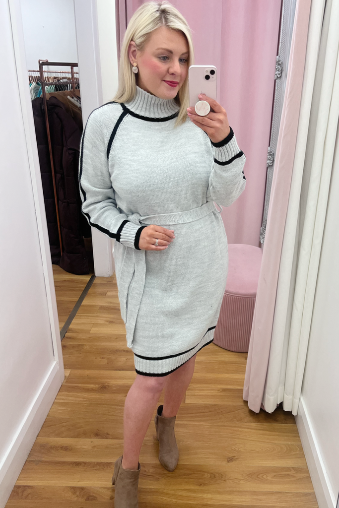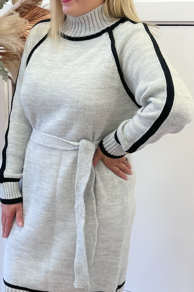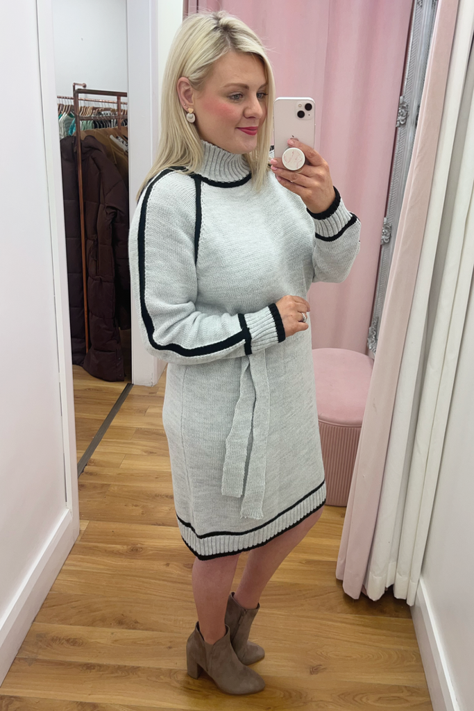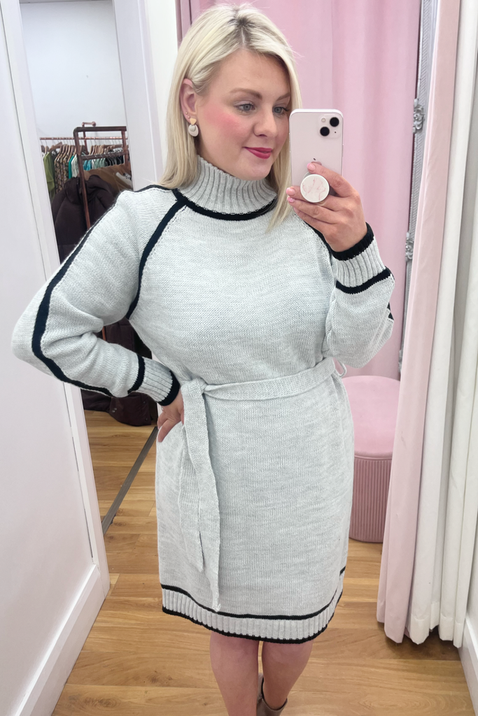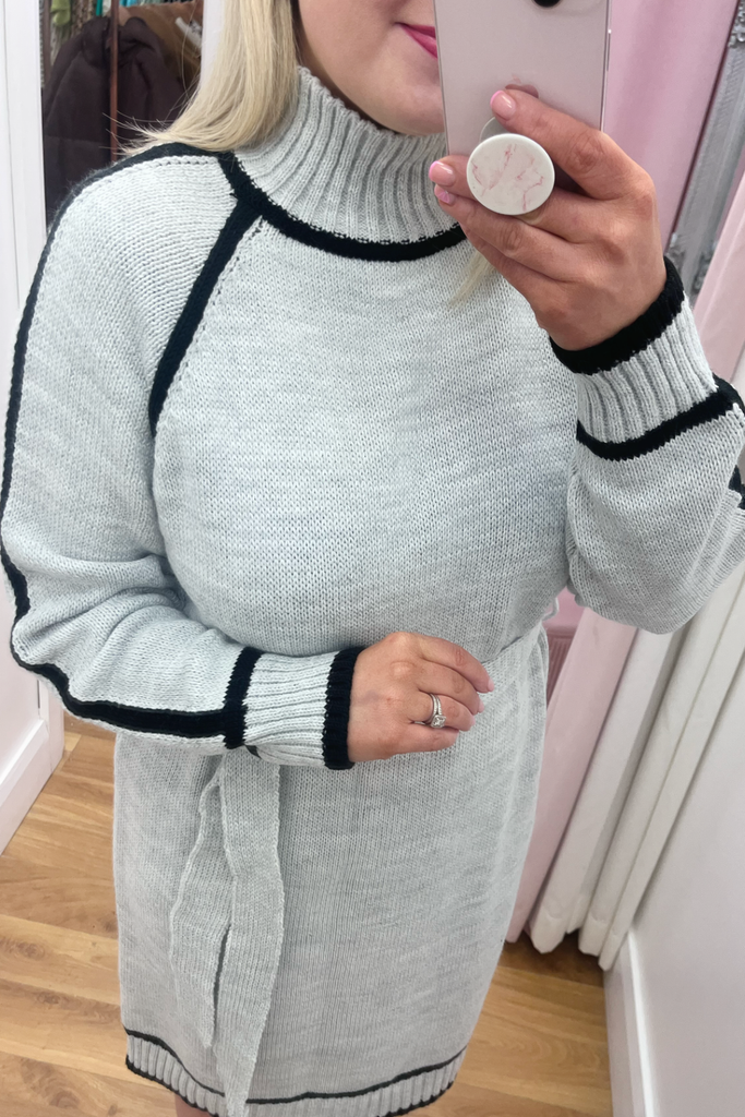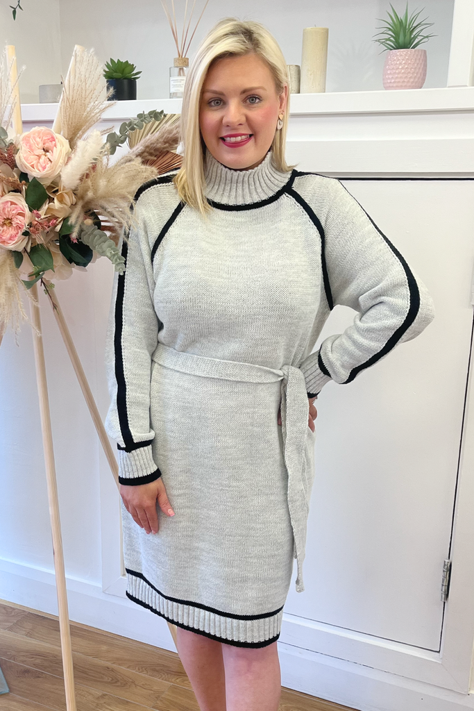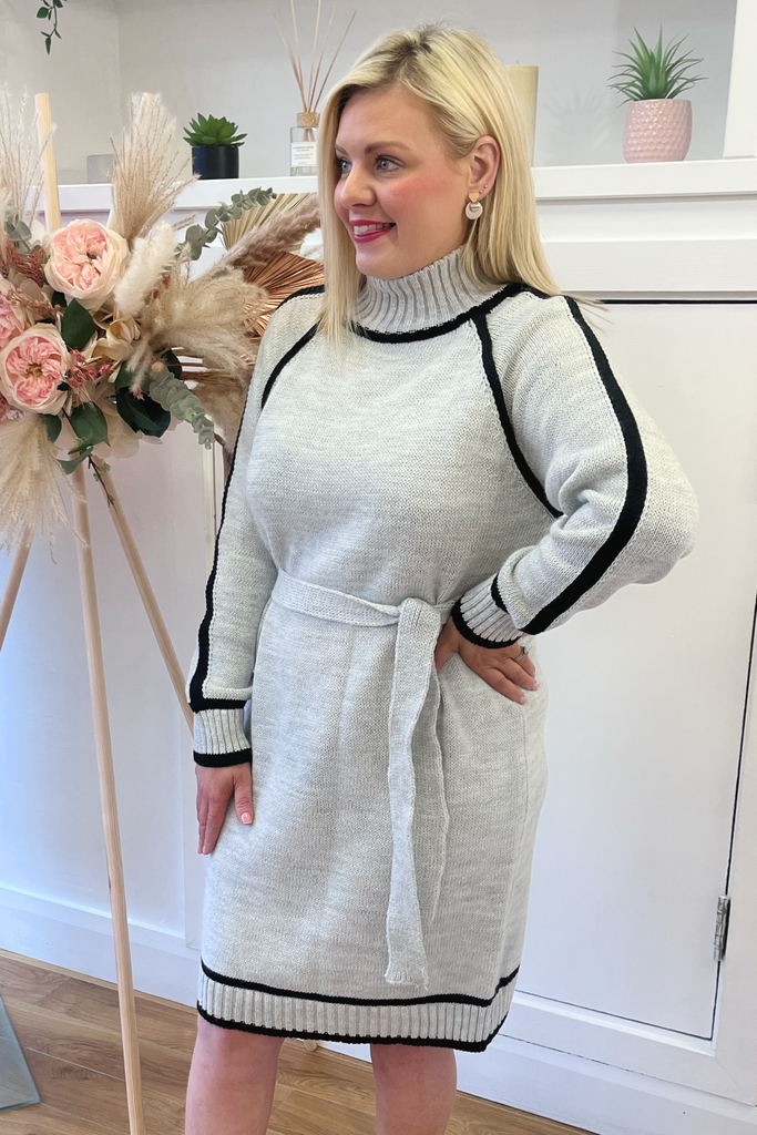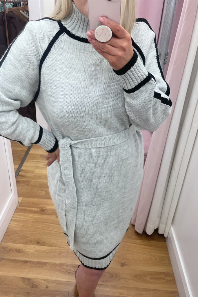 Knitted sweater dress with raised neckline, long sleeve and contrasting stripe detail. With tie belt