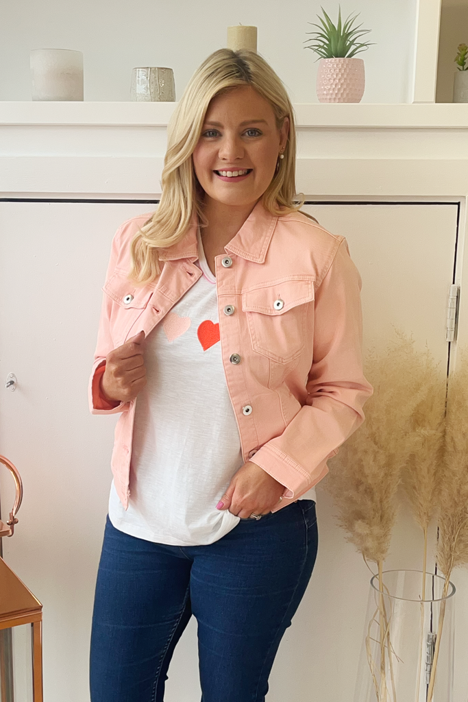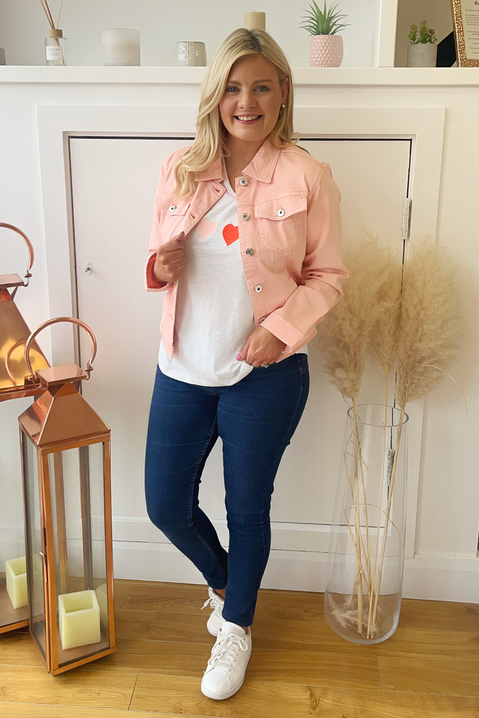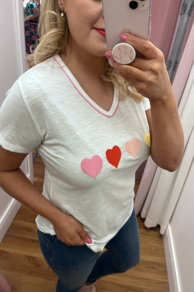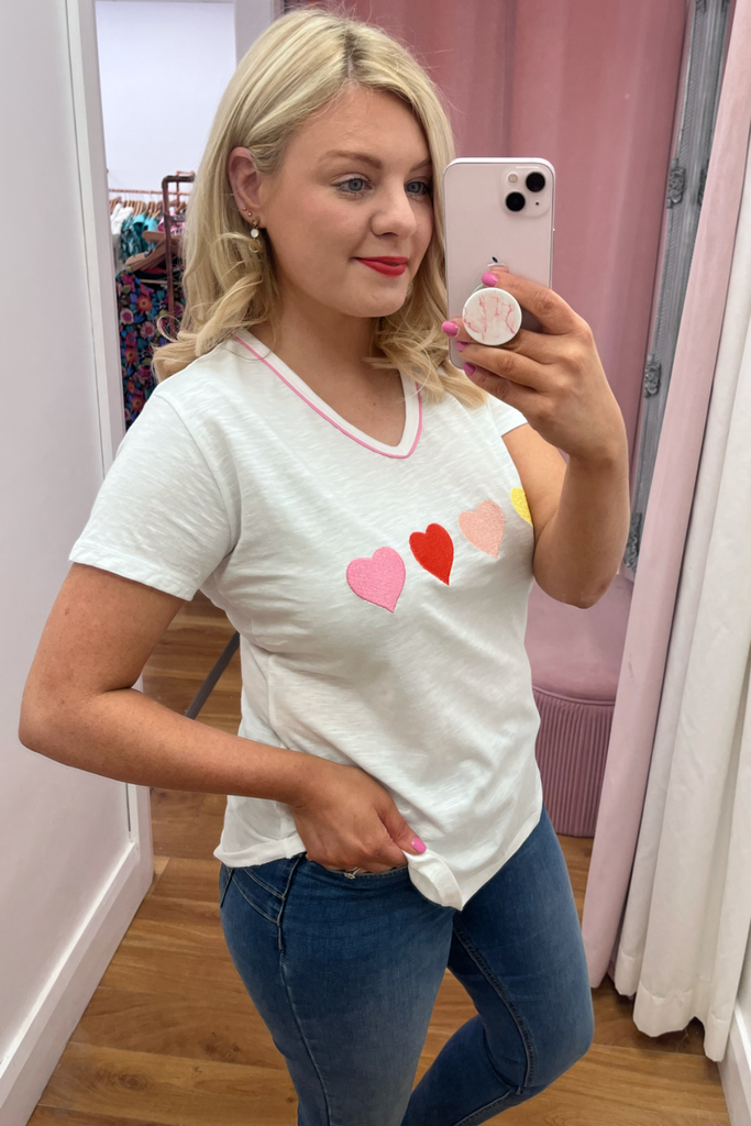 Soft white tee with multi-coloured hearts in a metallic finish, and coloured trim along the neckline. Perfect with coloured or blue skinnies