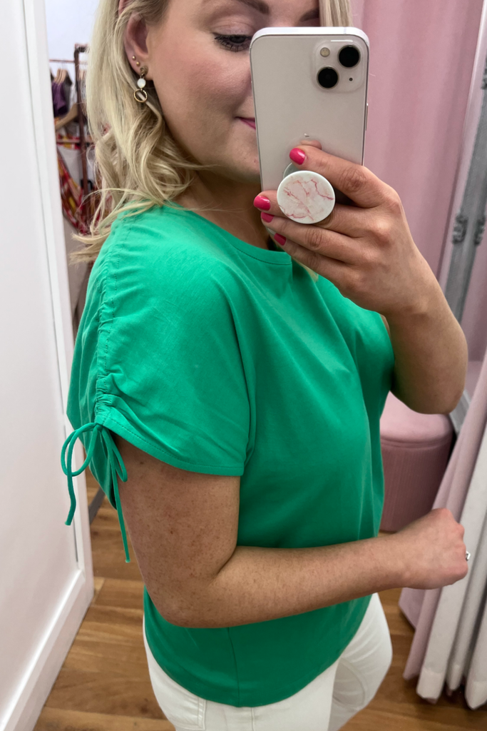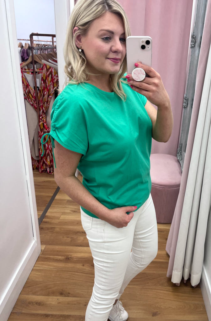 Green round neck tee with dropped short sleeve and drawstring ties on each arm. Can be worn straight or gathered on each side with tie for extra detail!
