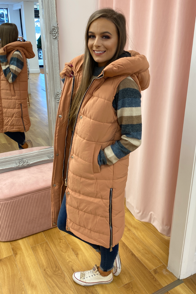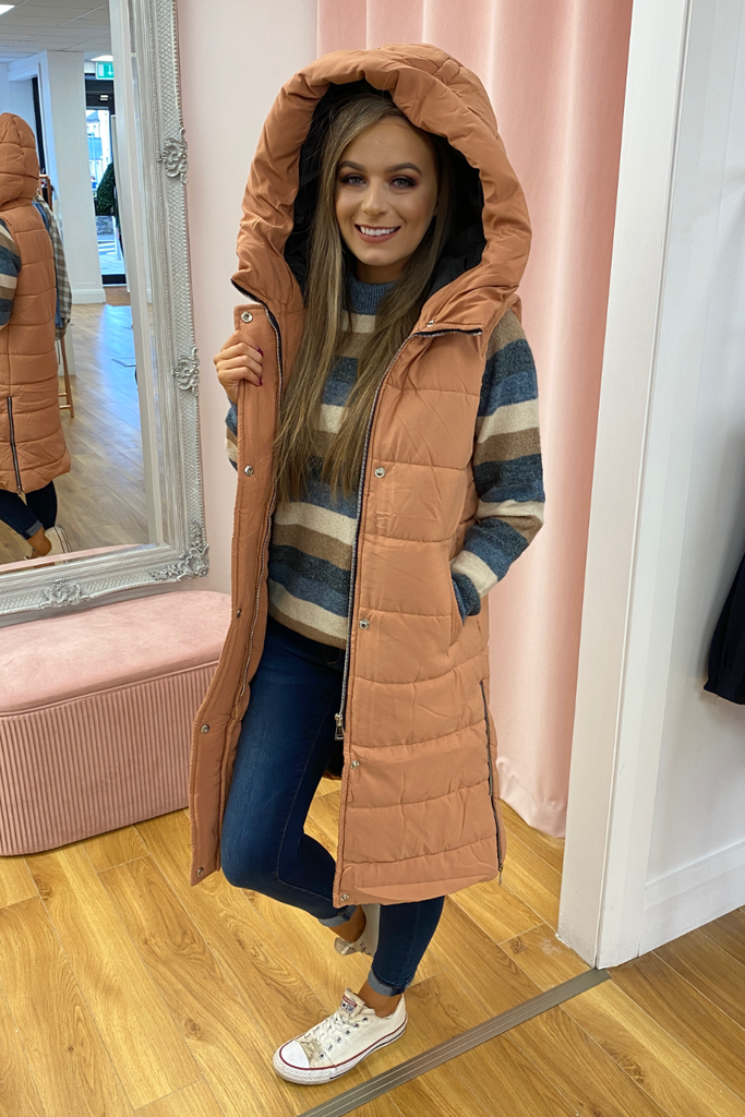 A wardrobe must have! Our tan longline puffer gilet is sure to keep you cosy! Featuring a zip up front with snap button closure, oversized hood and side pockets. Zip detailing on both sides for an extra bit of detail. Gilets are perfect for layering and are super versatile!
