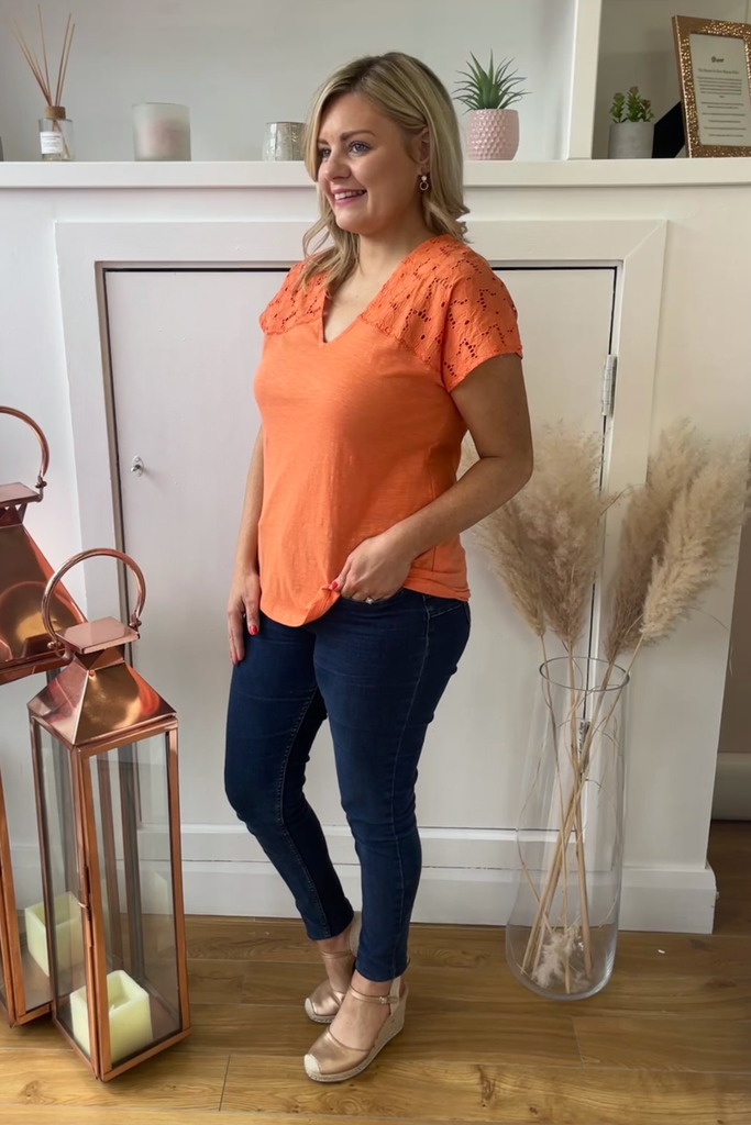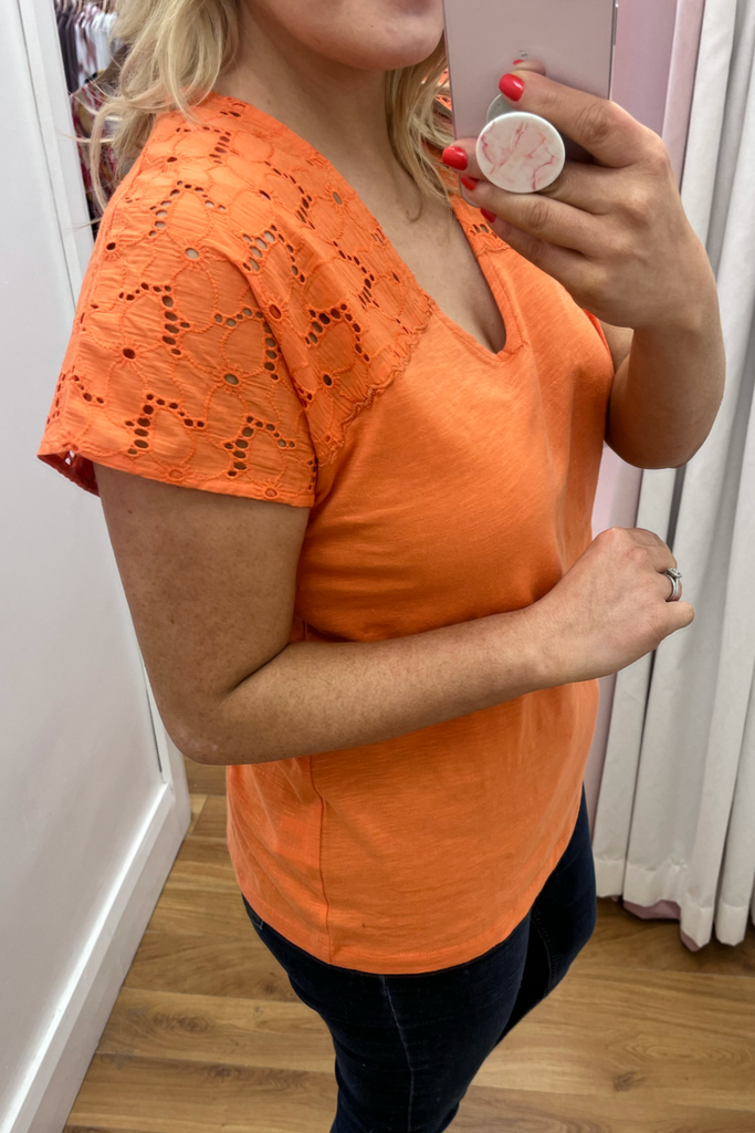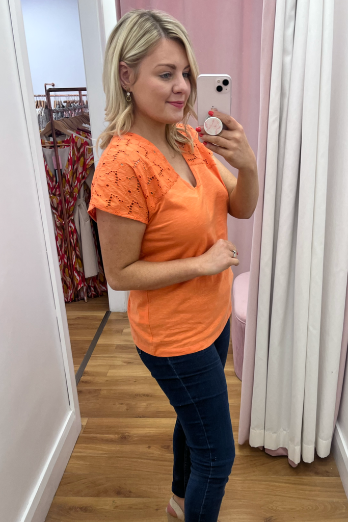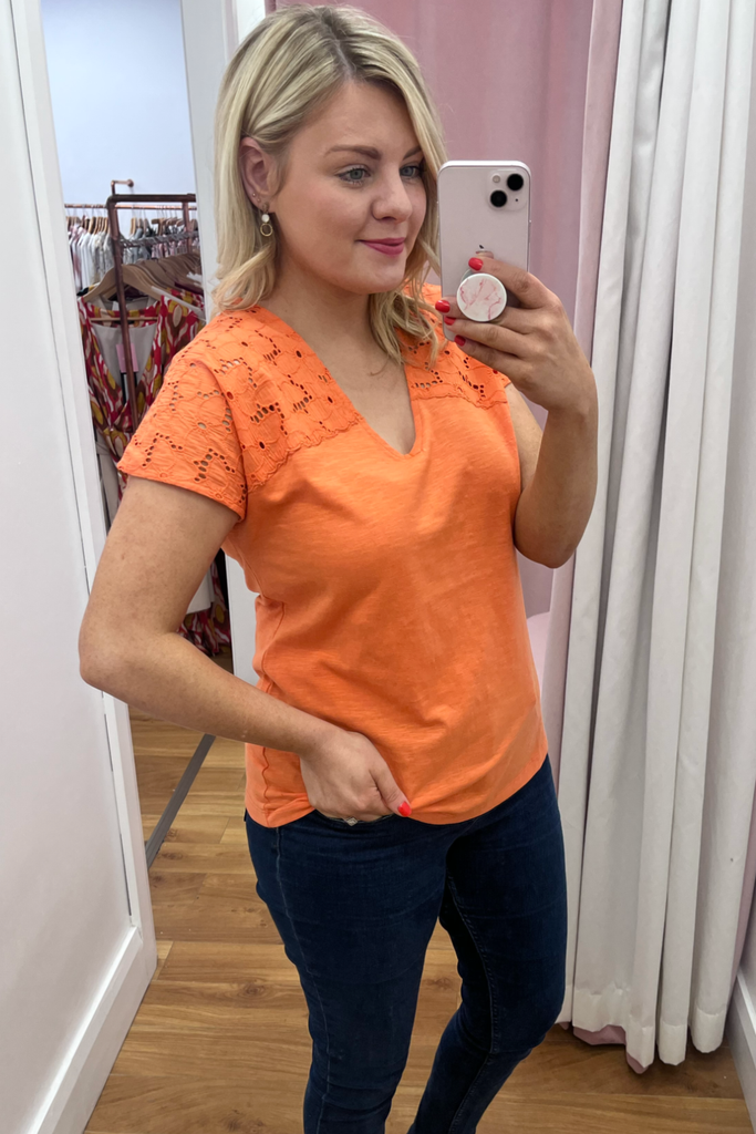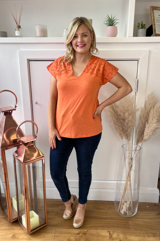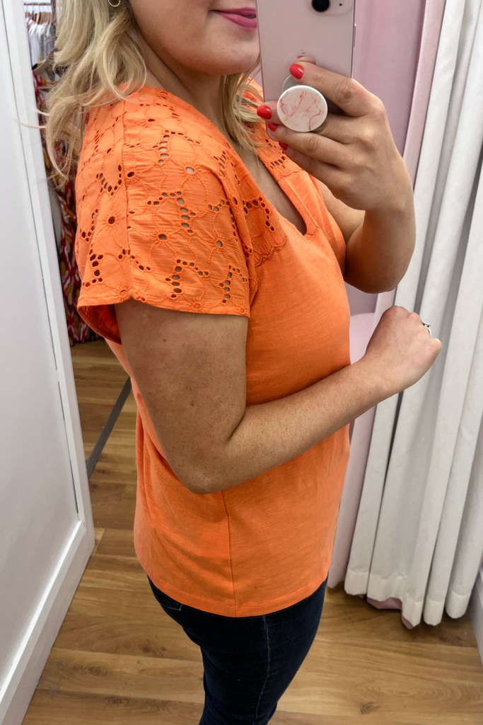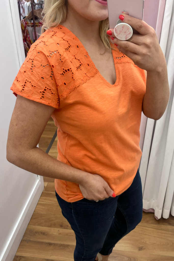 Orange V-neck tee with short sleeve and embroidered detail across the shoulders and back. The back features 3 buttons at the top.