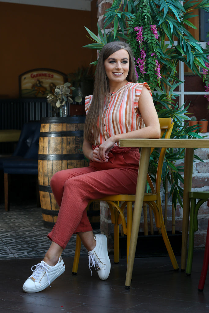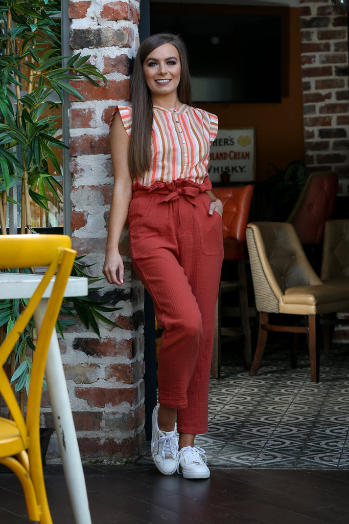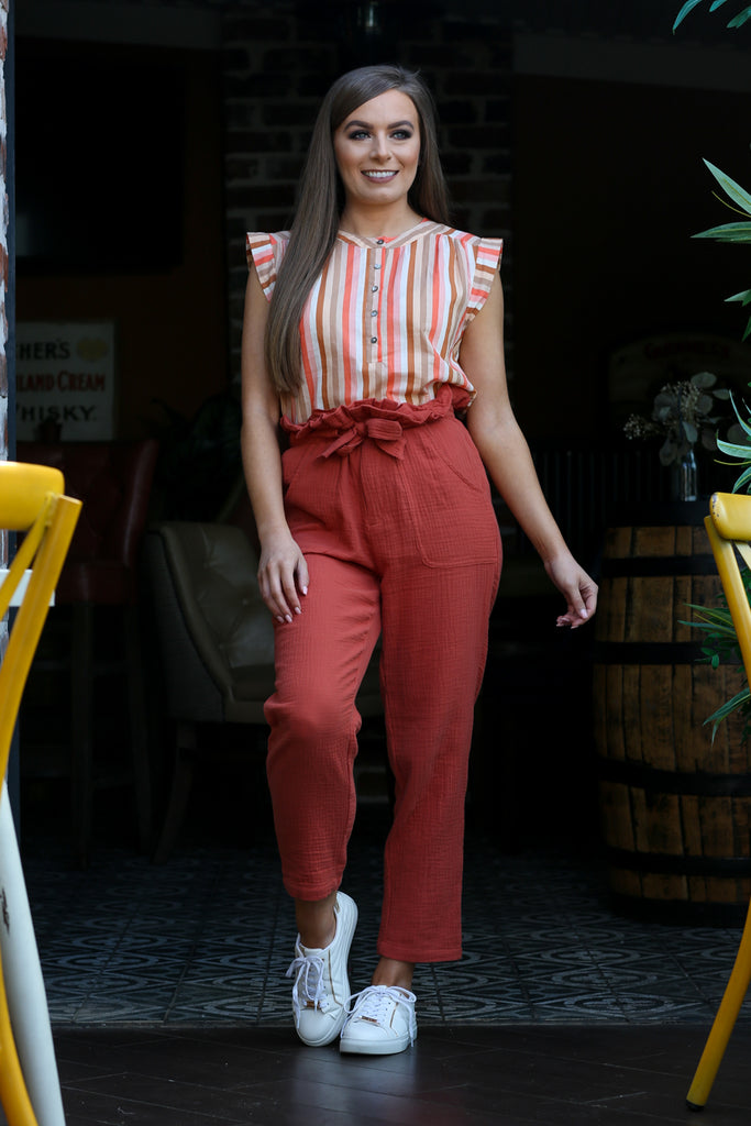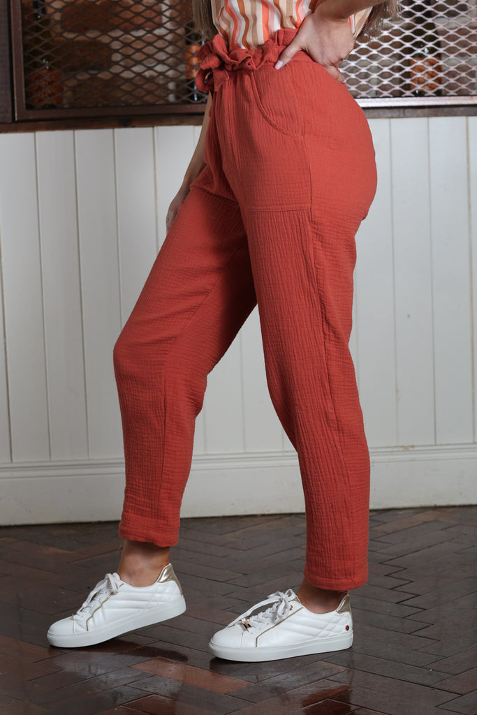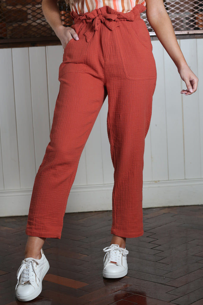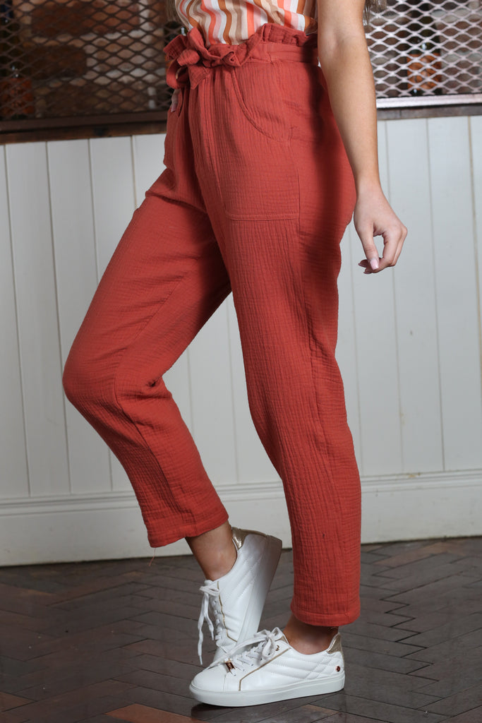 Terracotta paperbag style trousers with ruffled waistband and tie waist belt, side pockets and single pocket at the back. Straight leg.