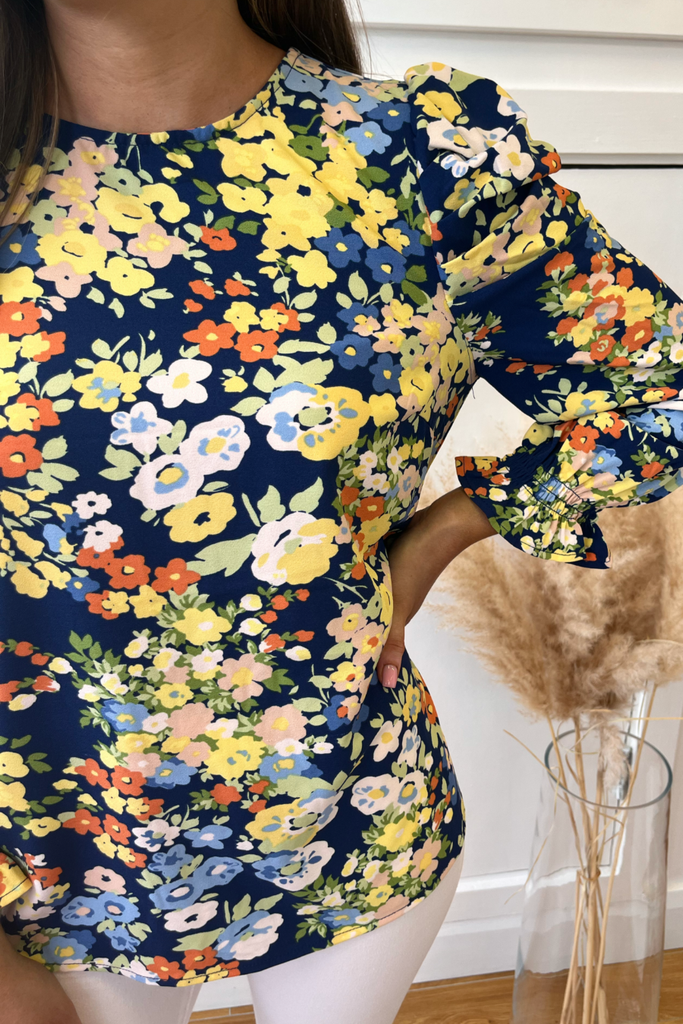 Navy top with vibrant floral print in yellow, orange, blue and white. Features a round neckline, 3/4 length sleeve with ruffled cuff and button closure at the back of the neck.