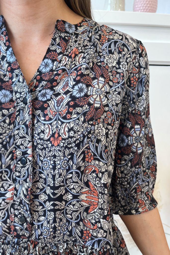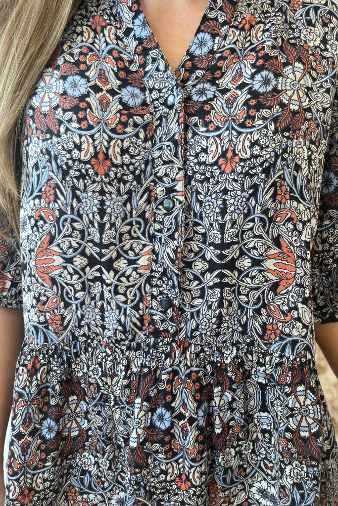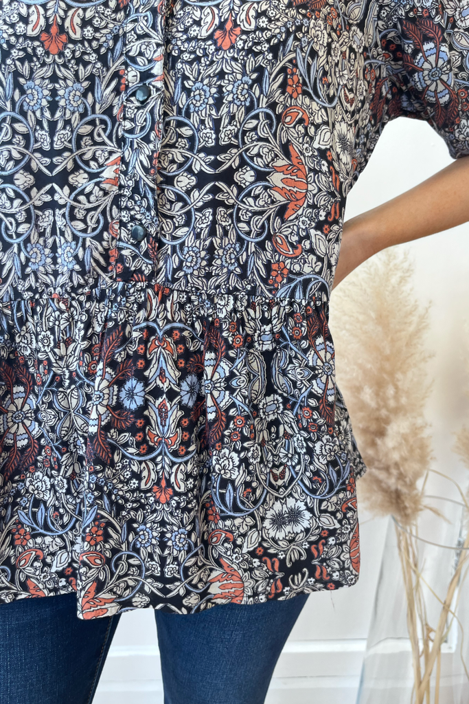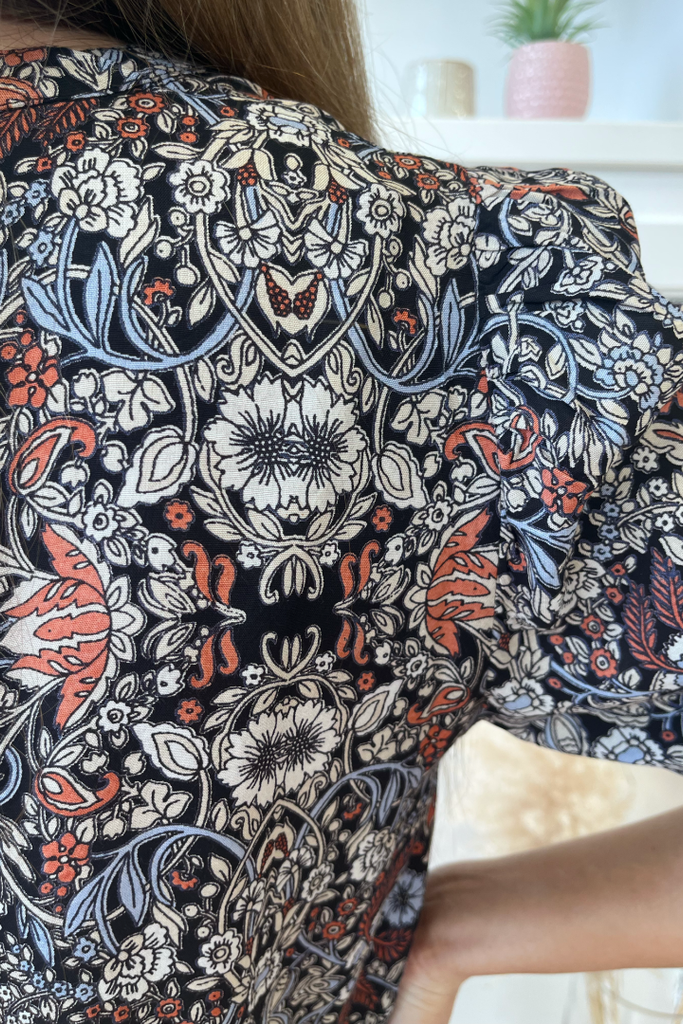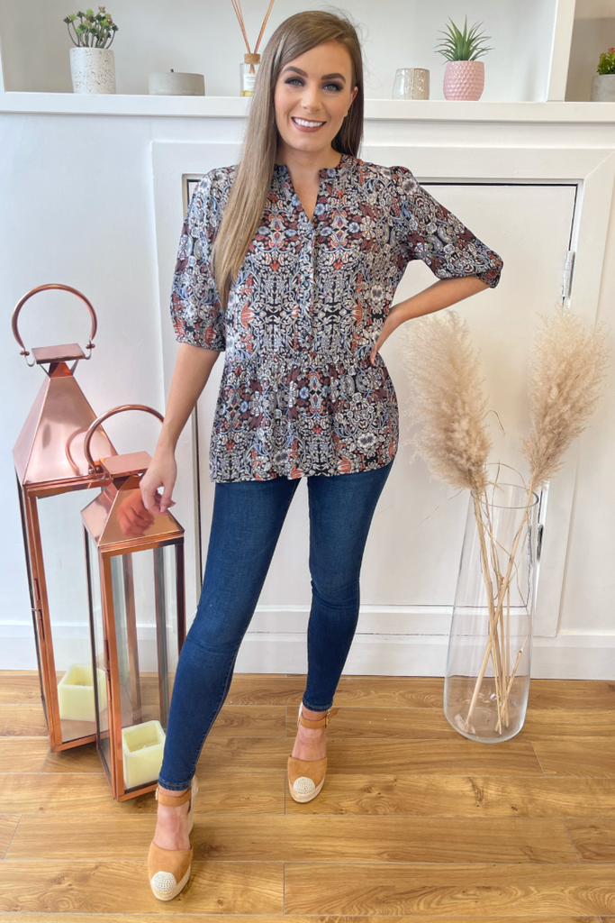Lightweight blouse with black base and floral print in powder blue, white and burnt orange. Features a V-neckline that has a button down front, peplum waist and roomy half sleeves with elasticated cuff.