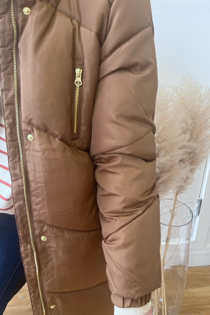Keeping you cosy this Autumn/Winter with our Toffee Longline Puffer Coat. Featuring a funnel neckline, full zip up front with snap fasten button closure and pockets on the sizes and chest. Full length sleeves have ribbed, fitted cuffs to help keep you warm when out and about.