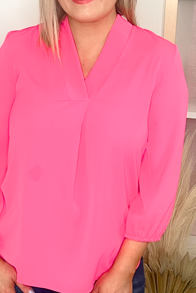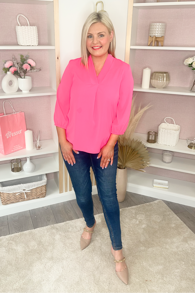 V-neck blouse with 3/4 sleeve with elasticated cuff. The body is soft and floaty with dipped hem