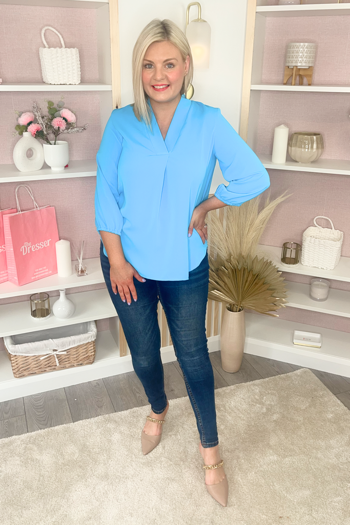 V-neck blouse with 3/4 sleeve with elasticated cuff. The body is soft and floaty with dipped hem
