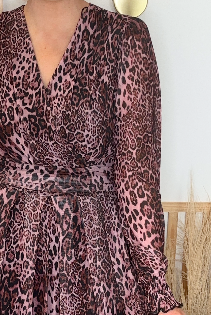 Wrap-style neckline in a fun pink animal print with ruched shapely waist