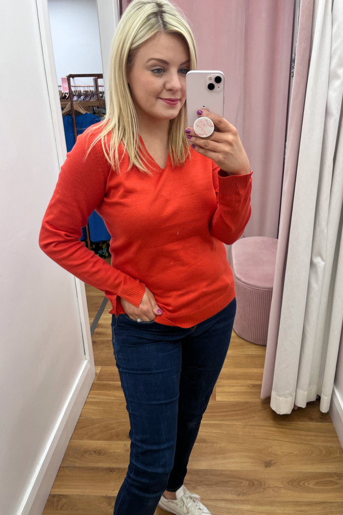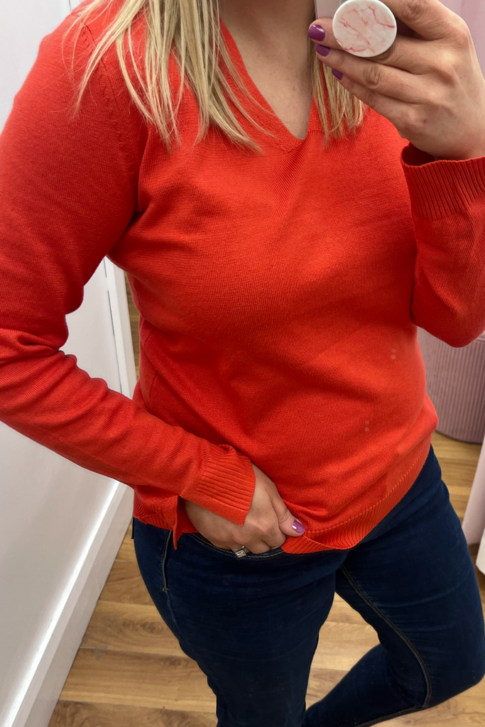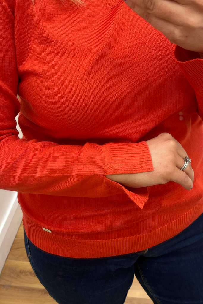 Light-weight jumper with V-neckline, ribbed cuffs and hemline. It features a slashed cuff for an extra pretty detail