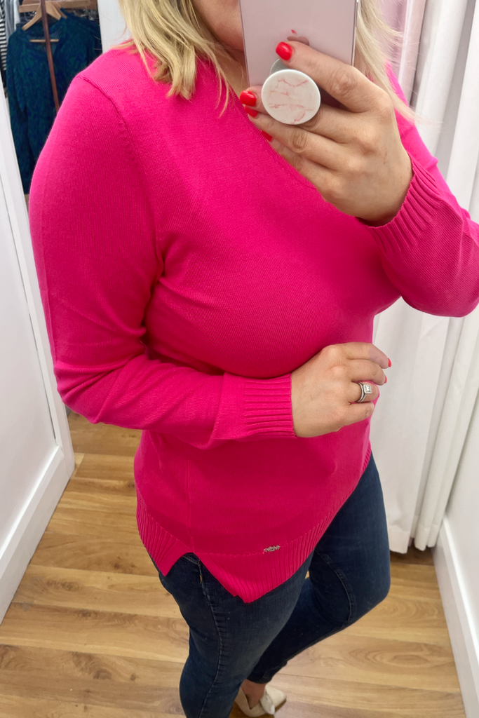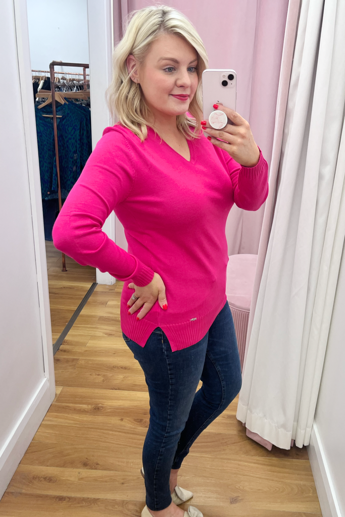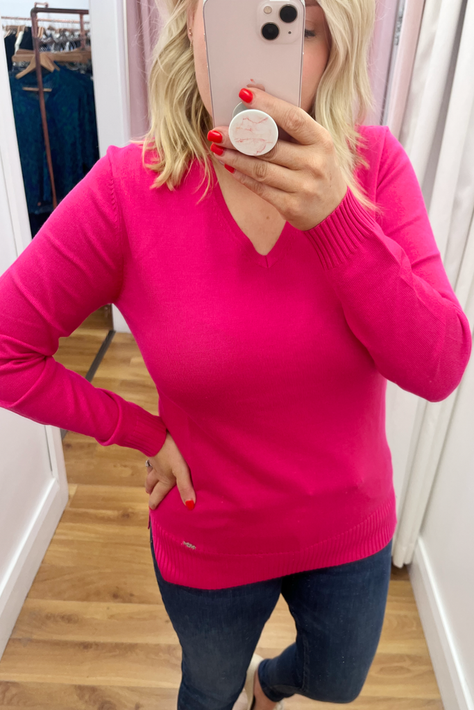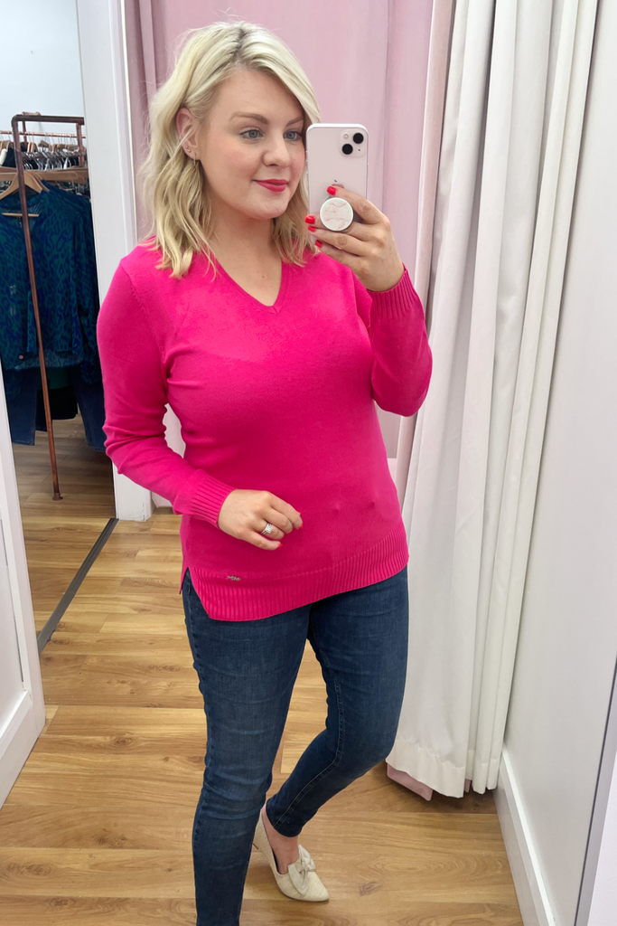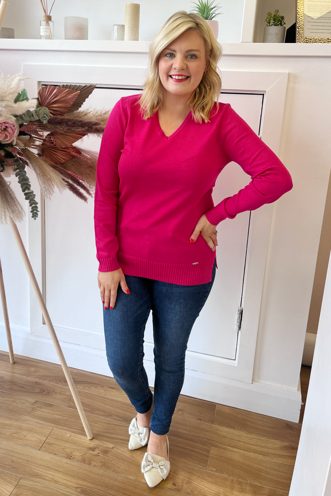 Light-weight jumper with V-neckline, ribbed cuffs and hemline. It features a slashed cuff for an extra pretty detail. Other colours available