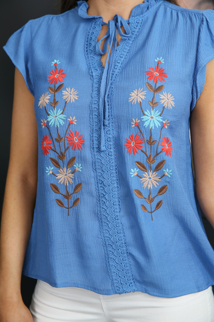 Lightweight top in cobalt blue with embroidered floral pattern in blue, red and taupe. Features a slightly raised V-neckline with tie detail and ruffle shoulder detail.