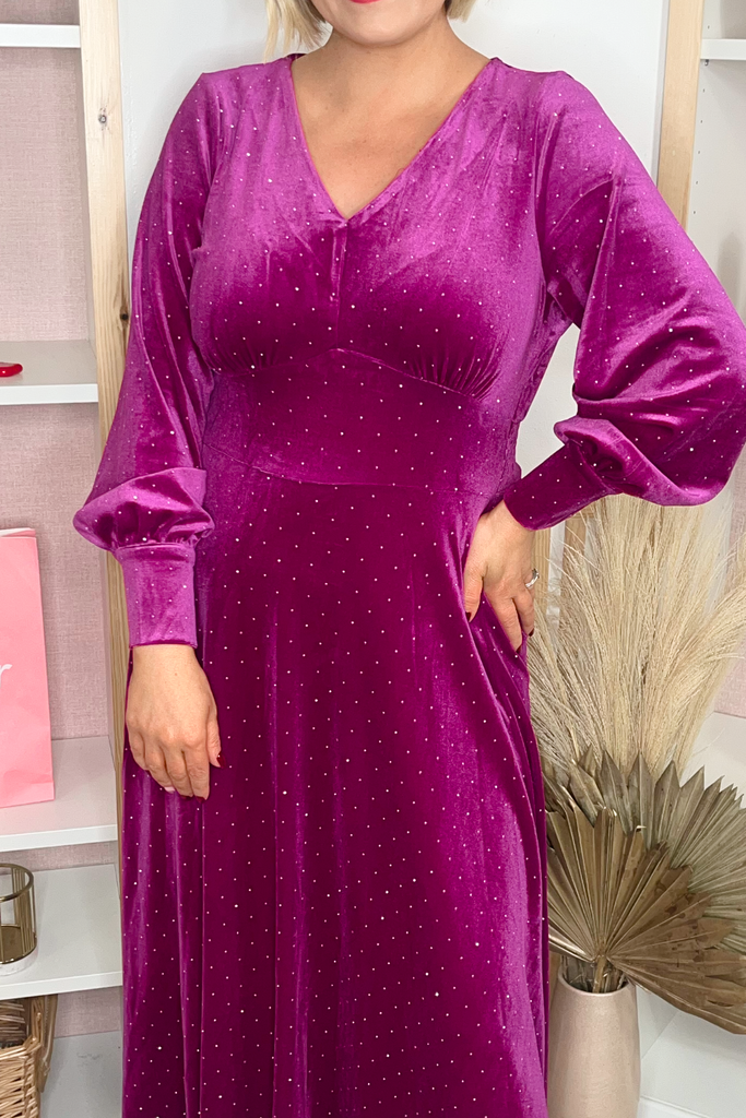 V-neck velvet dress with embellishment throughout. With full length sleeve and deep cuff with pearl buttons. The perfect style for your occasions this Winter!