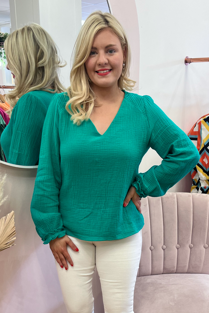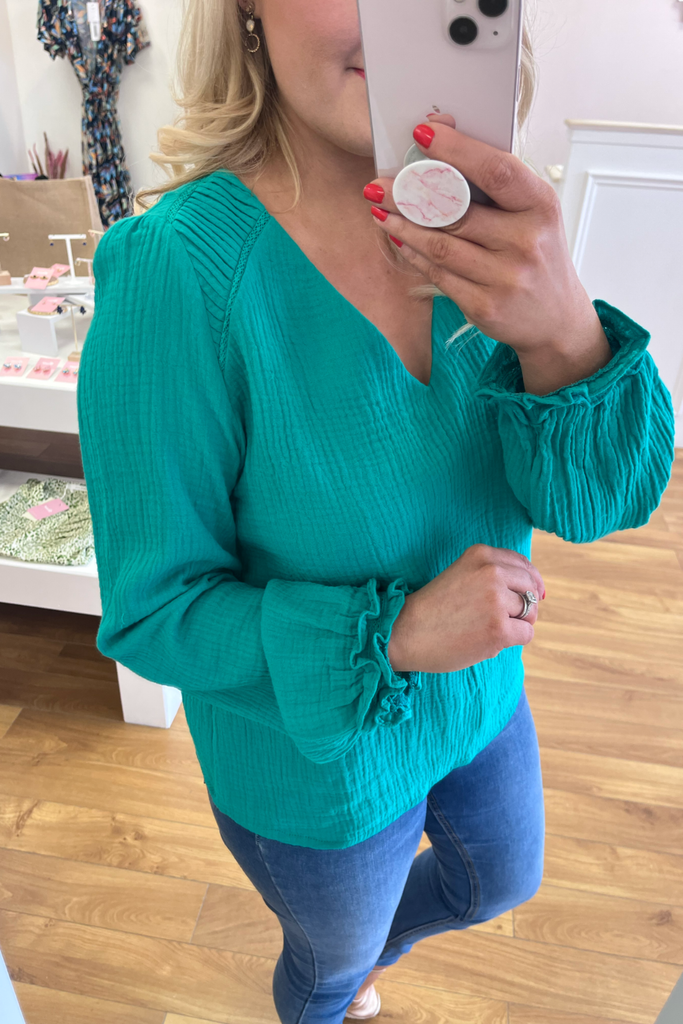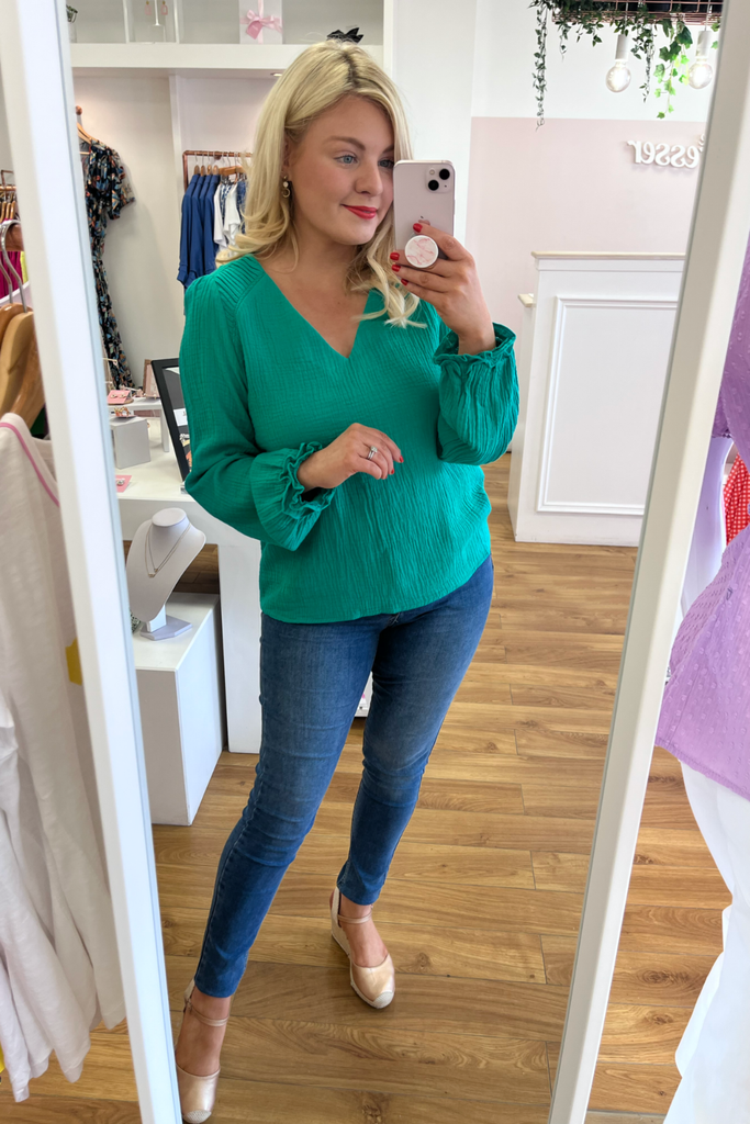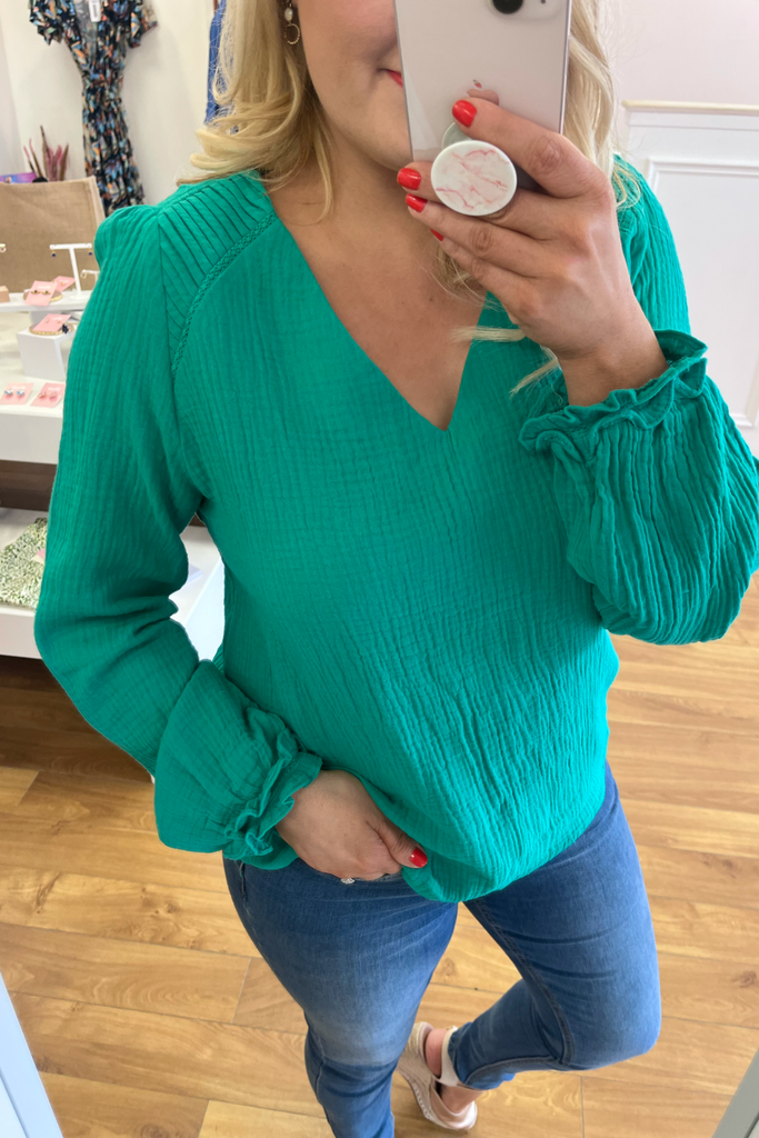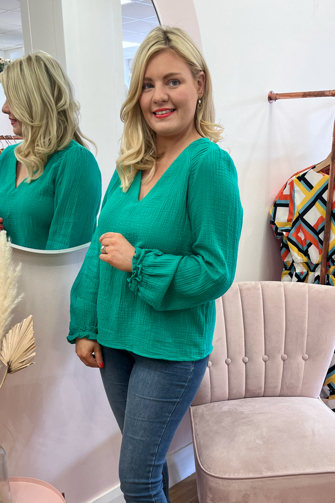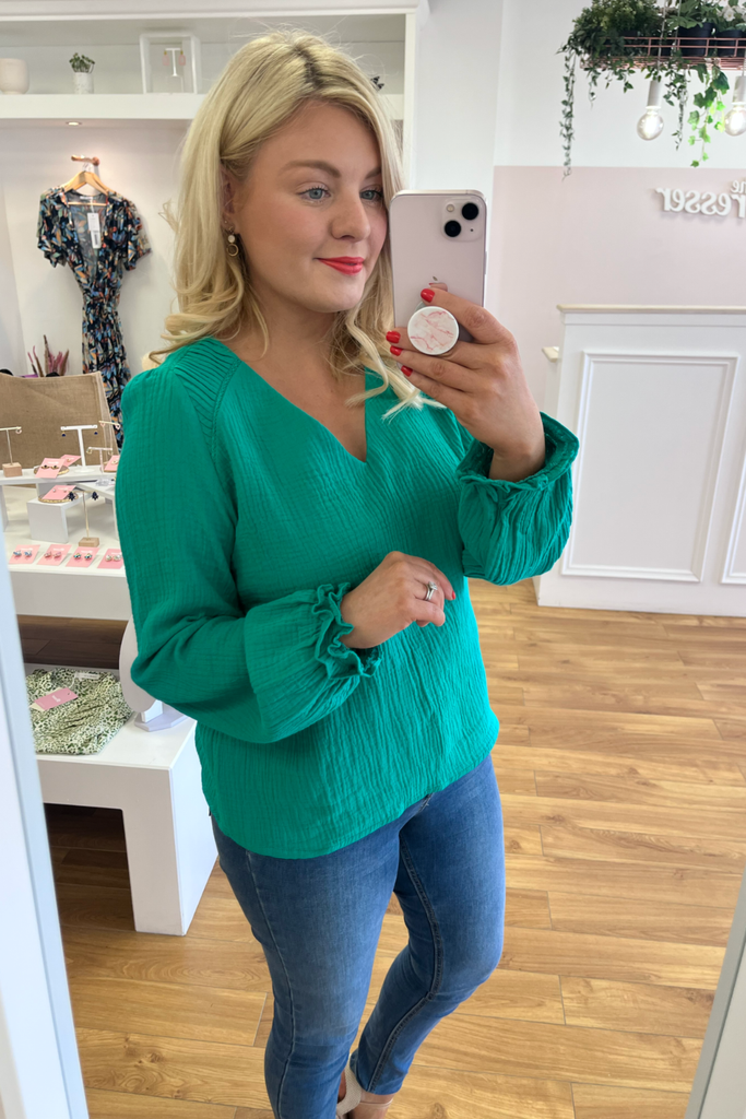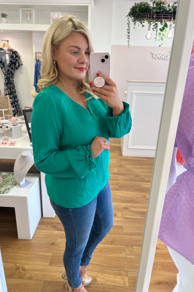 Cotton gauze V-neck blouse in a vibrant green. Features full length bell sleeves with elasticated frilled cuff and pretty shoulder detail