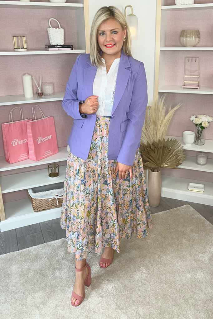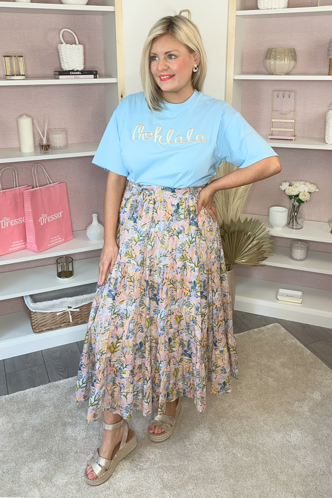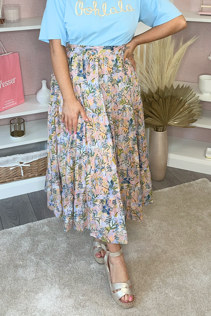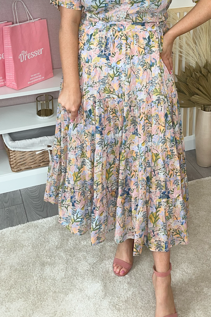 Printed all over in a pretty pastel print. With tiered skirt and elasticated waistband to the back. This style is lined.  Perfect with a simple tee or blouse