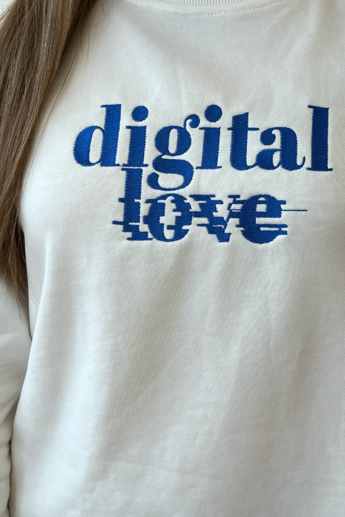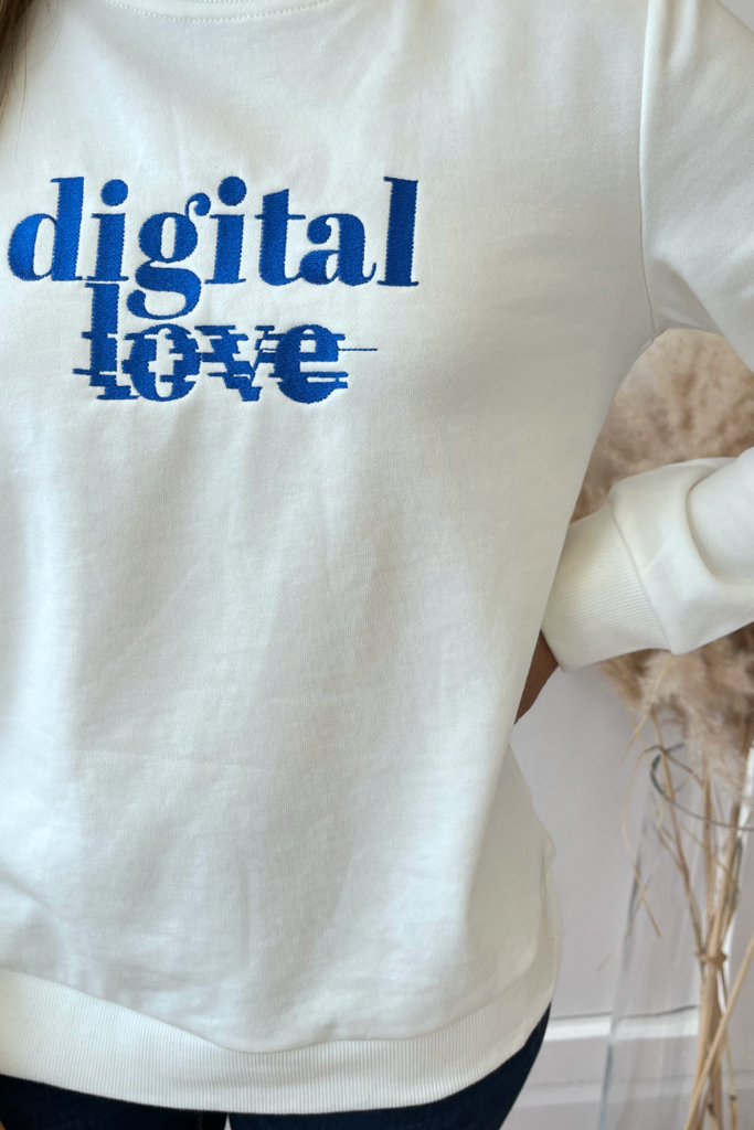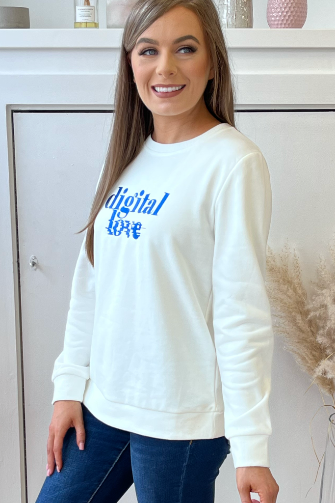 White sweatshirt with 'Digital Love' motif in cobalt blue. Perfect for those cooler days this sweatshirt has a round neckline, full length sleeves and roomy bodice.