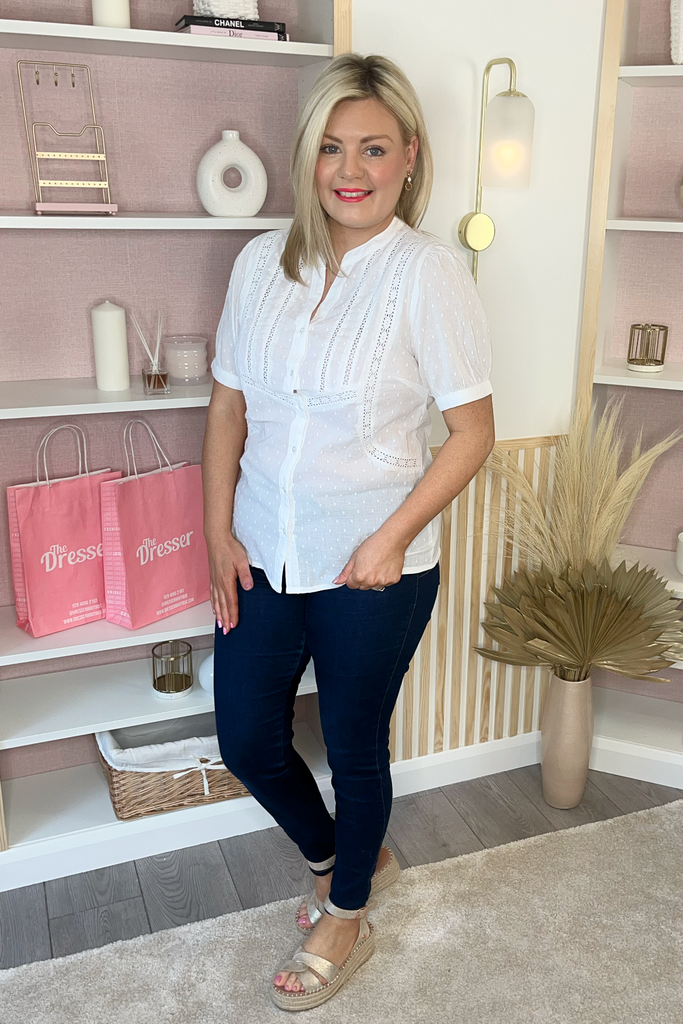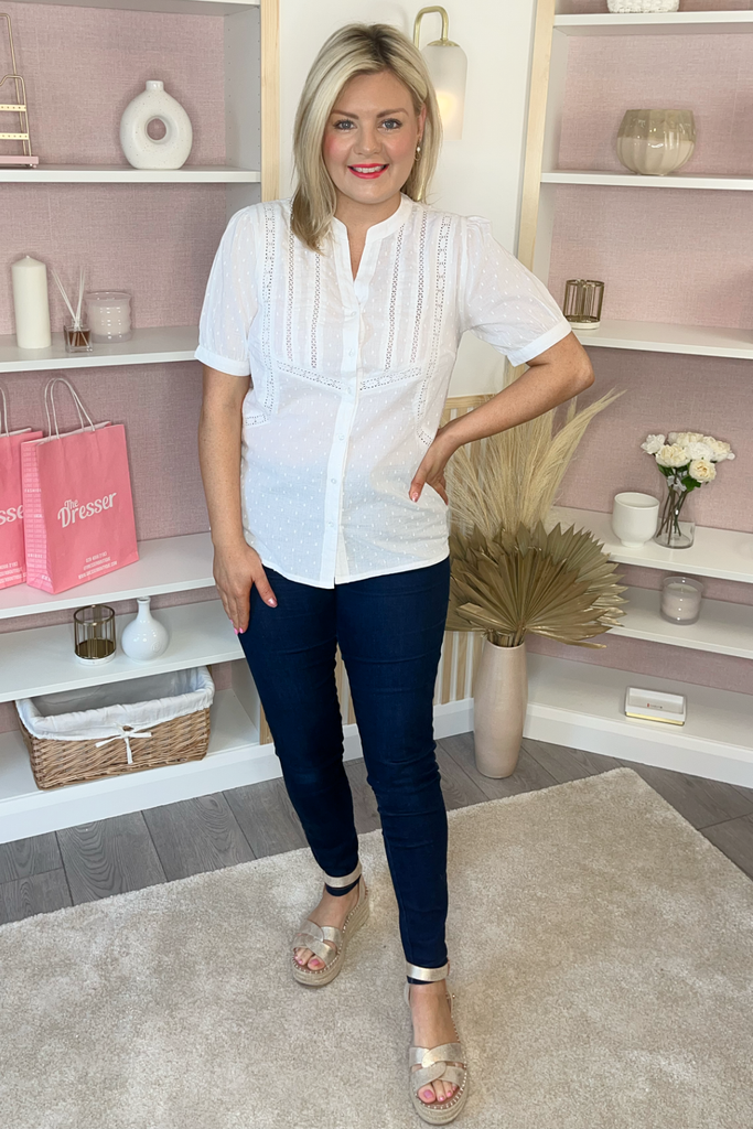 Soft white semi-sheer blouse with V-neckline, broderie anglaise and buttoned front. With half sleeve with fitted cuff. Perfectly paired with denims and a trainer, wedge or heel.