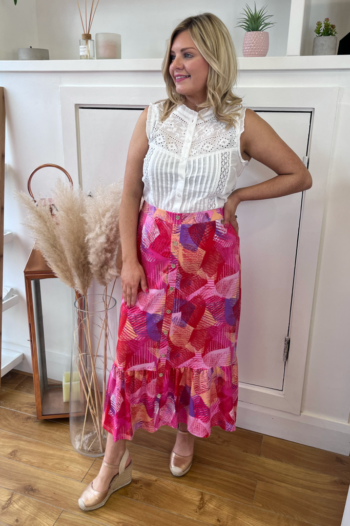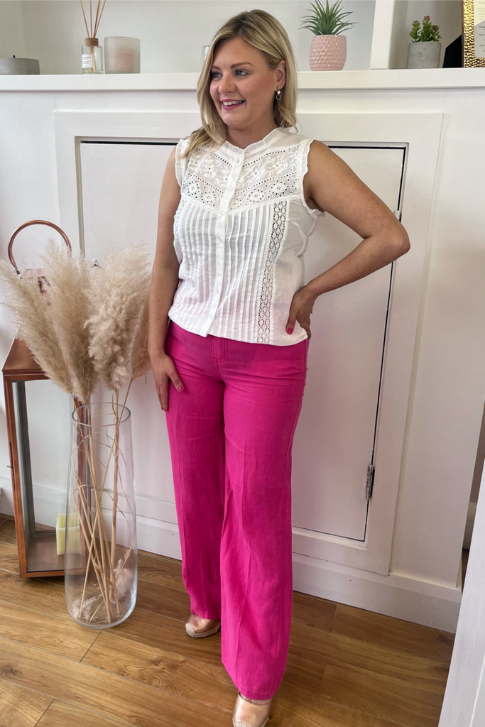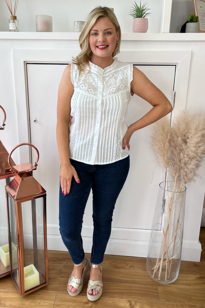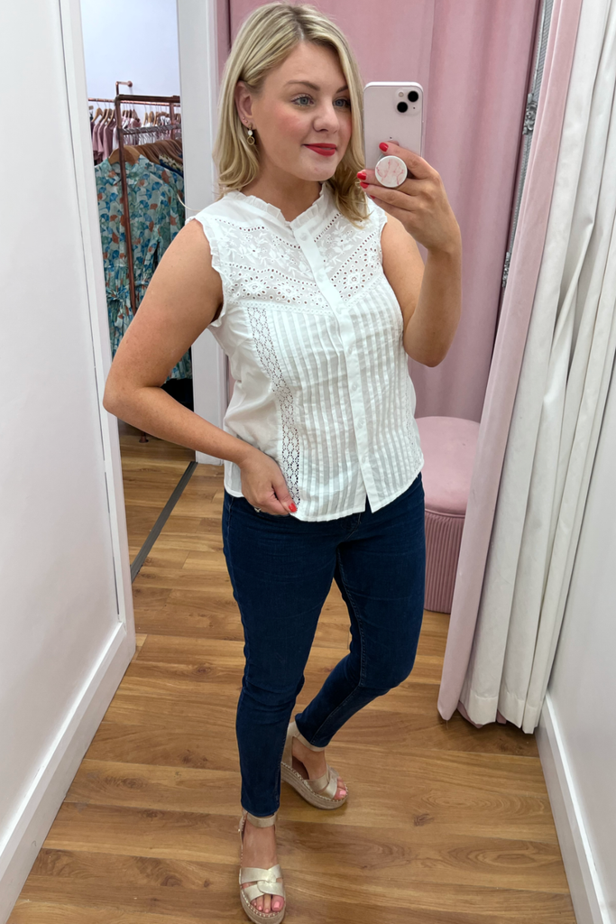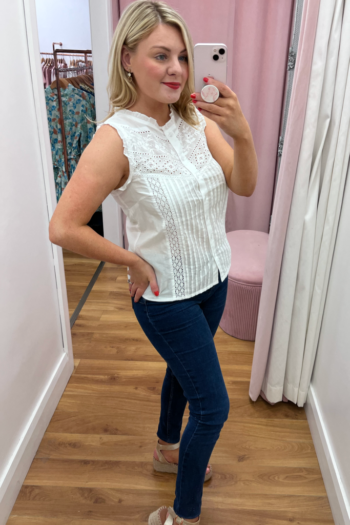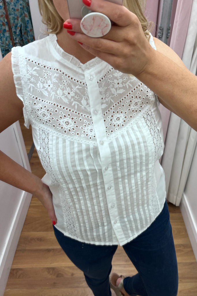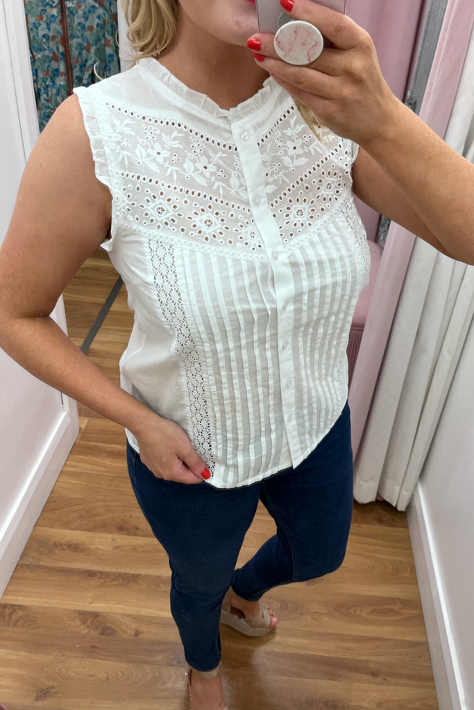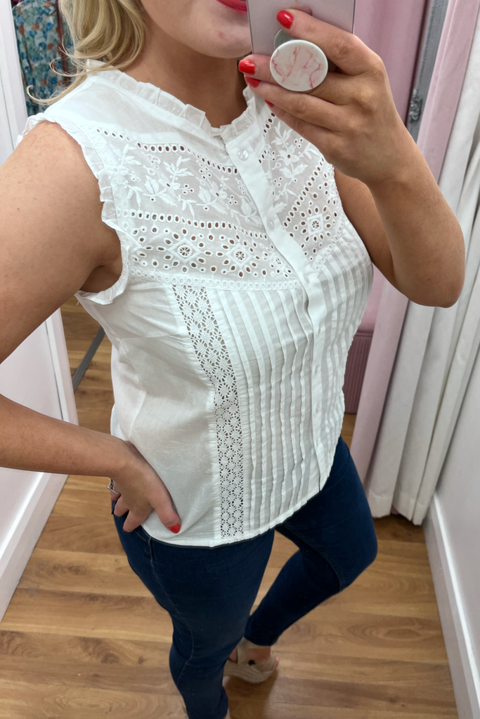 Crisp white cotton sleeveless shirt with broderie anglaise and delicate ruffle detail. Perfectly paired with denims and a trainer, wedge or heel.