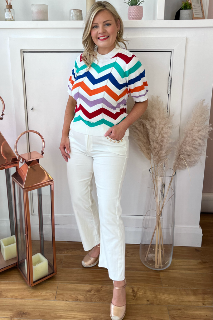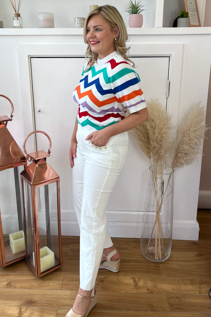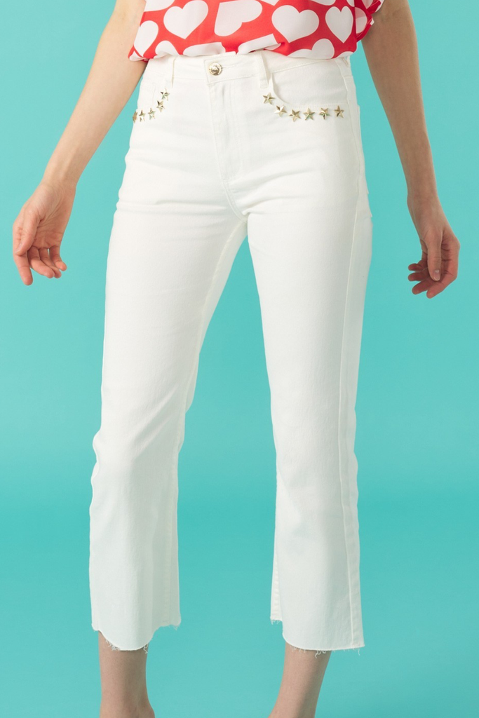 High waisted white jeans with straight cropped leg. With gold star studded trim pocket. With zip and button fastening
