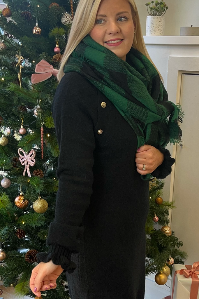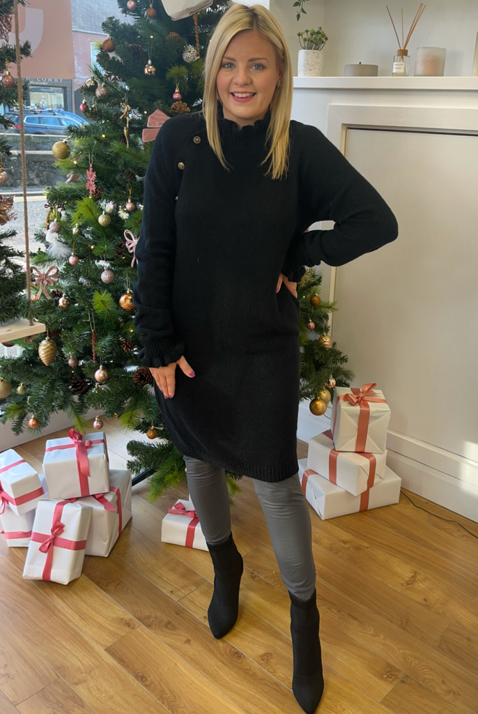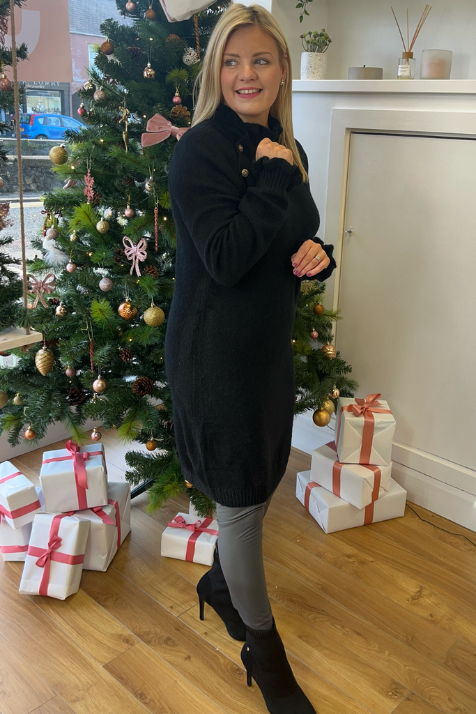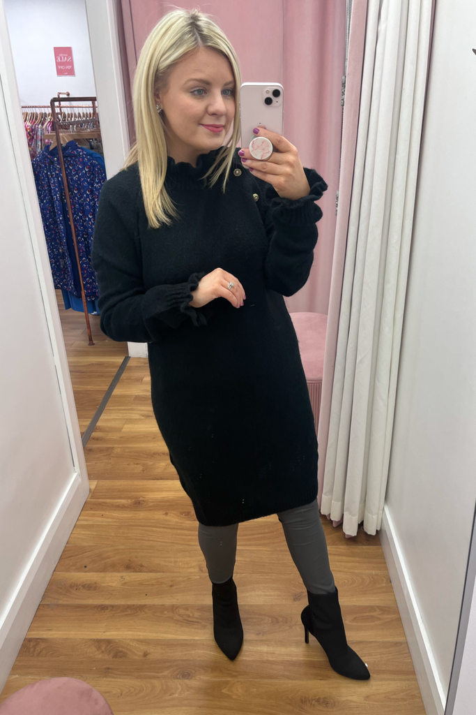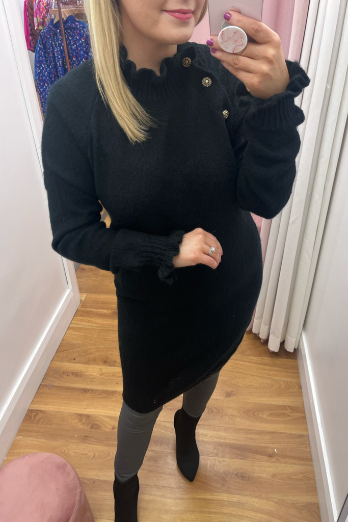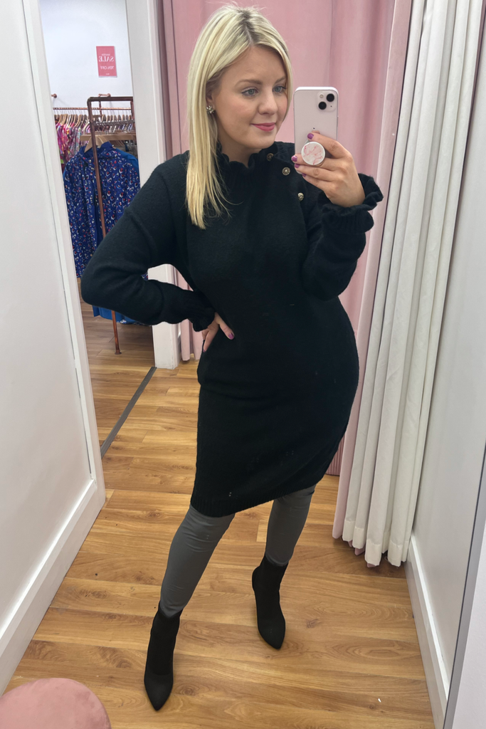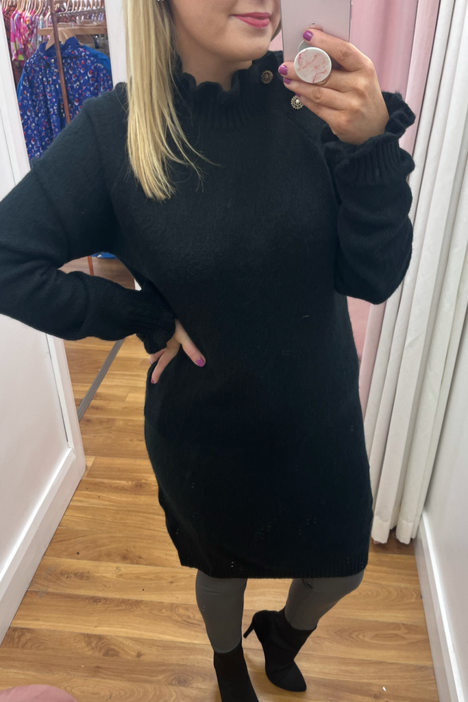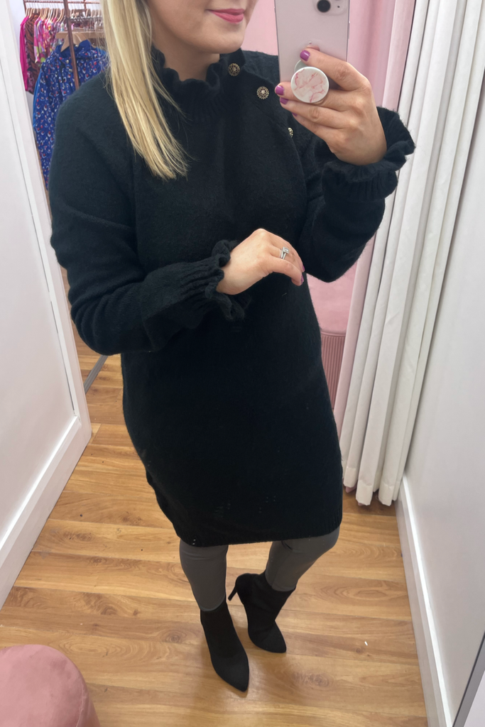 Mid-weight midi length sweater dress with raised ruffled neckline and full length sleeves with ruffled cuffs. Also features gold button detailing on one side. Pair with tights or leather leggings and boots!