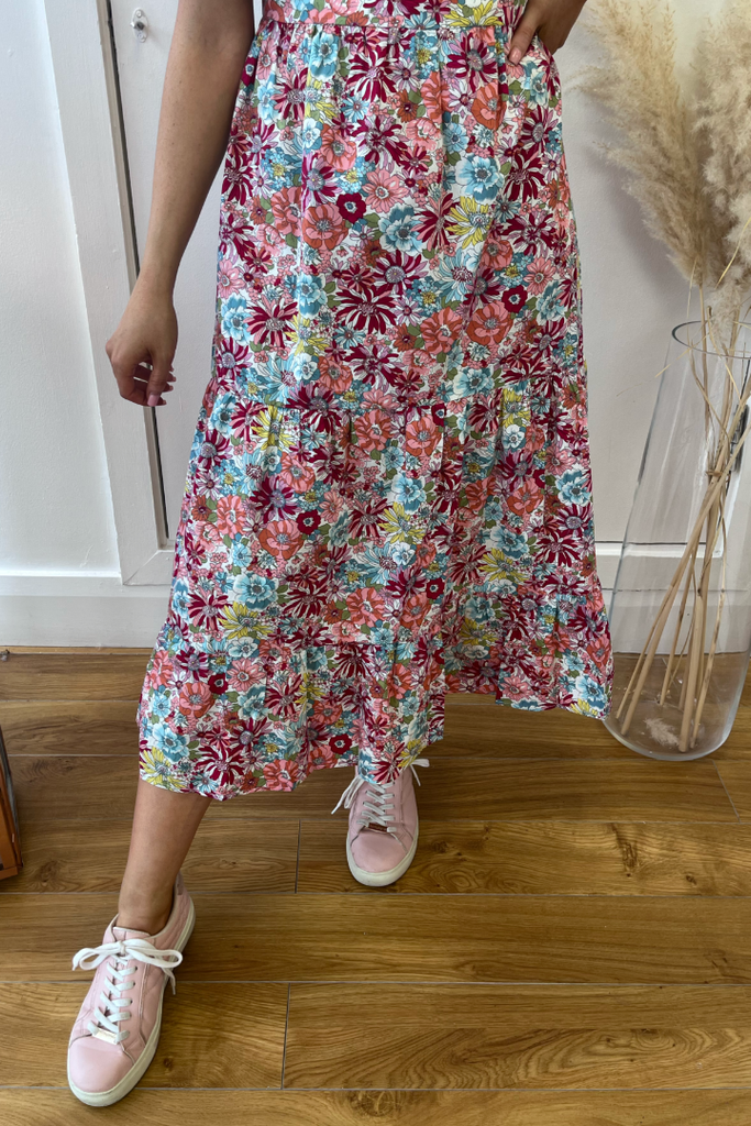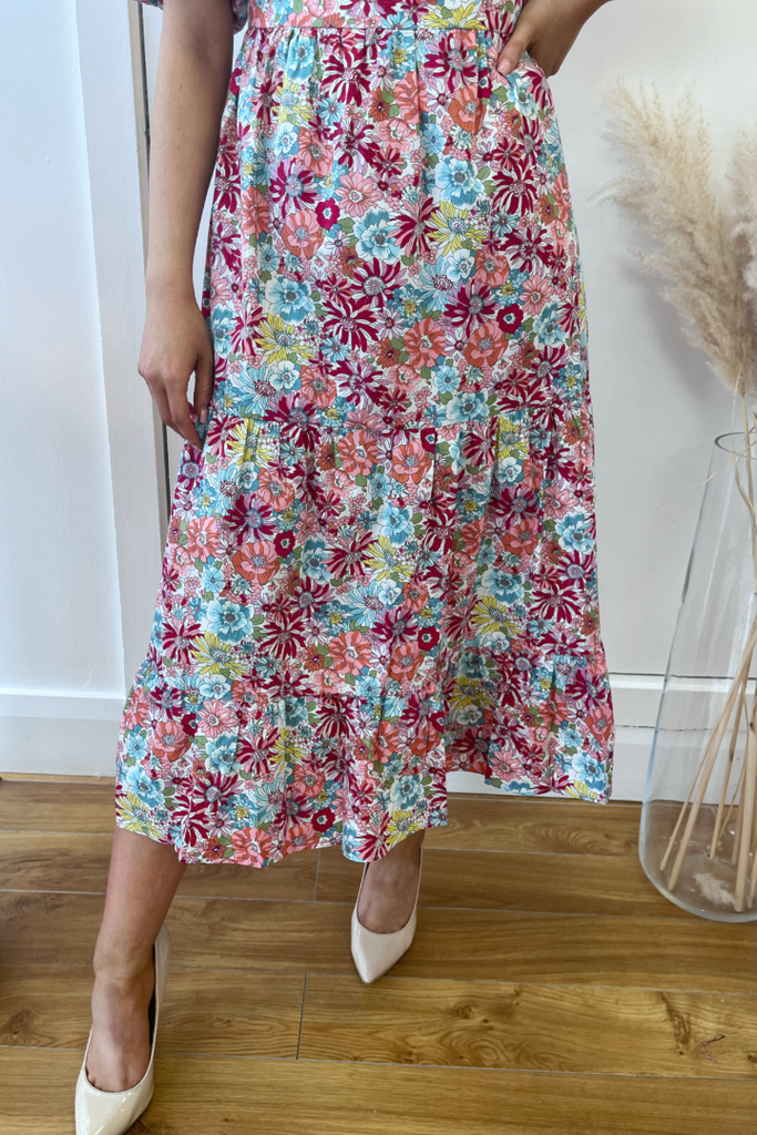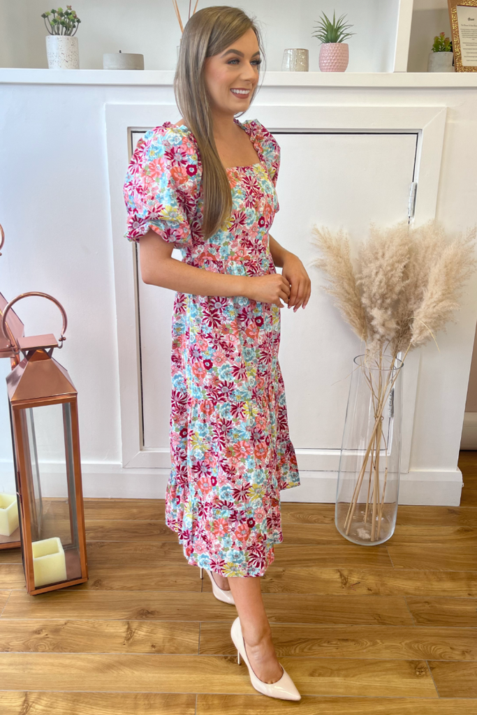 Stunning midi dress in multicoloured floral print. Features a square neckline, half puff sleeve with elasticated shoulder and cuff and dropped hem. Concealed zip closure on the back and lined body.
