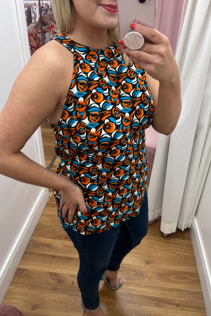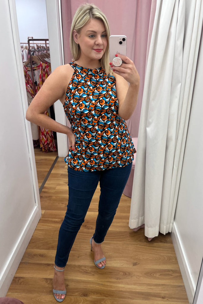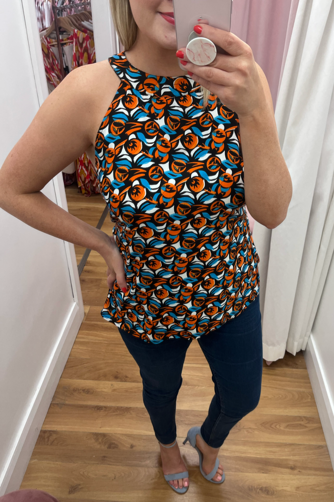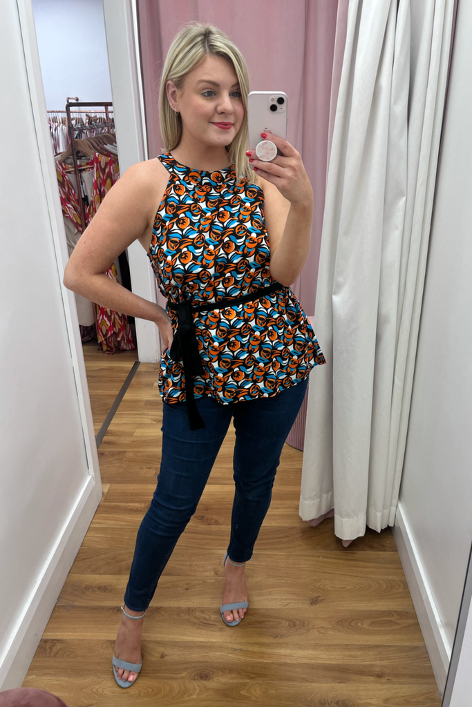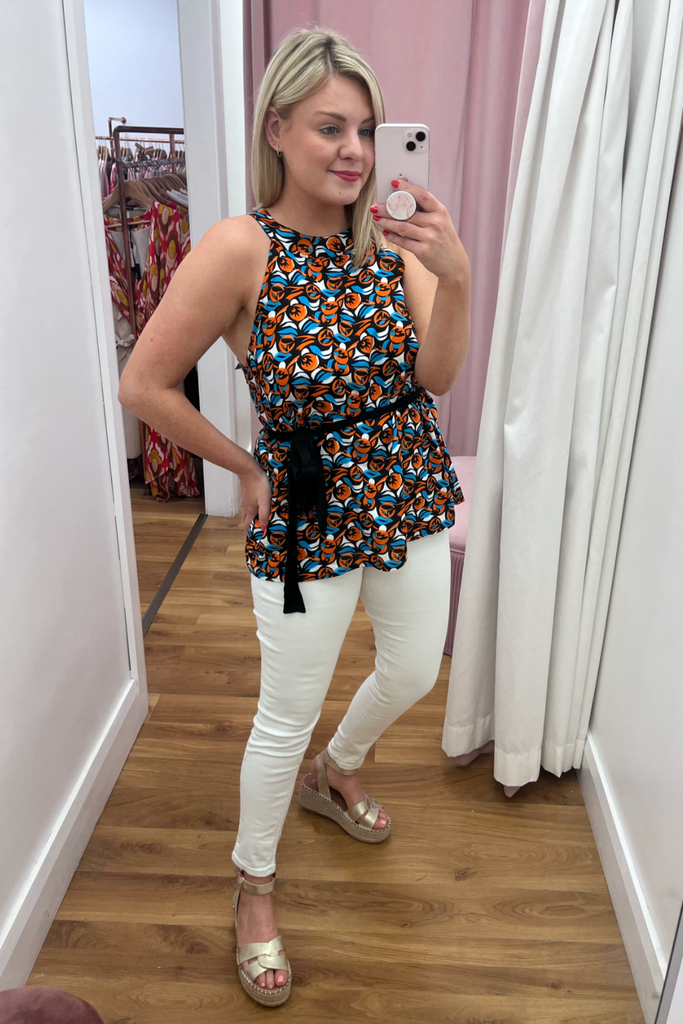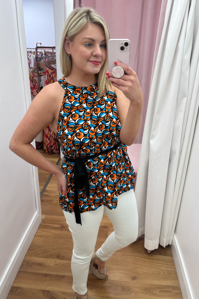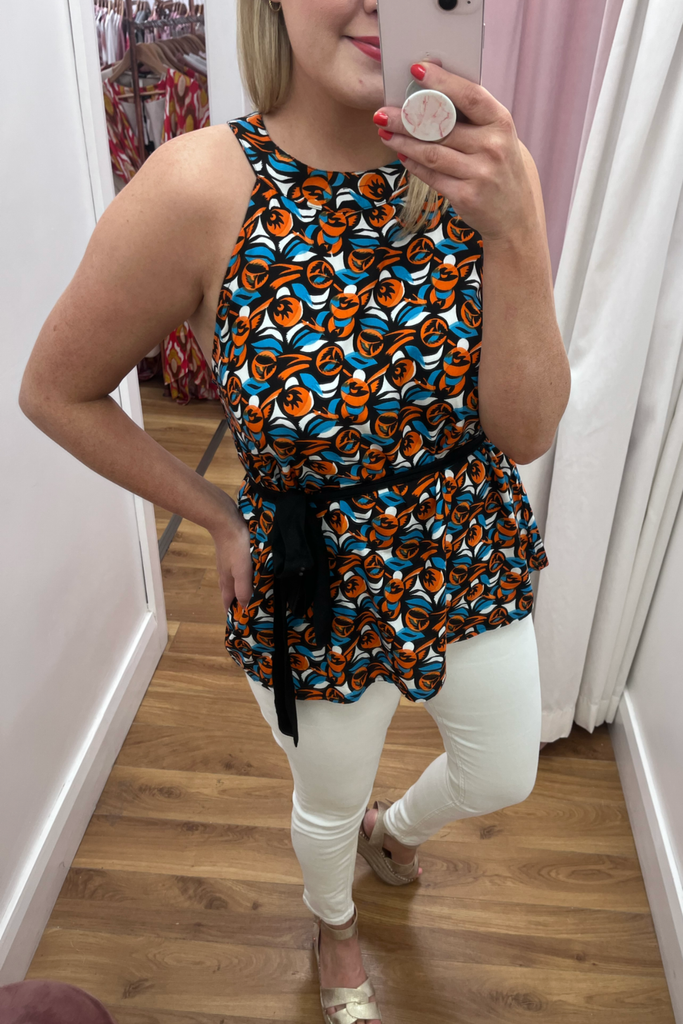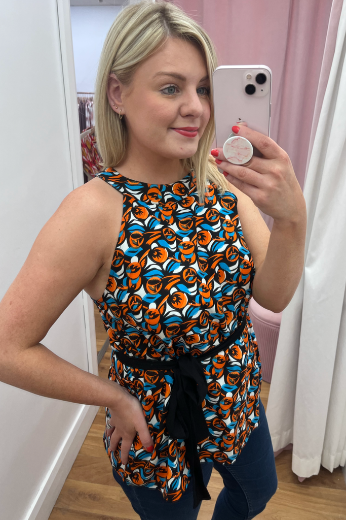 In a vibrant mix of bold blue and orange, with round neckline and contrasting black tie belt. The belt can be tied to the back or front. The perfect dressy/casual style for all year round with white, blue or darker shades!