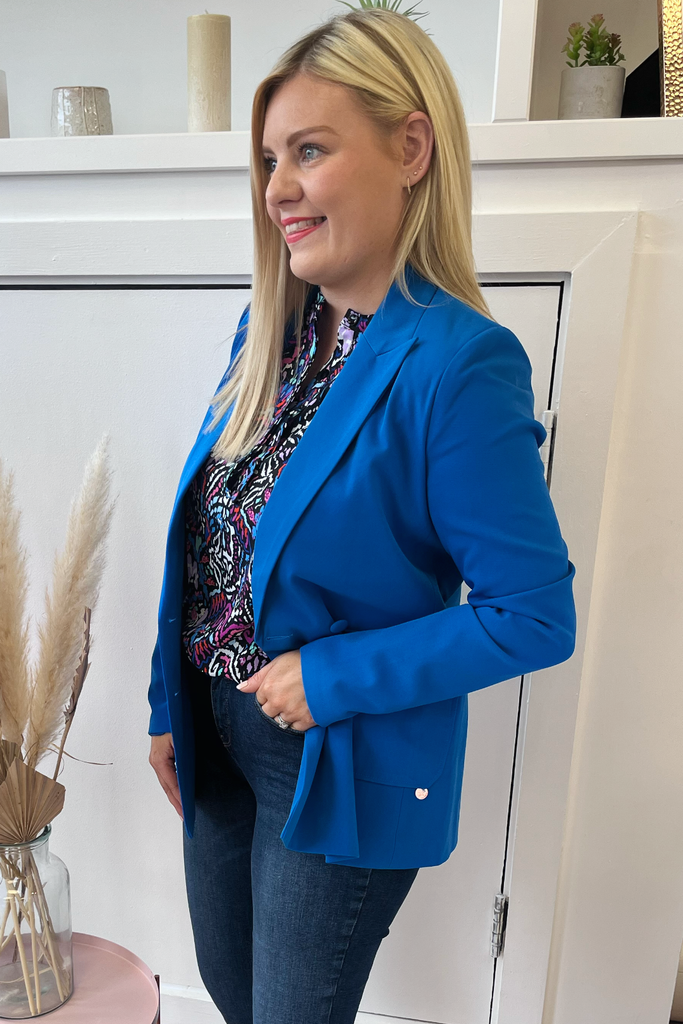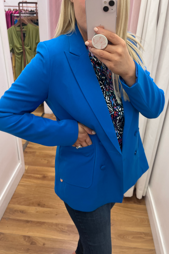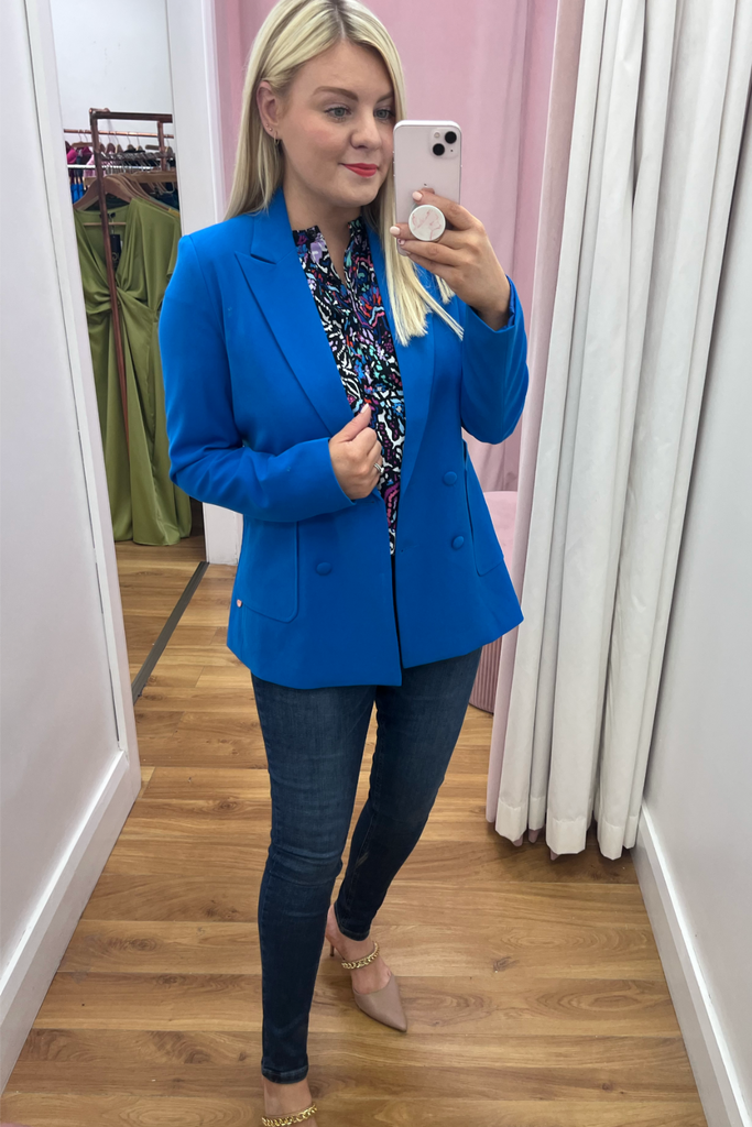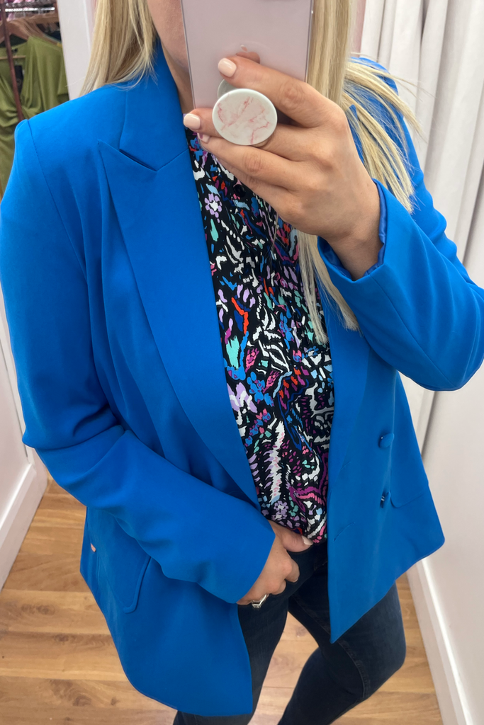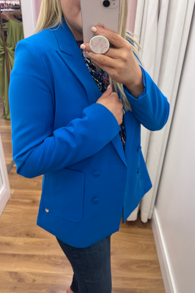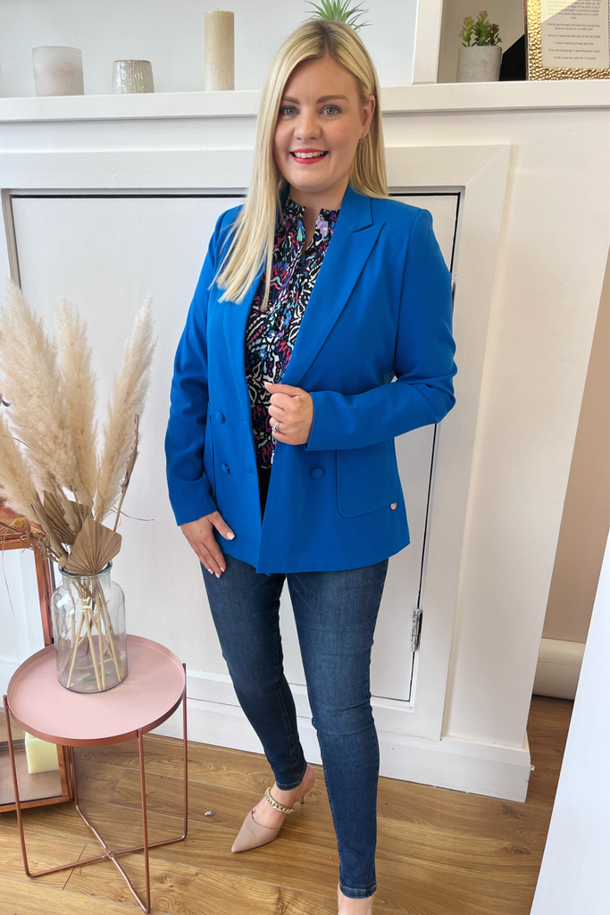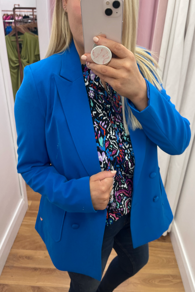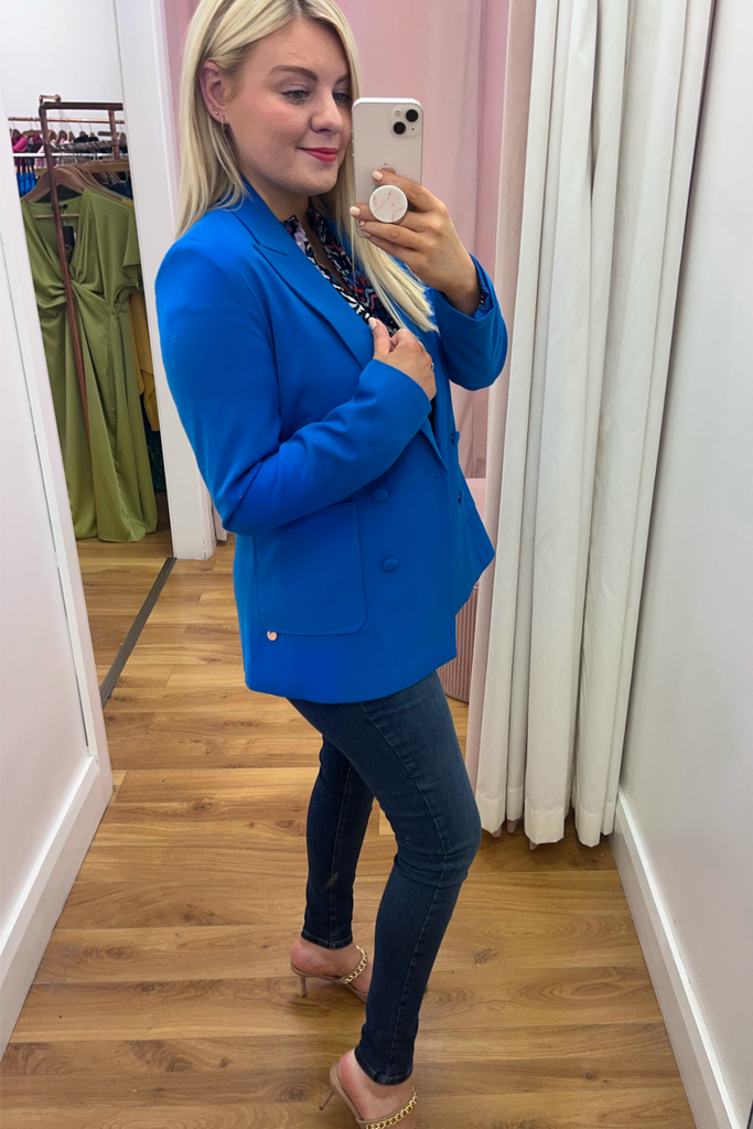 Vibrant blue longline blazer with lapel, pockets and double buttons. A stylish blazer that is easy to combine with any jeans or dresses, perfect for your occasion dress or casual outfit.