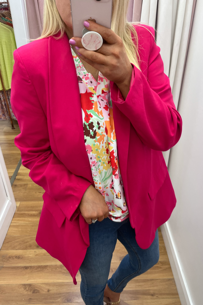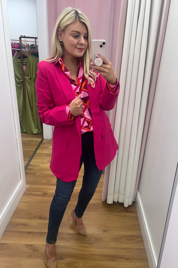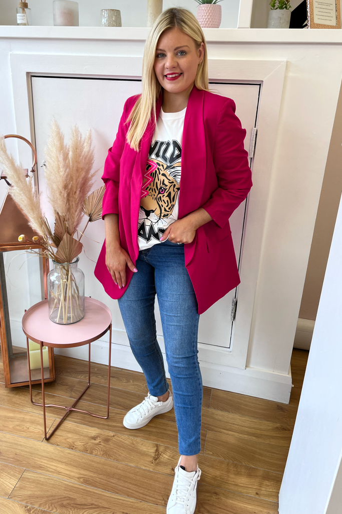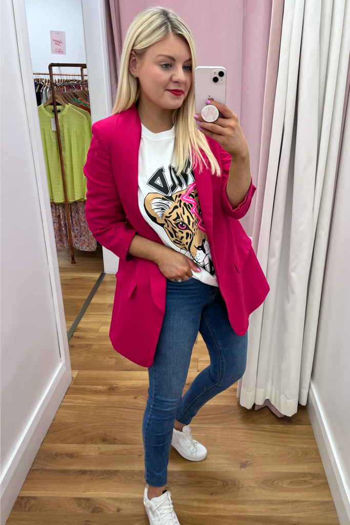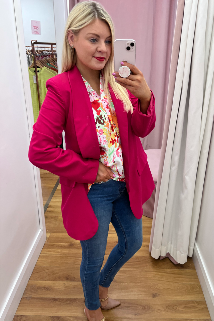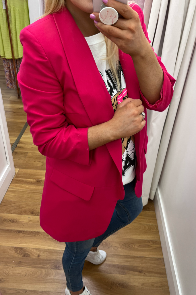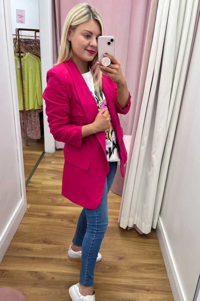 Vibrant fuchsia pink oversized longline blazer with slim lapel and envelope pockets. A stylish blazer that is easy to combine with any jeans or dresses, perfect for your occasion dress or casual outfit.