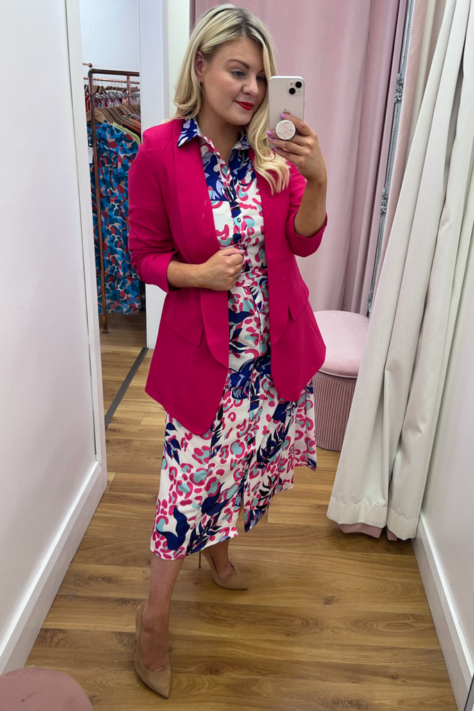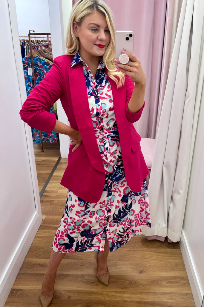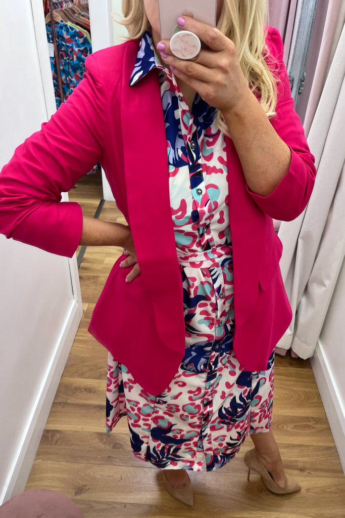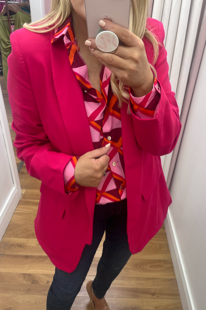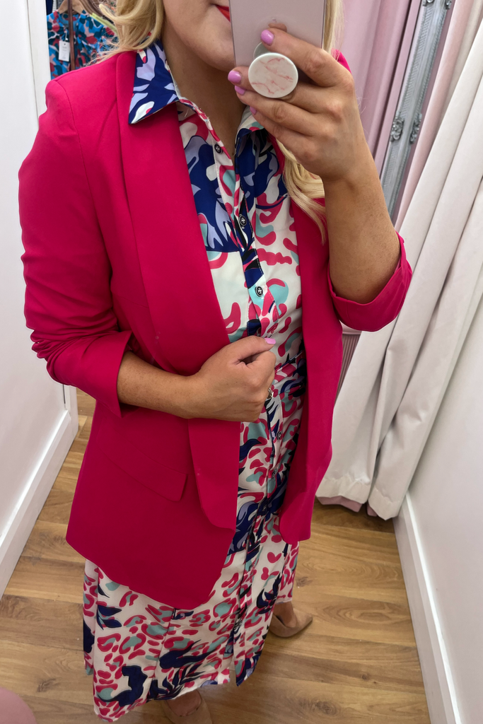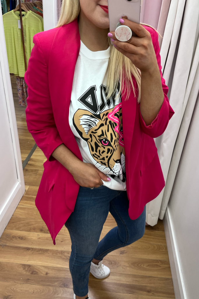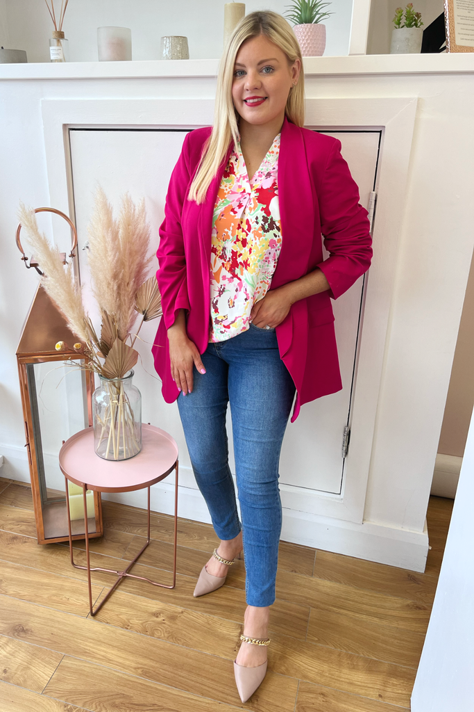 Vibrant fuchsia pink oversized longline blazer with slim lapel and envelope pockets. A stylish blazer that is easy to combine with any jeans or dresses, perfect for your occasion dress or casual outfit.